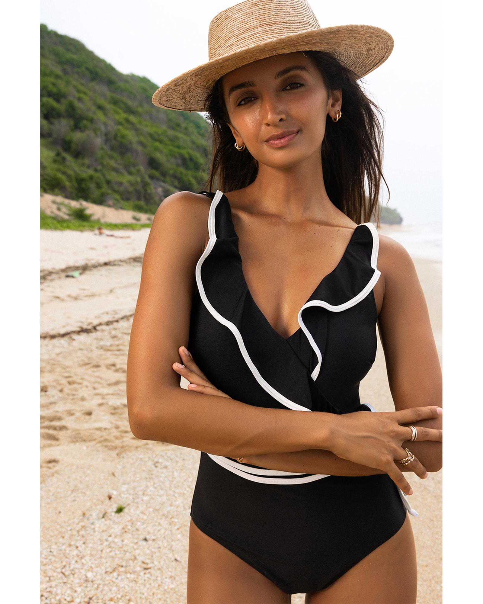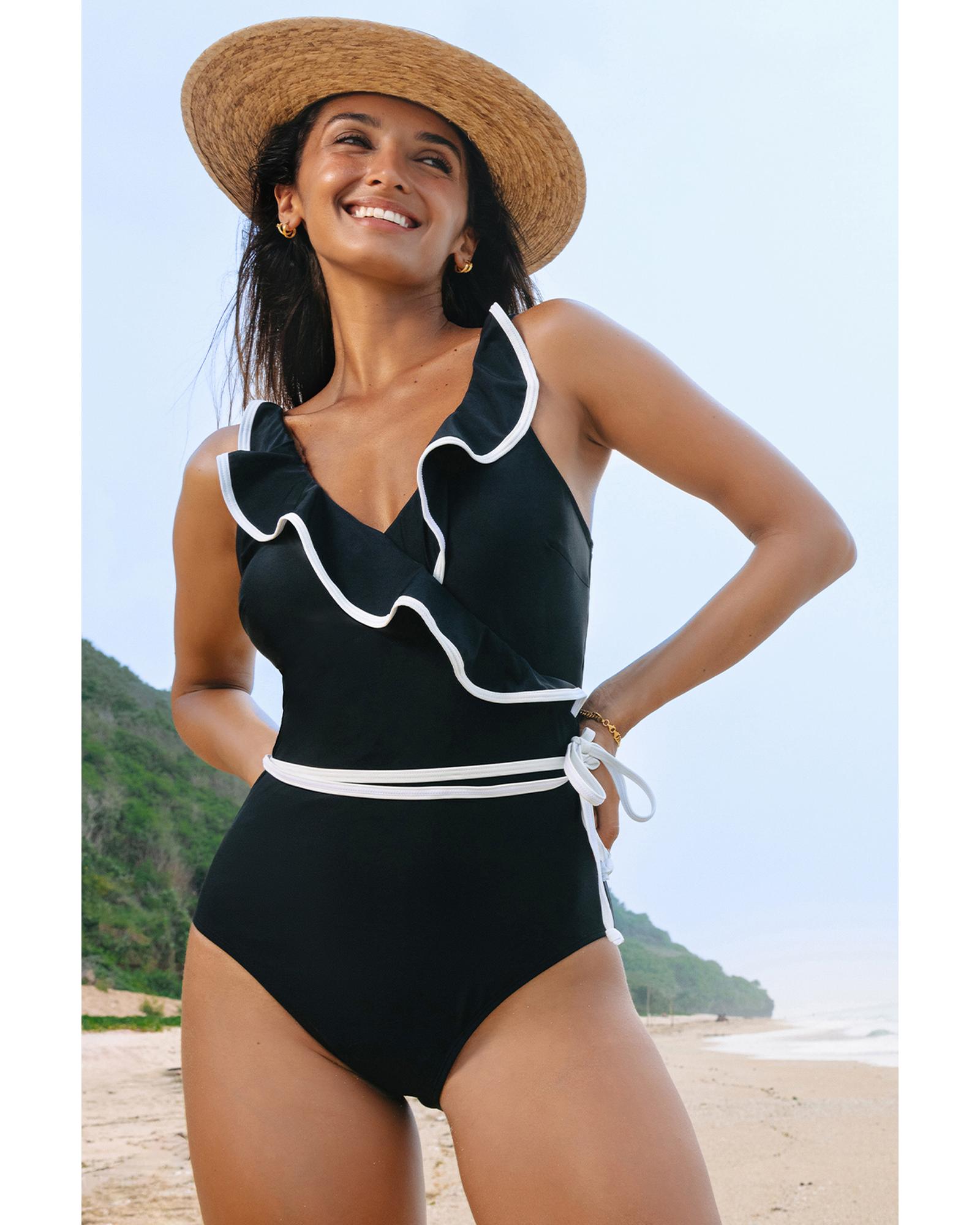 Black Color Contrast Ruffled Wrap V Neck Swimsuit – M