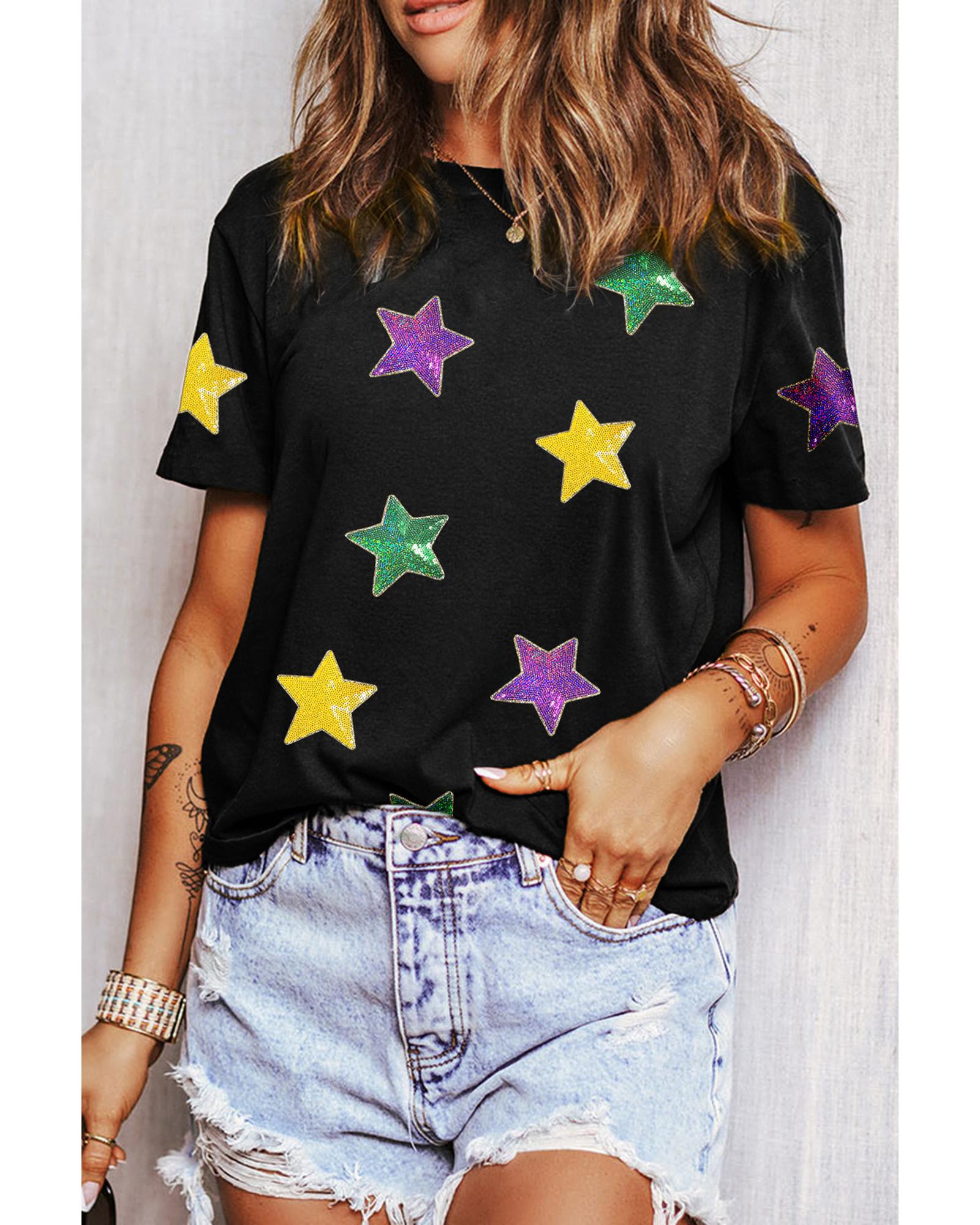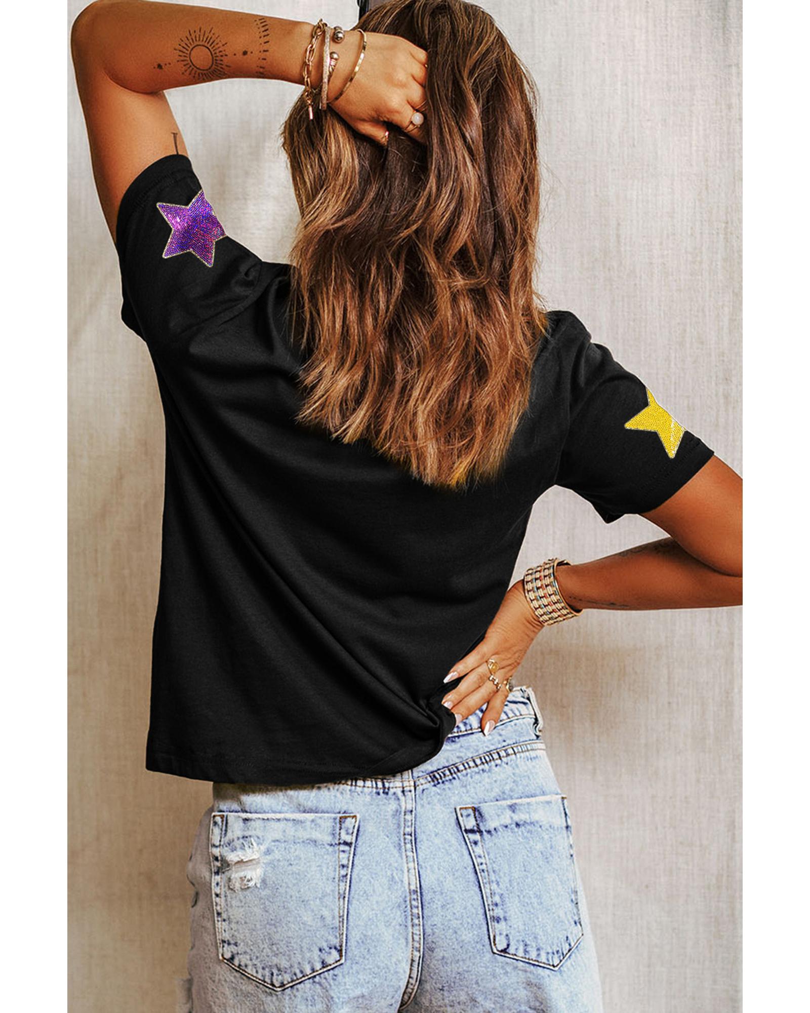 Black Colorful Sequin Stars Patched Relaxed T Shirt – S