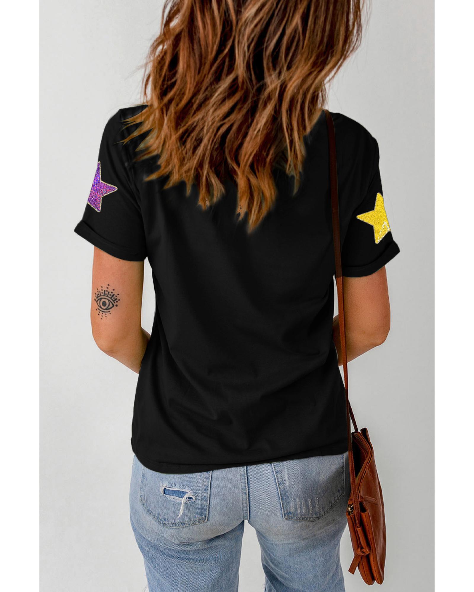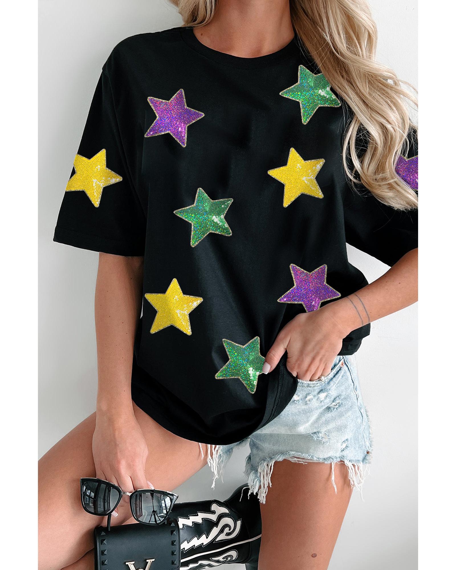 Black Colorful Sequin Stars Patched Relaxed T Shirt – XL