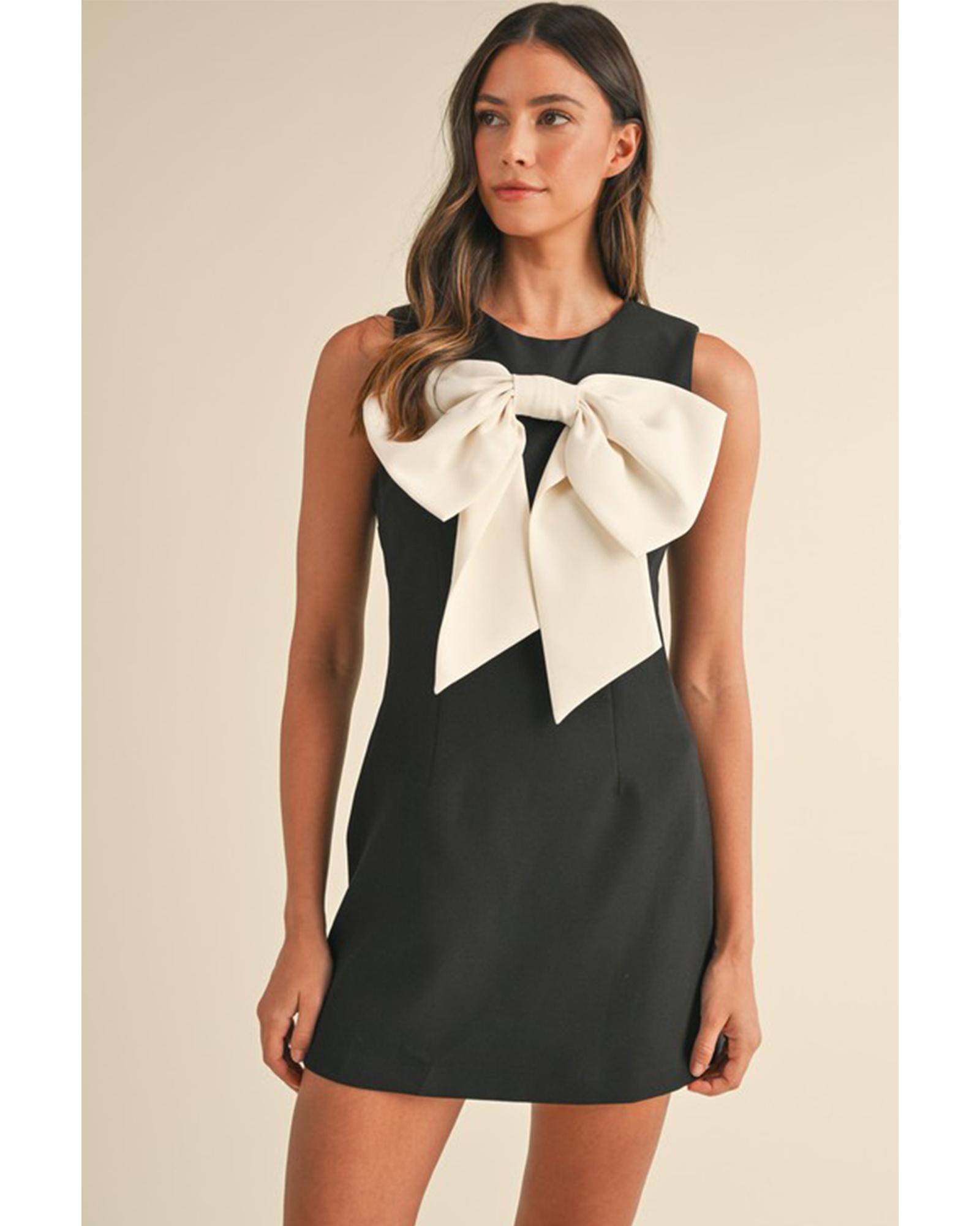 Black Contrast Bowknot Applique Crew Neck Sleeveless Mini Dress – L