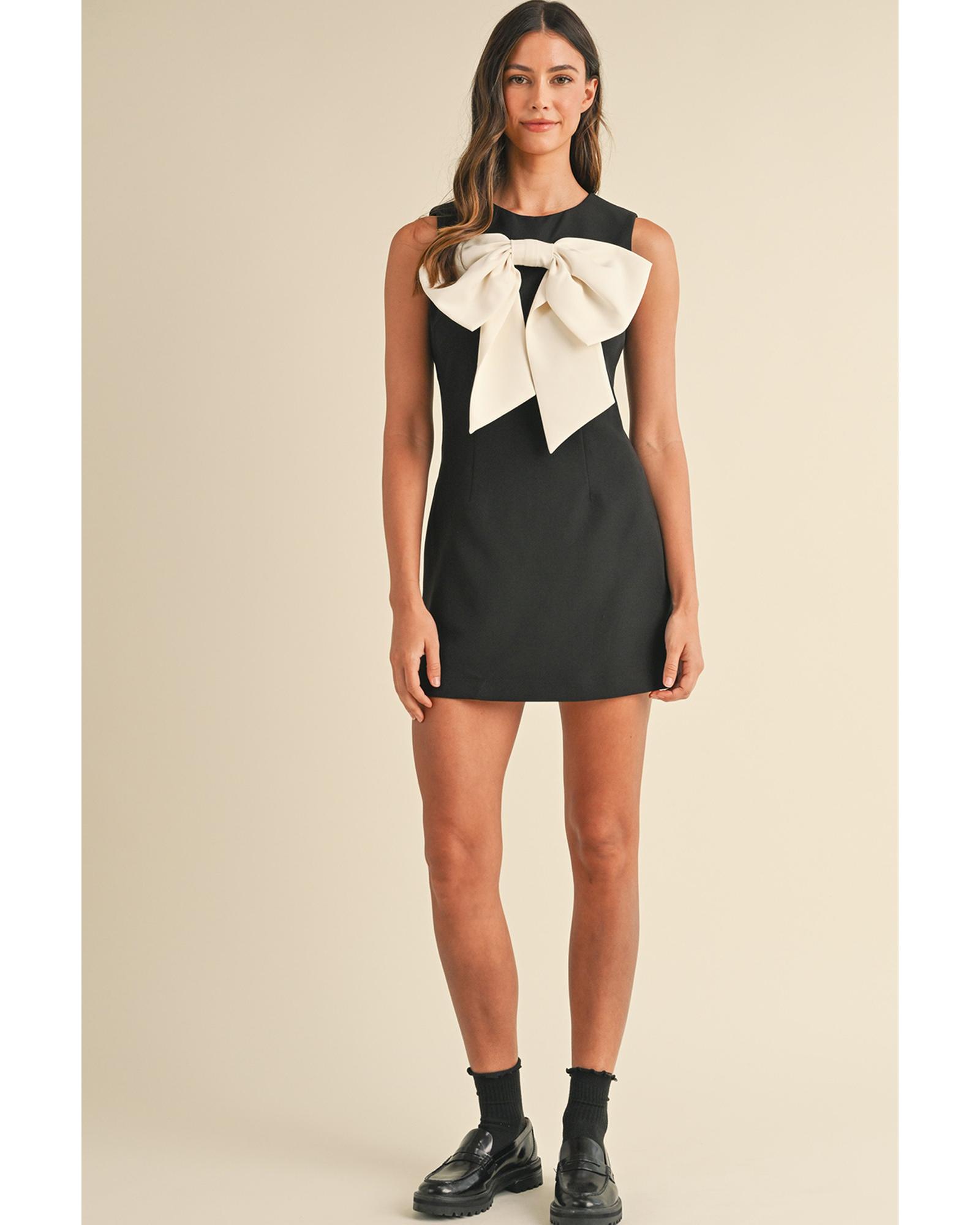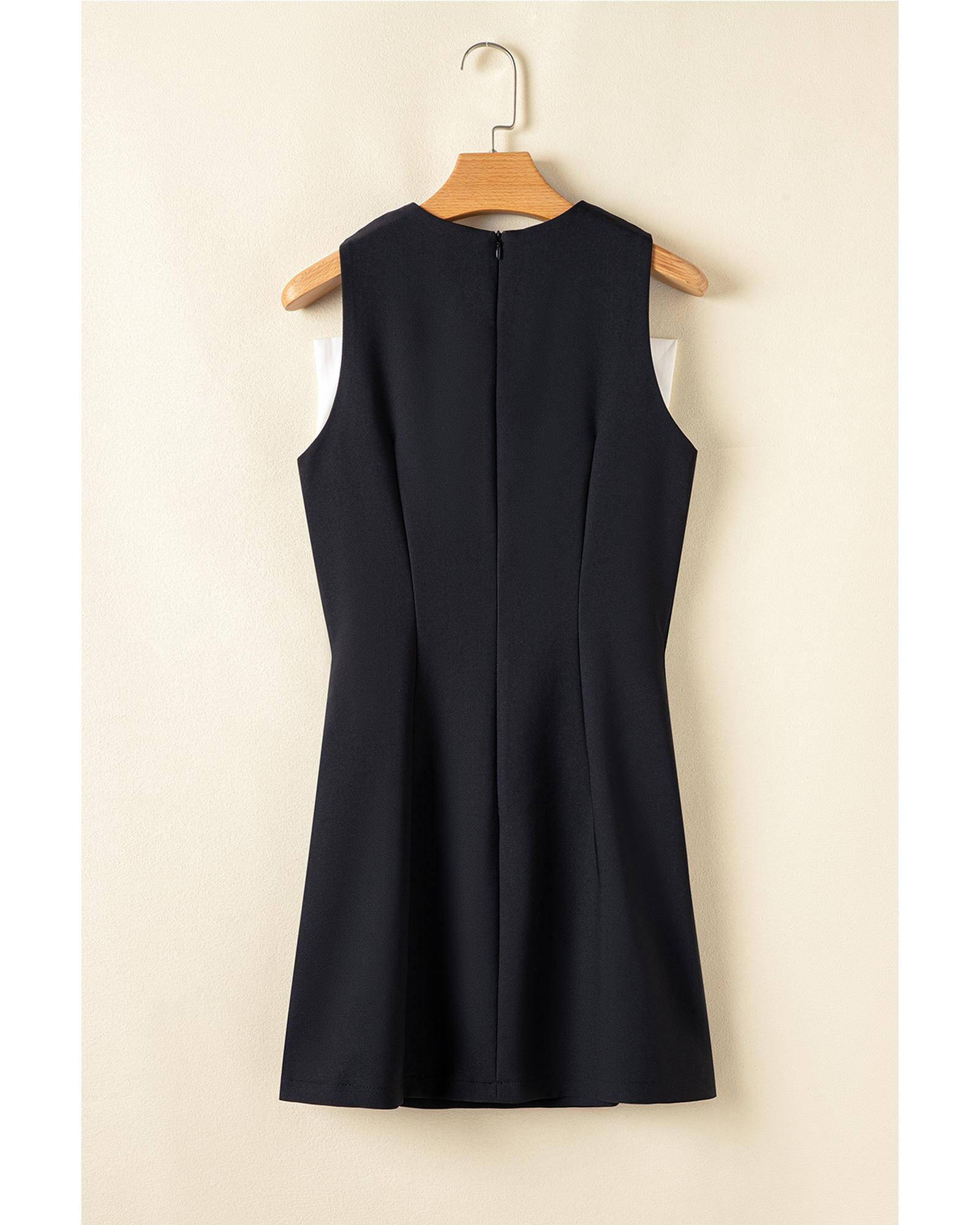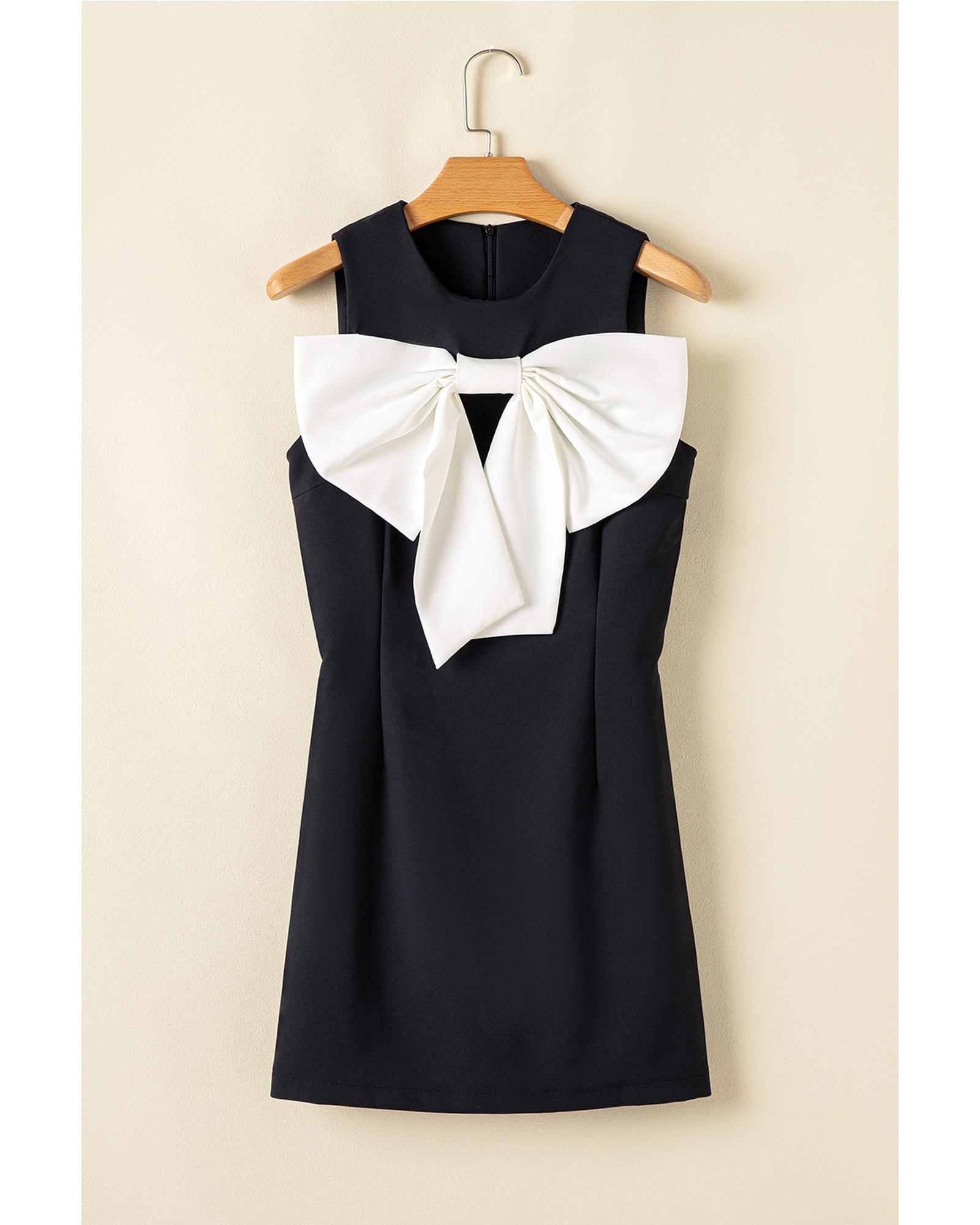 Black Contrast Bowknot Applique Crew Neck Sleeveless Mini Dress – S