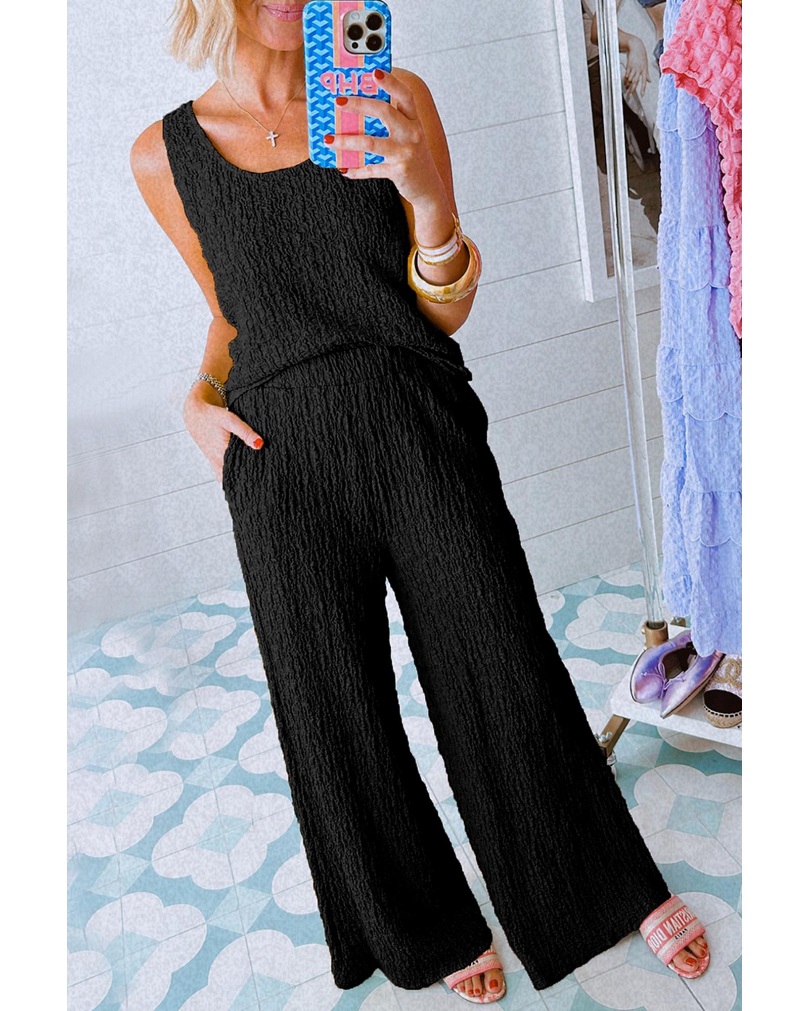Black Crinkled U Neck Tank Top and Wide Leg Pants Set – L