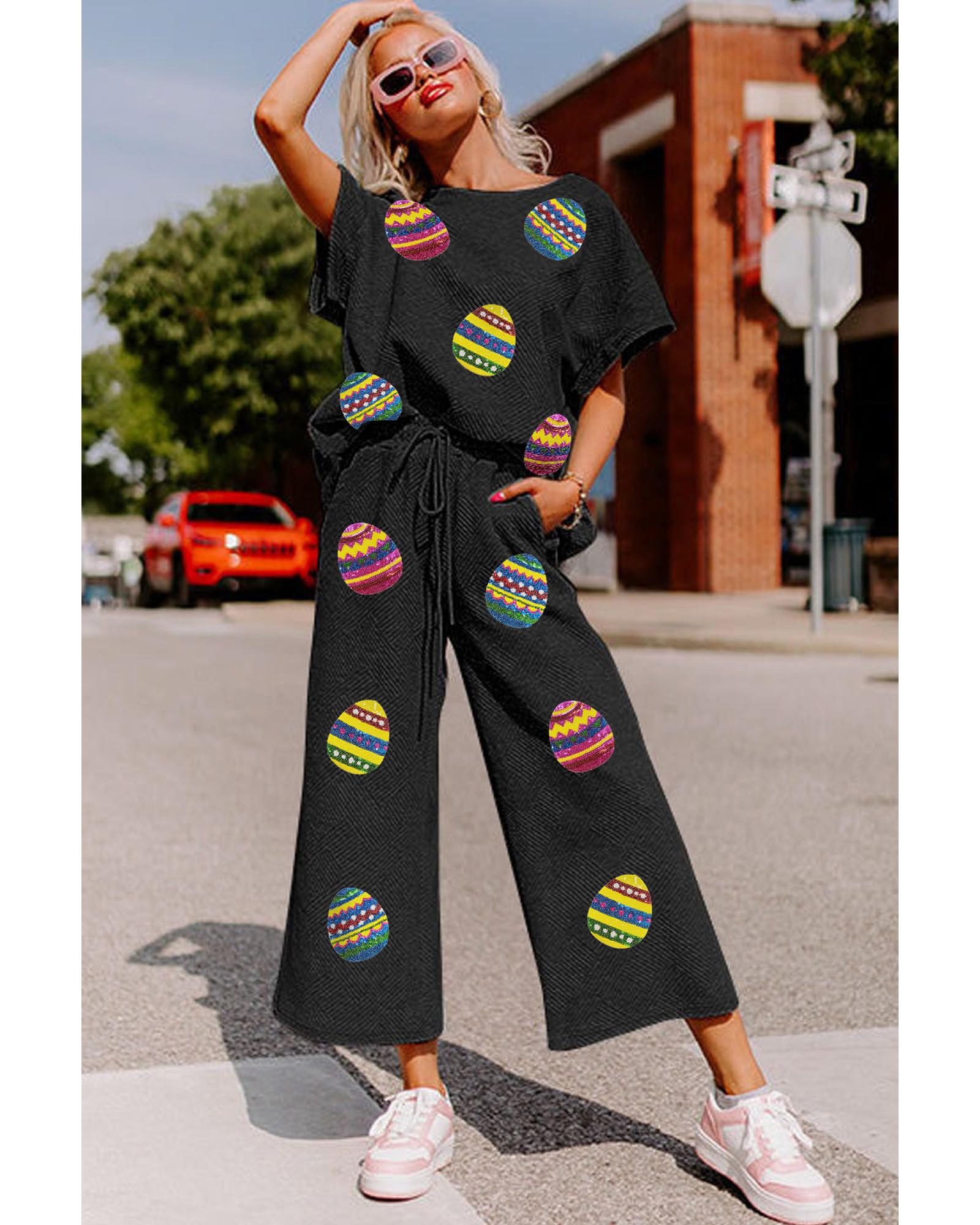 - Black Easter Egg Print Textured Short Sleeve Wide Leg Pants Set