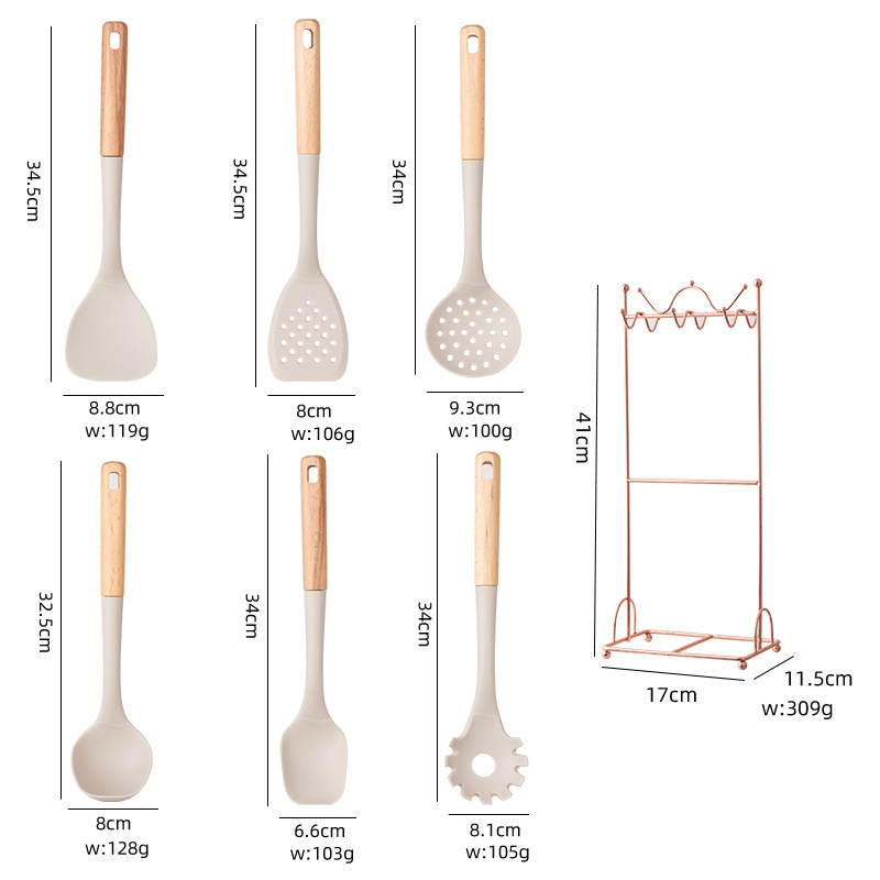 Transform your kitchen and cooking routine with this beautiful and functional 7-Piece Silicone Kitchen Utensil Set. Featuring smooth wooden handles, heat-resistant light grey silicone heads, and a chic rose gold coloured metal stand, this set combines style with practicality. Designed to be gentle on your non-stick cookware, these utensils are essential tools for any modern kitchen.