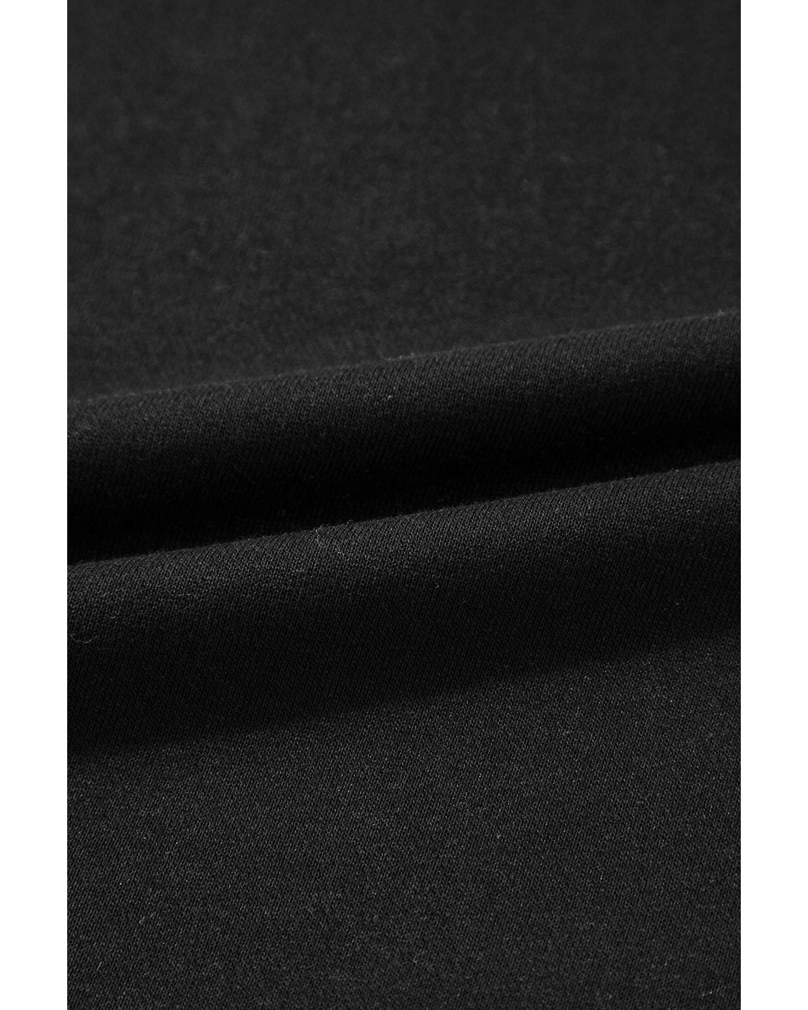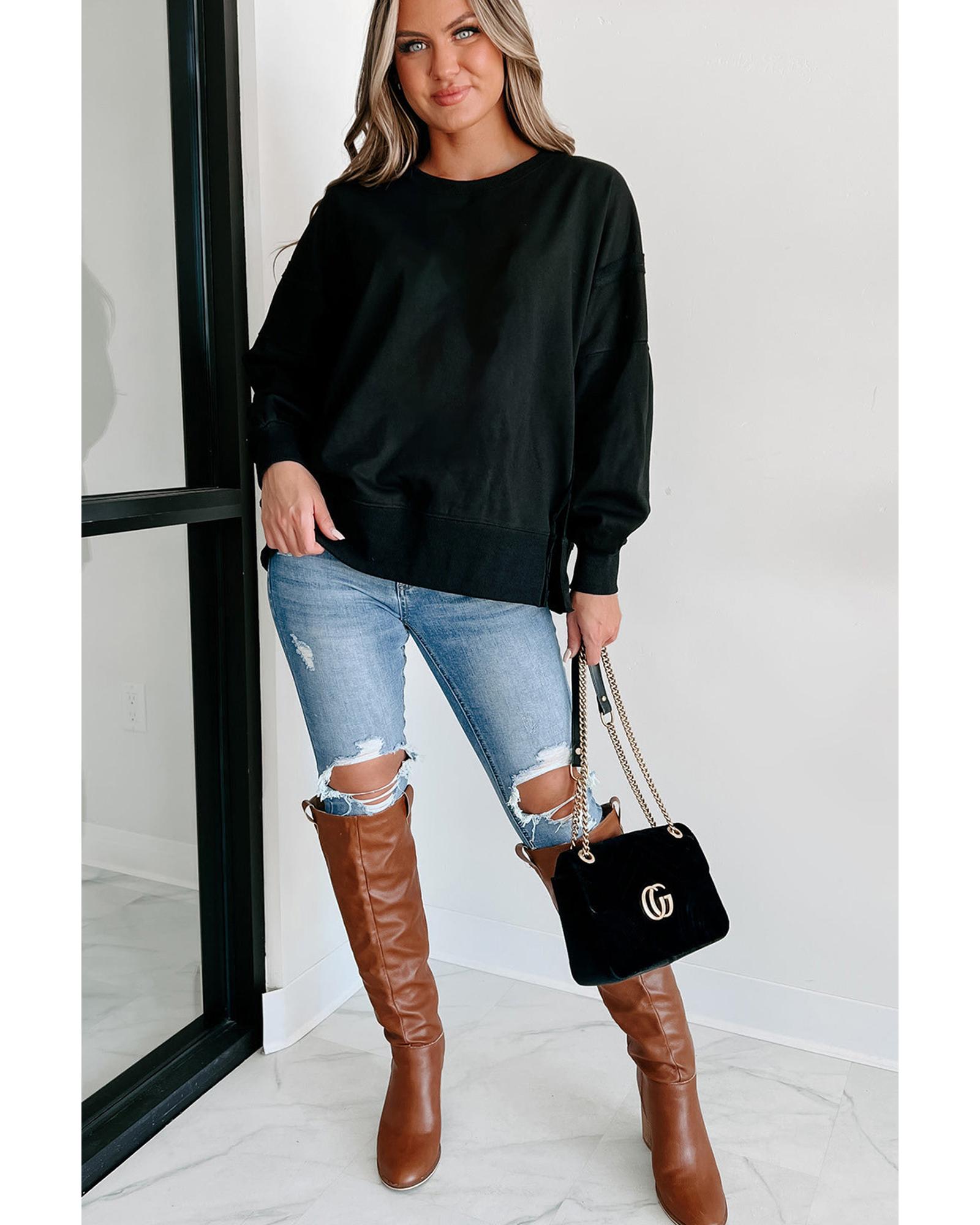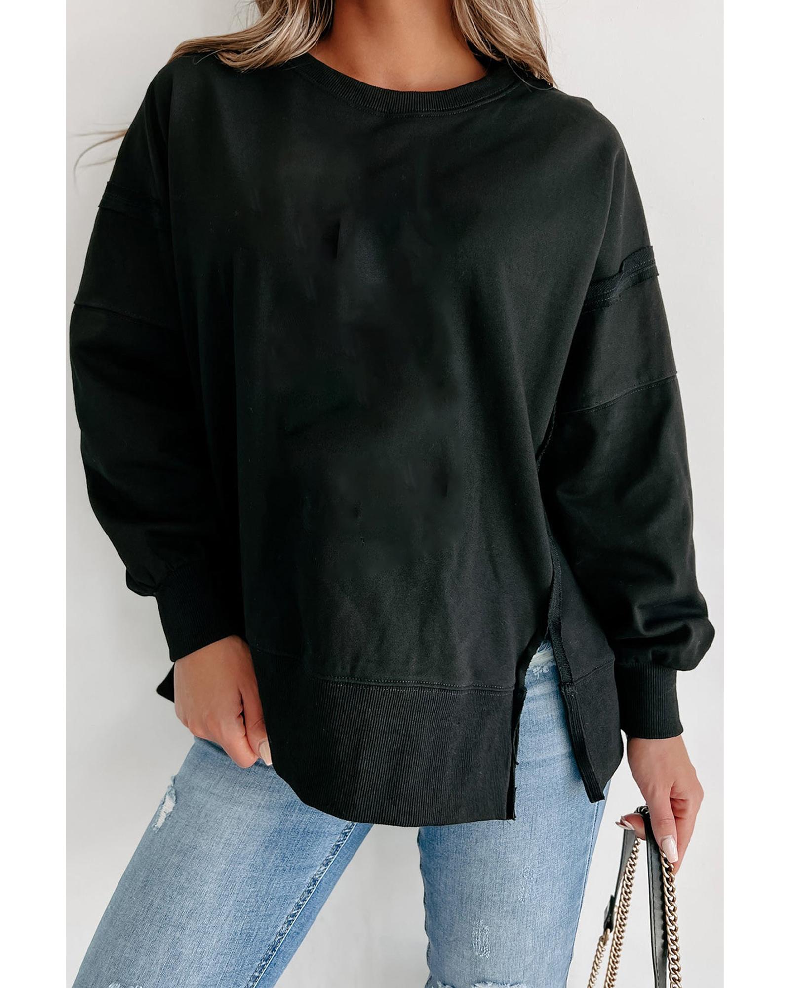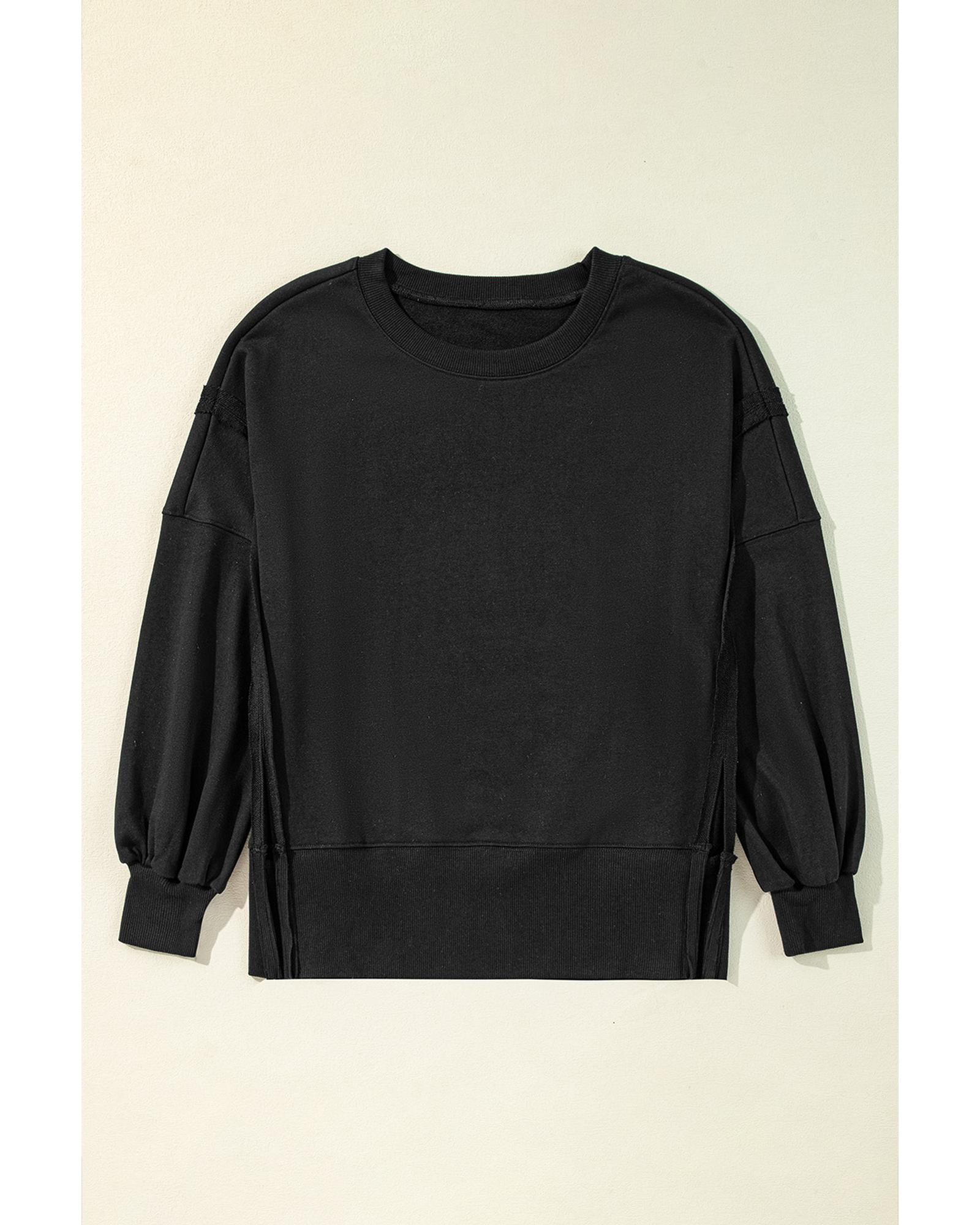 - Black Exposed Seam Drop Shoulder Round Neck Sweatshirt with Slits