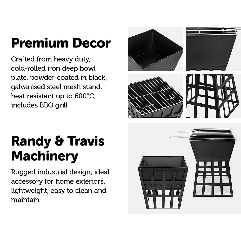 This industrial-chic fire pit from Randy Travis Machinery is the perfect way to celebrate autumn's arrival. Crisp evenings are the perfect pairing as you, your family, and friends gather around its cozy warmth. Crafted from sturdy iron plate powder-coated in black, it looks as rugged as the outdoors itself. Pour your fuel of choice timber or charcoal inside and light it up. With its galvanised grill, it's all ready for your favourite BBQ foods. Incredible craftsmanship and solid design make it an ideal accessory for home exteriors of all styles.