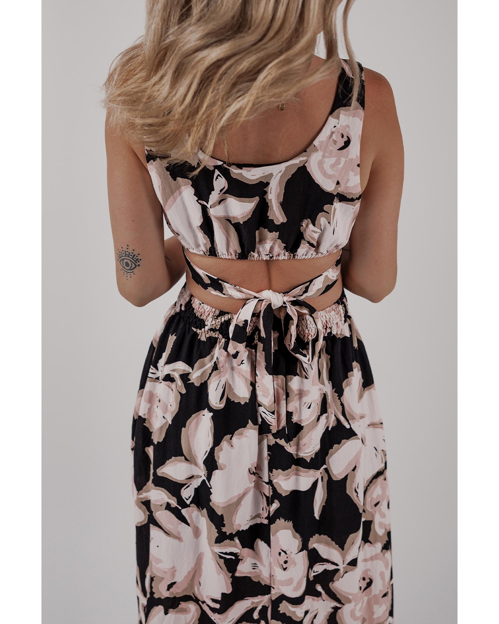 Black Floral Cutout Square Neck Knot Back Sleeveless Maxi Dress – S