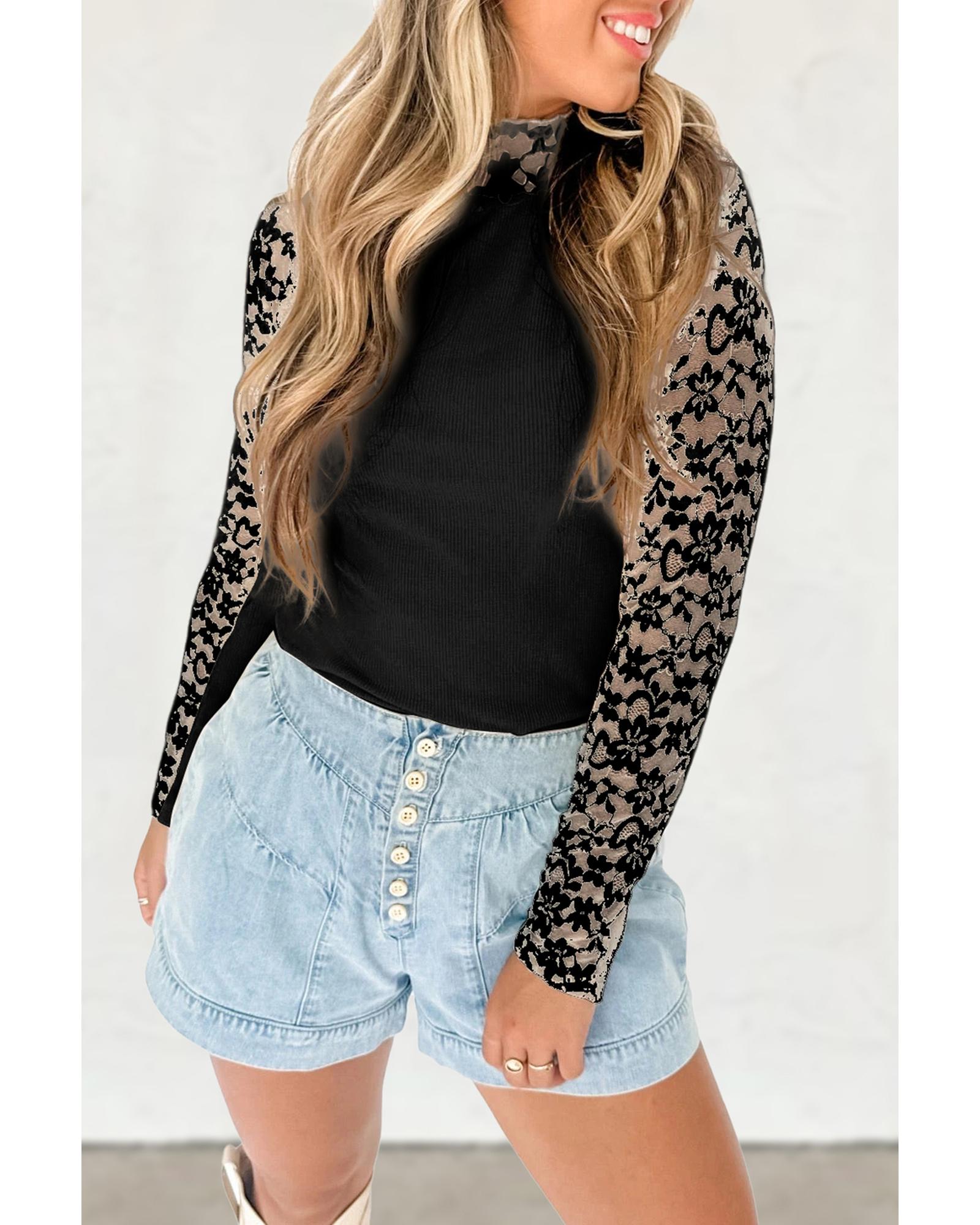 - Black Floral Lace Patchwork Long Sleeve High Neck Slim Top