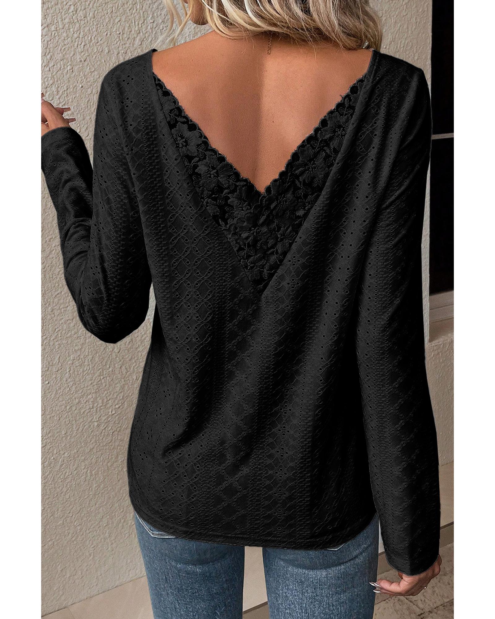 Black Floral Lace Splicing Eyelet Long Sleeve Top – M
