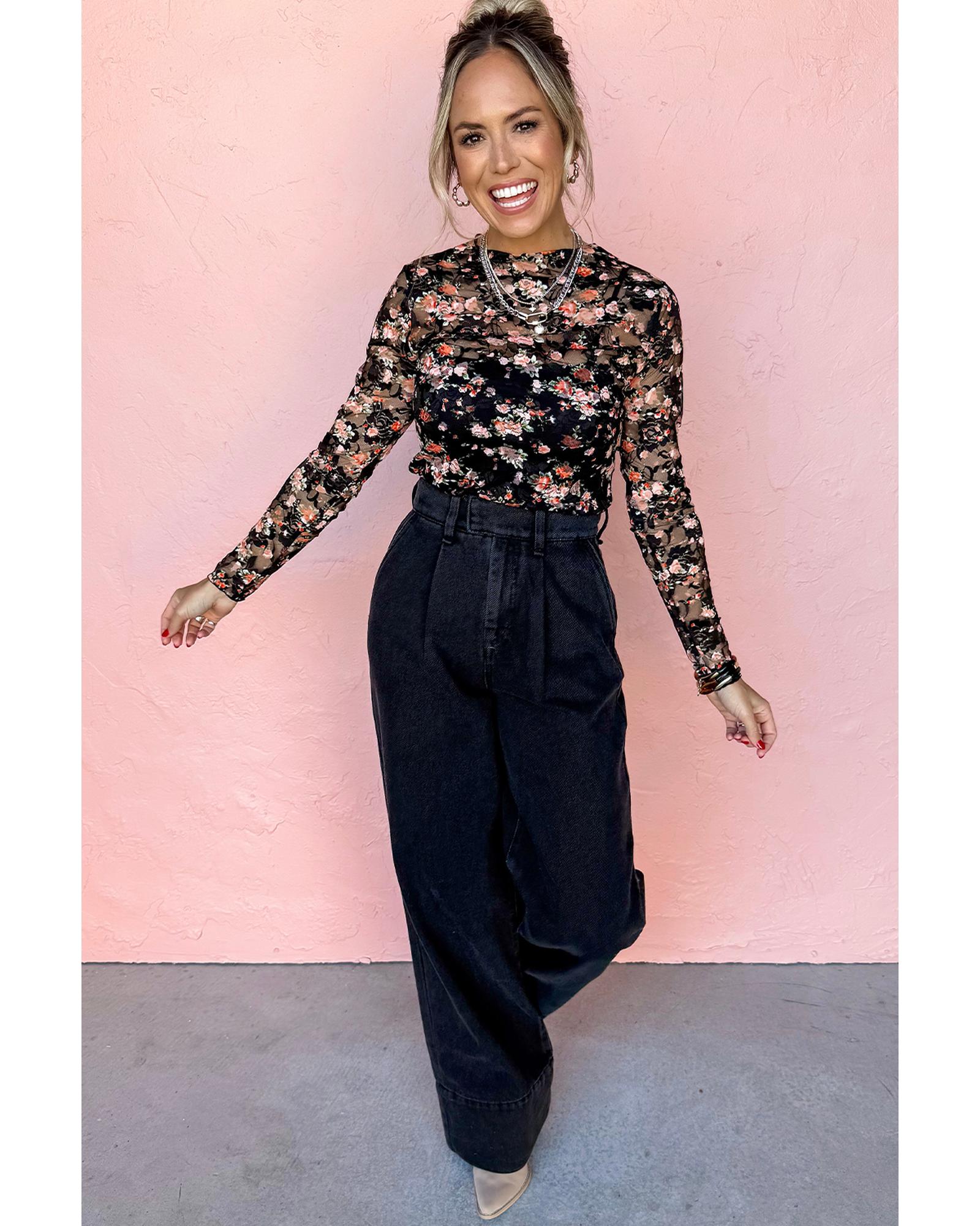 - Black Floral Mesh Sheer Long Sleeve Top with floral pattern