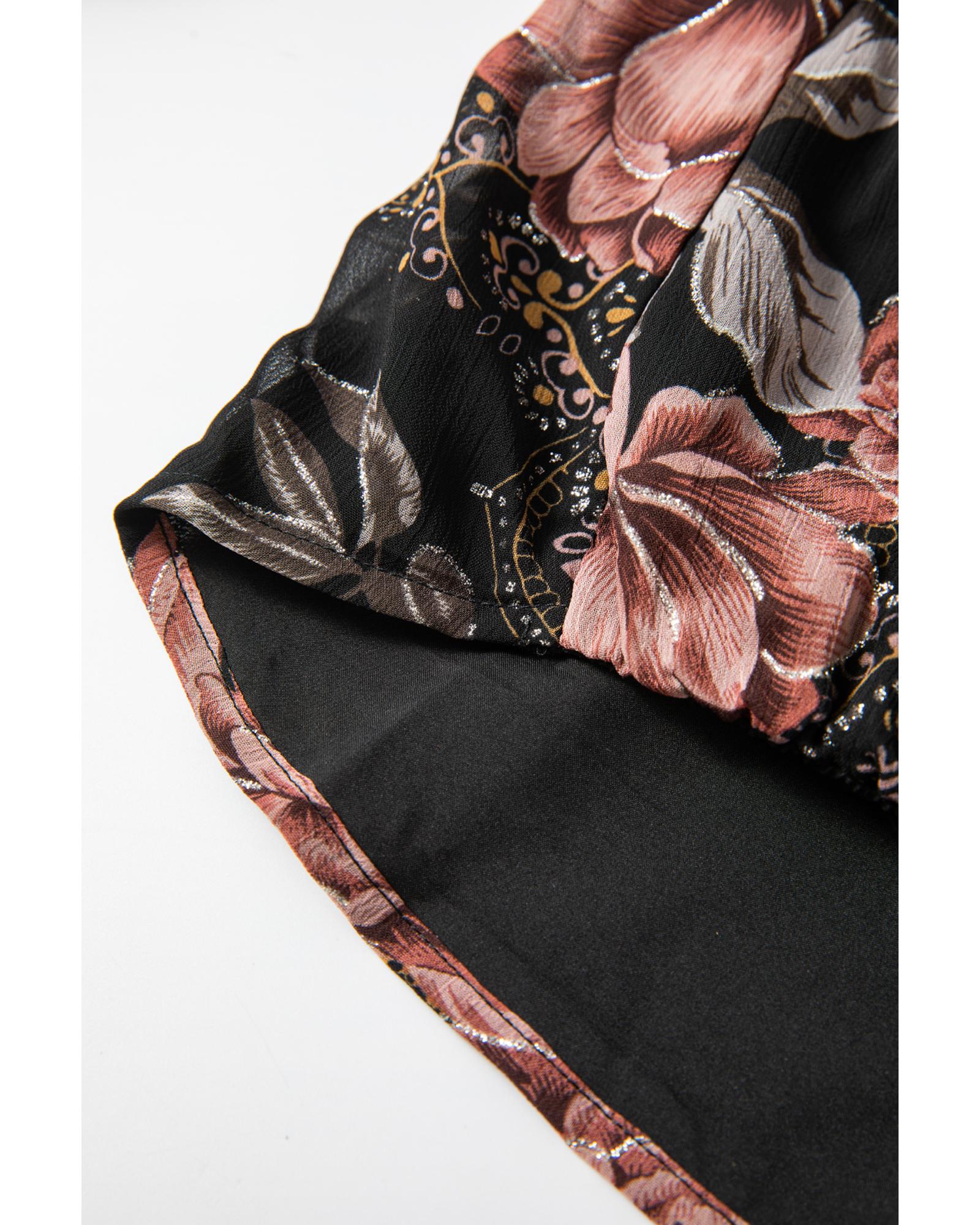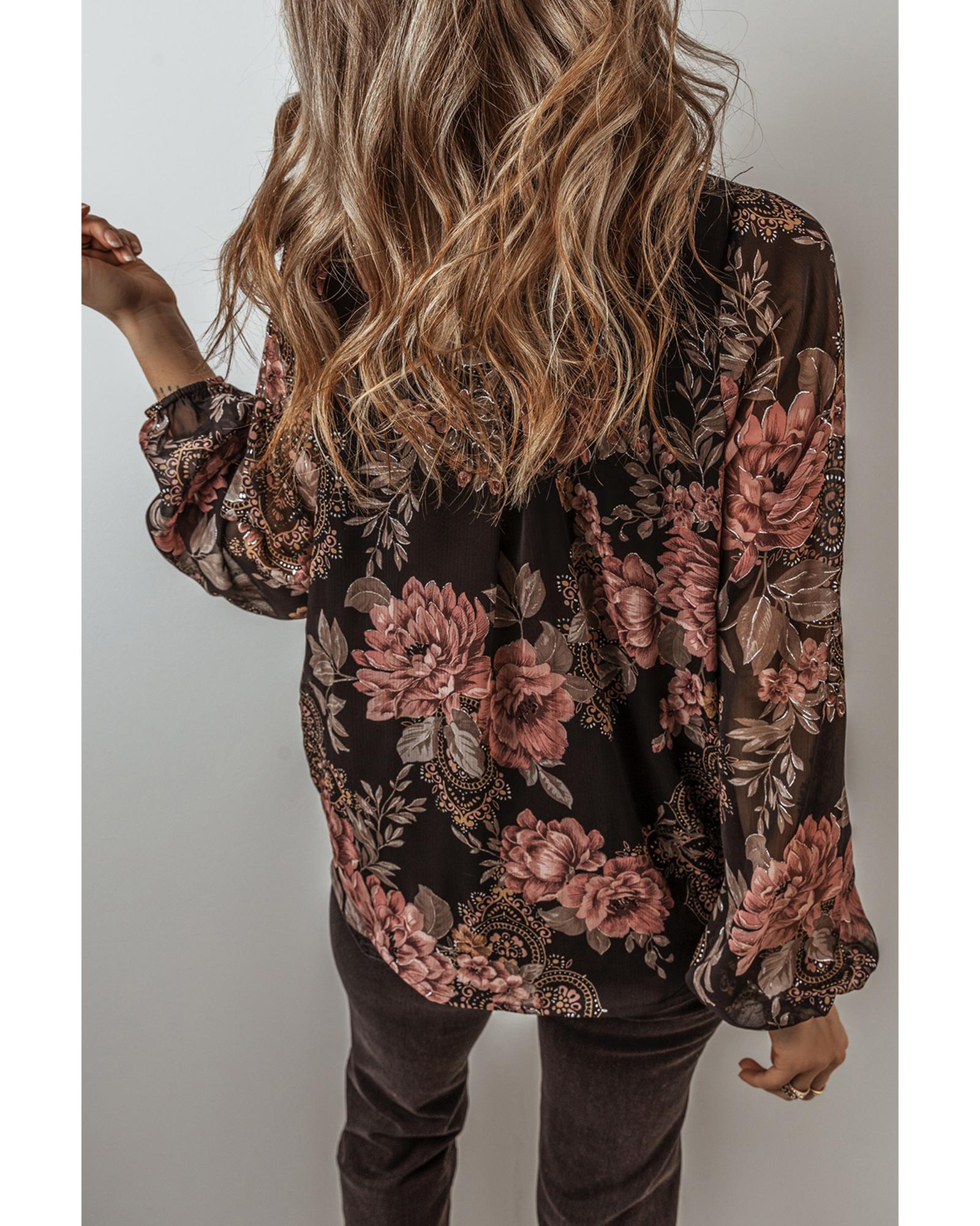 Black Floral Print Criss Cross V Neck Balloon Sleeve Blouse – M