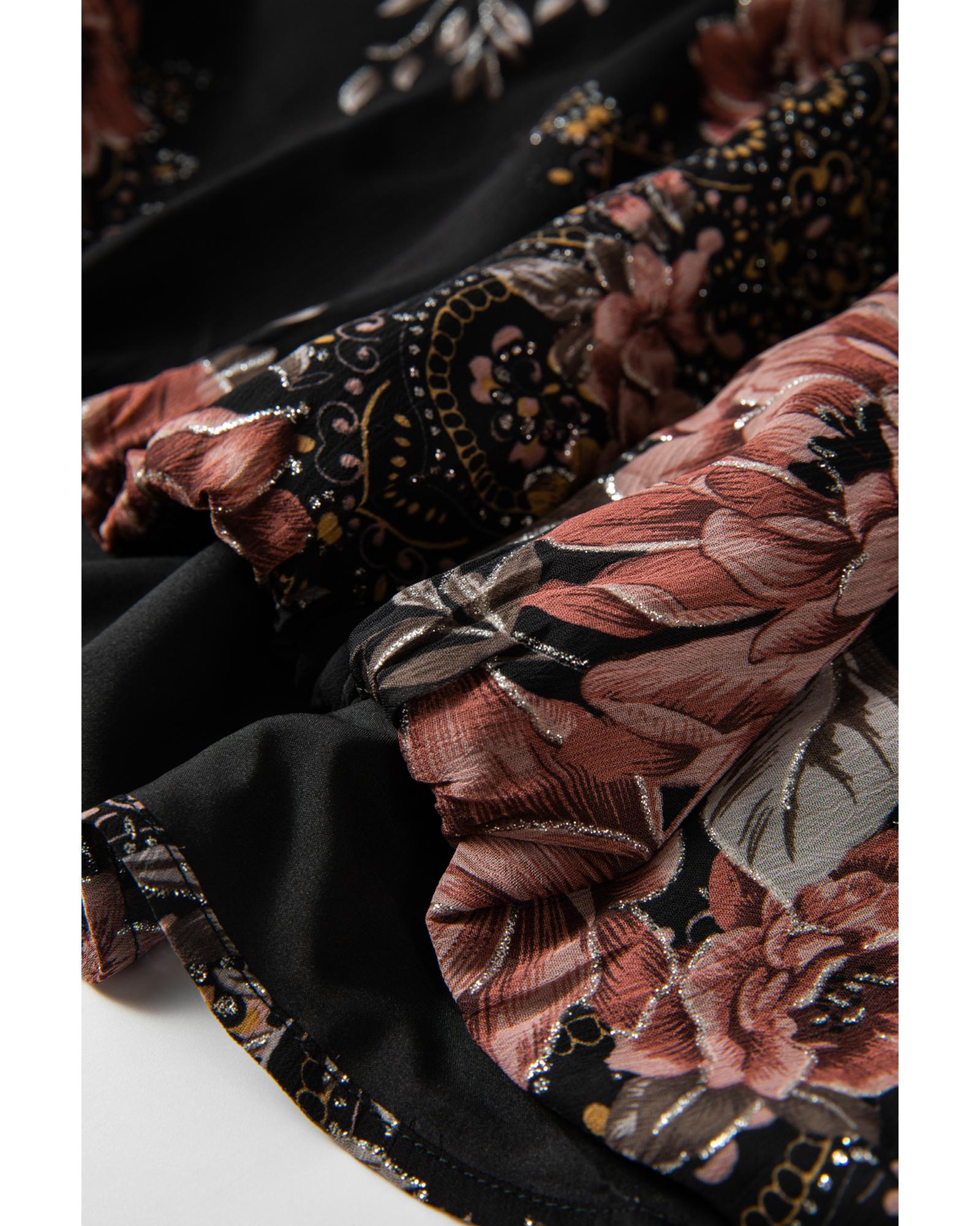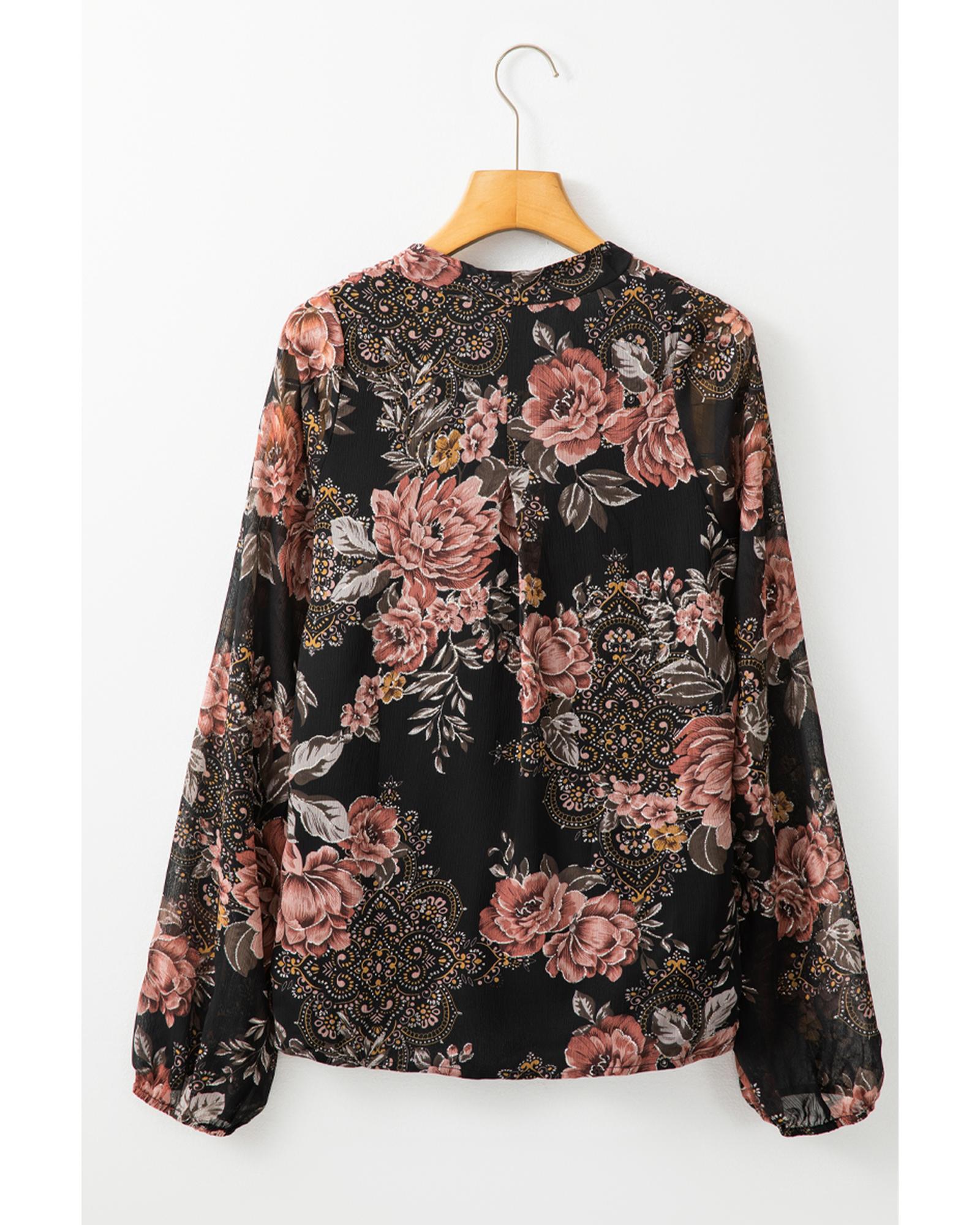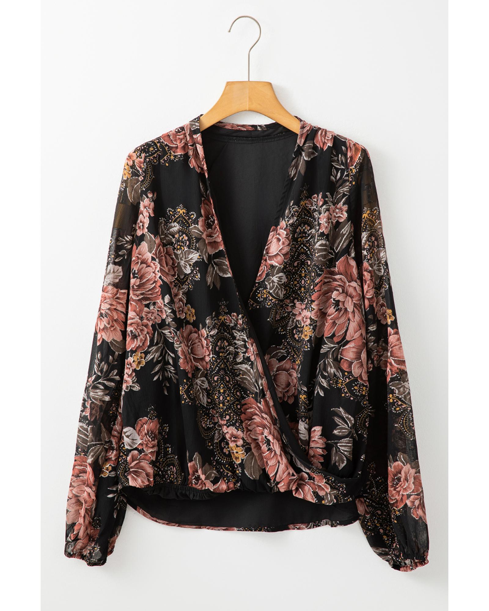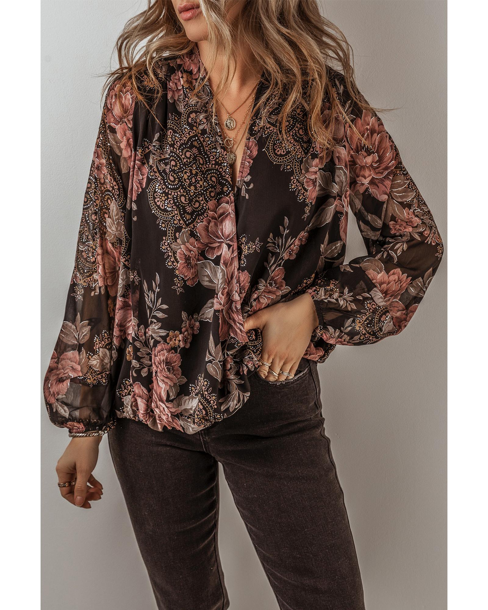 Black Floral Print Criss Cross V Neck Balloon Sleeve Blouse – XL