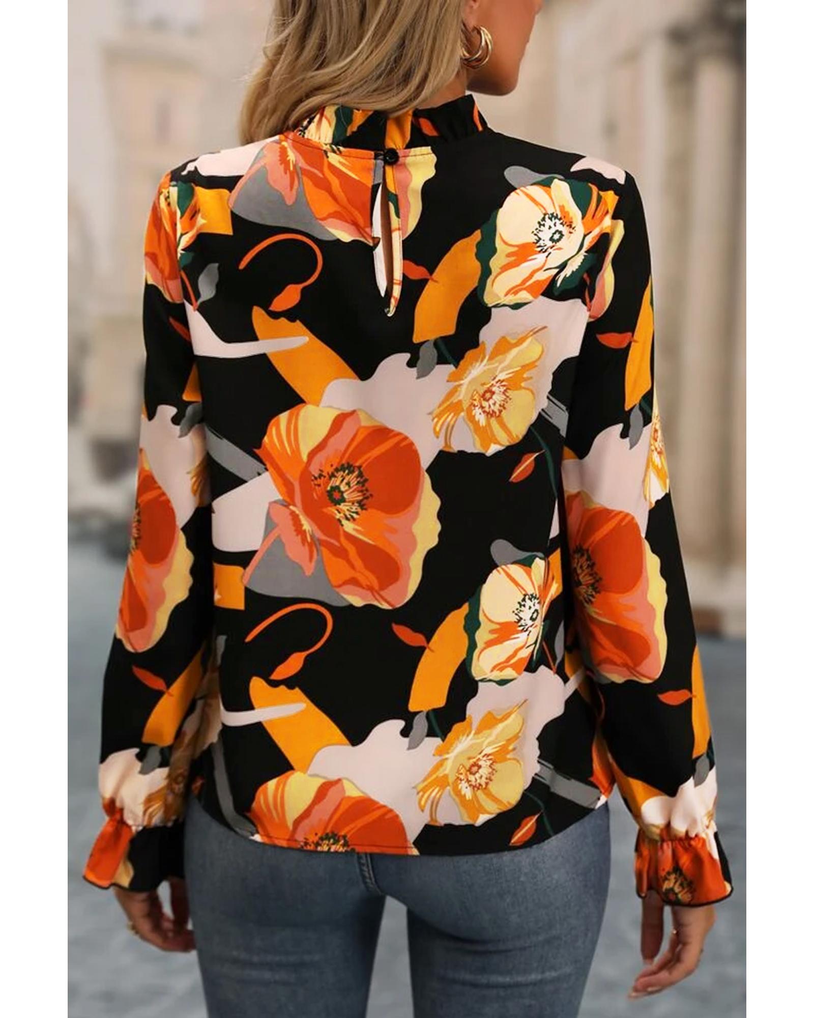 Black Floral Print Mock Neck Blouse – M