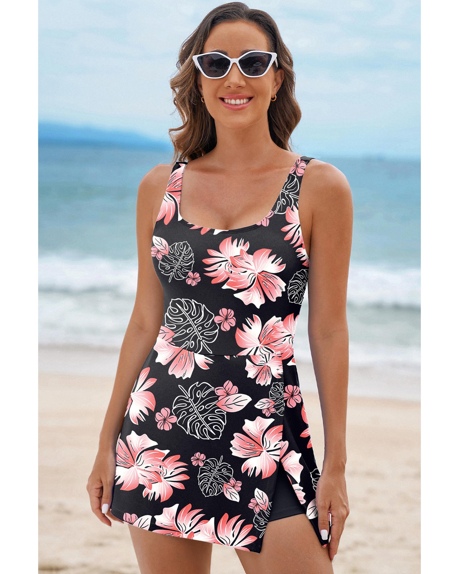 Black Floral Print Twisted Hollowed Back Swim Dress – S