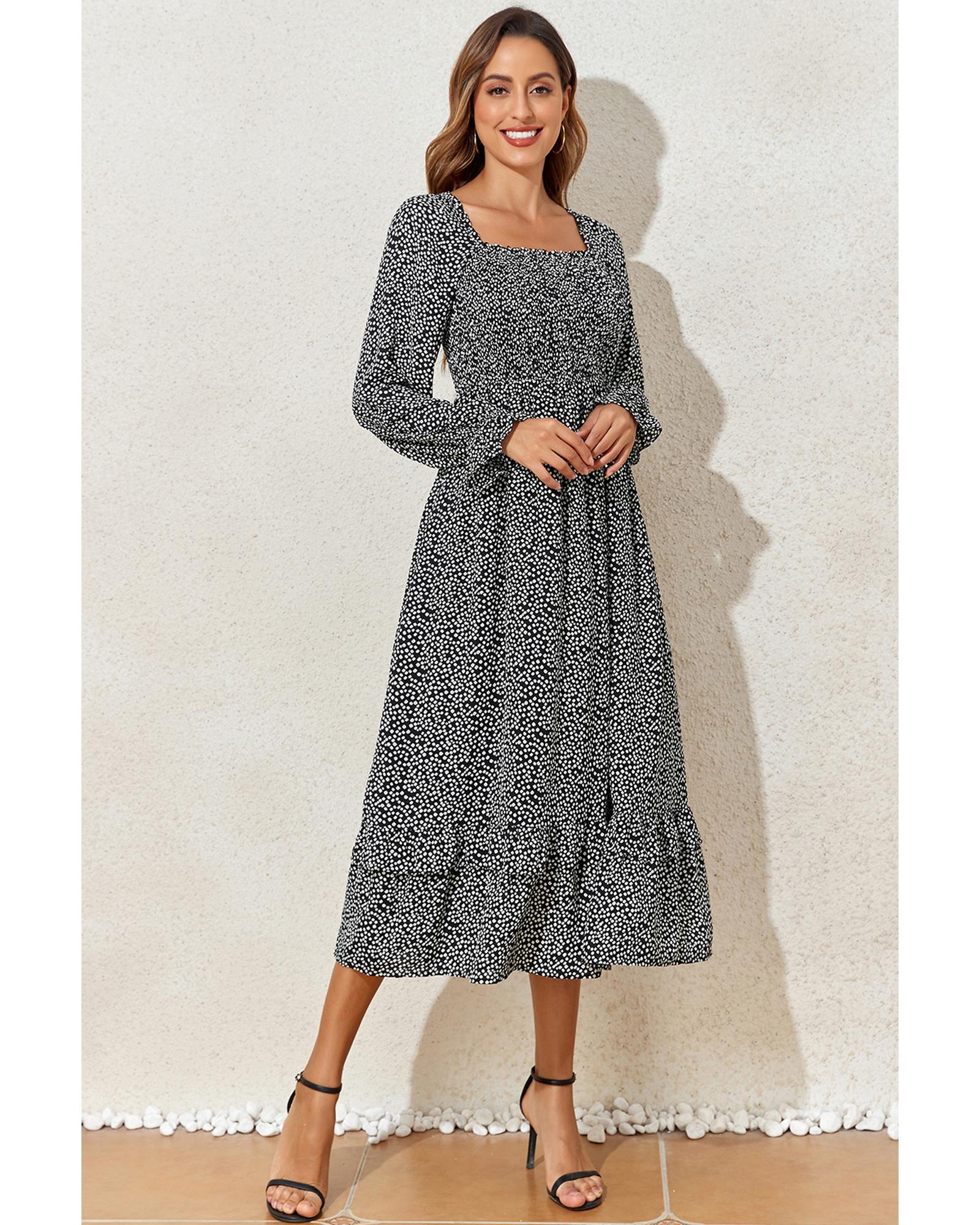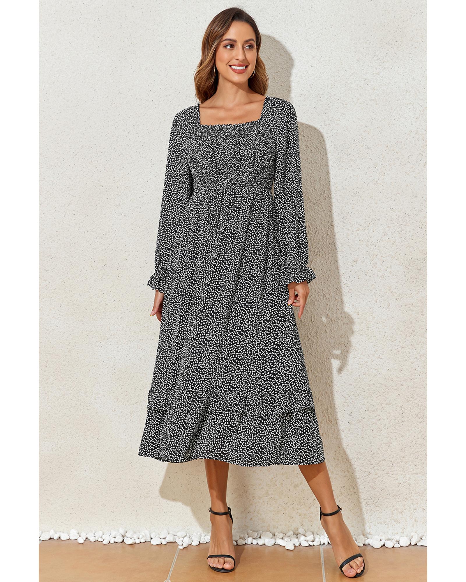 - Black floral printed long sleeve square neck midi dress