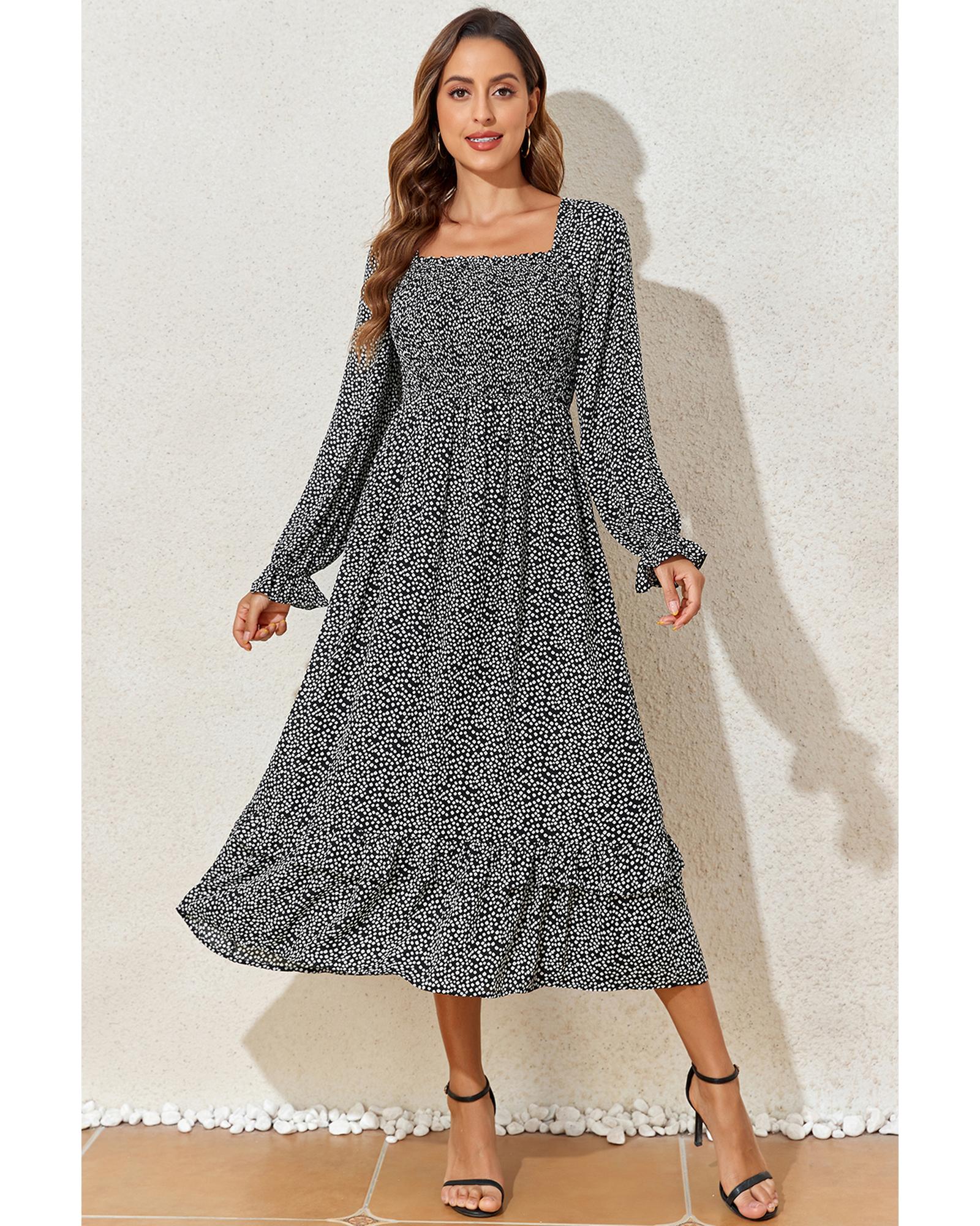 Black Floral Printed Long Sleeve Square Neck Midi Dress – XL