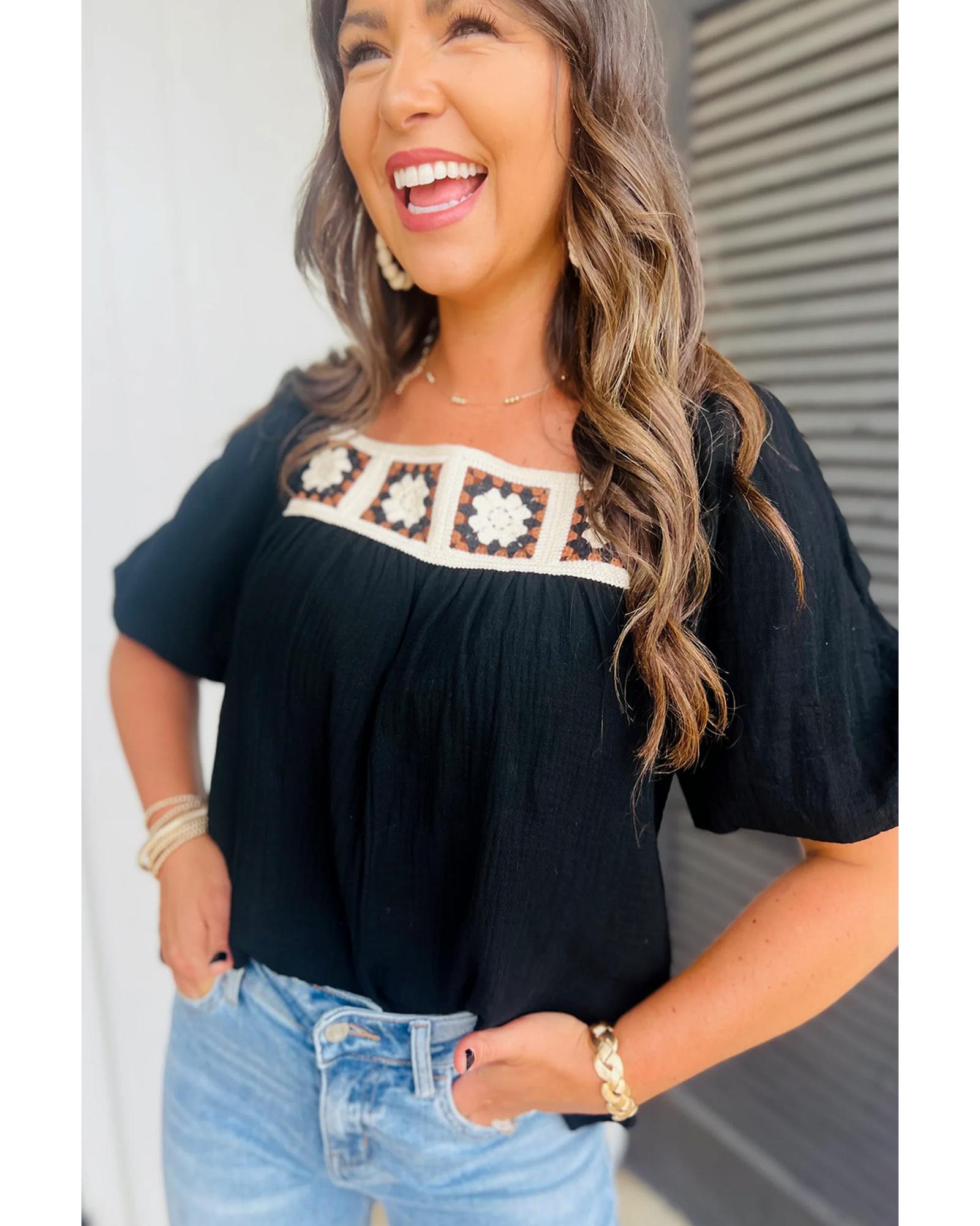Black Flower Crochet Square Neck Textured Short Sleeve Blouse – L