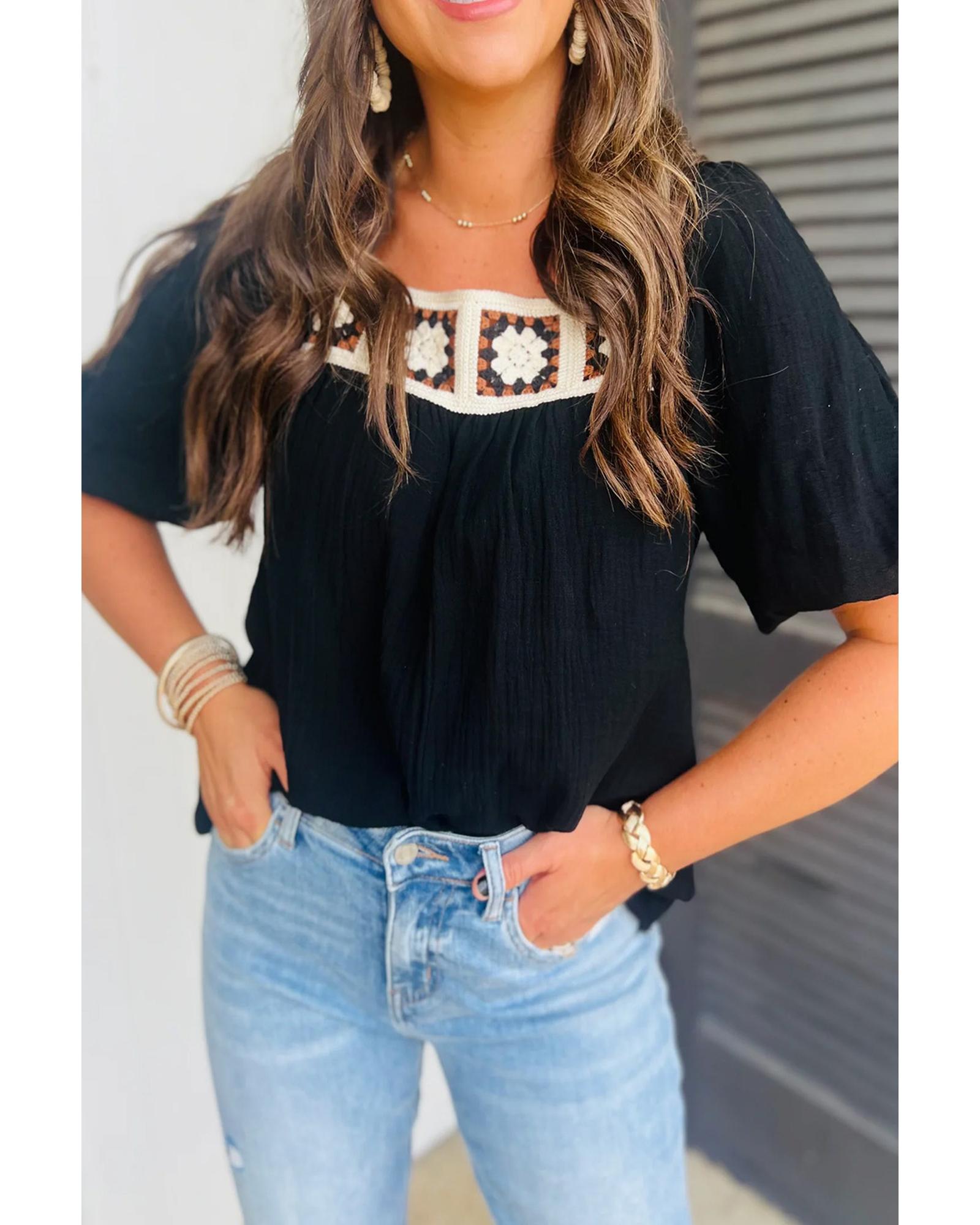 Black Flower Crochet Square Neck Textured Short Sleeve Blouse – M