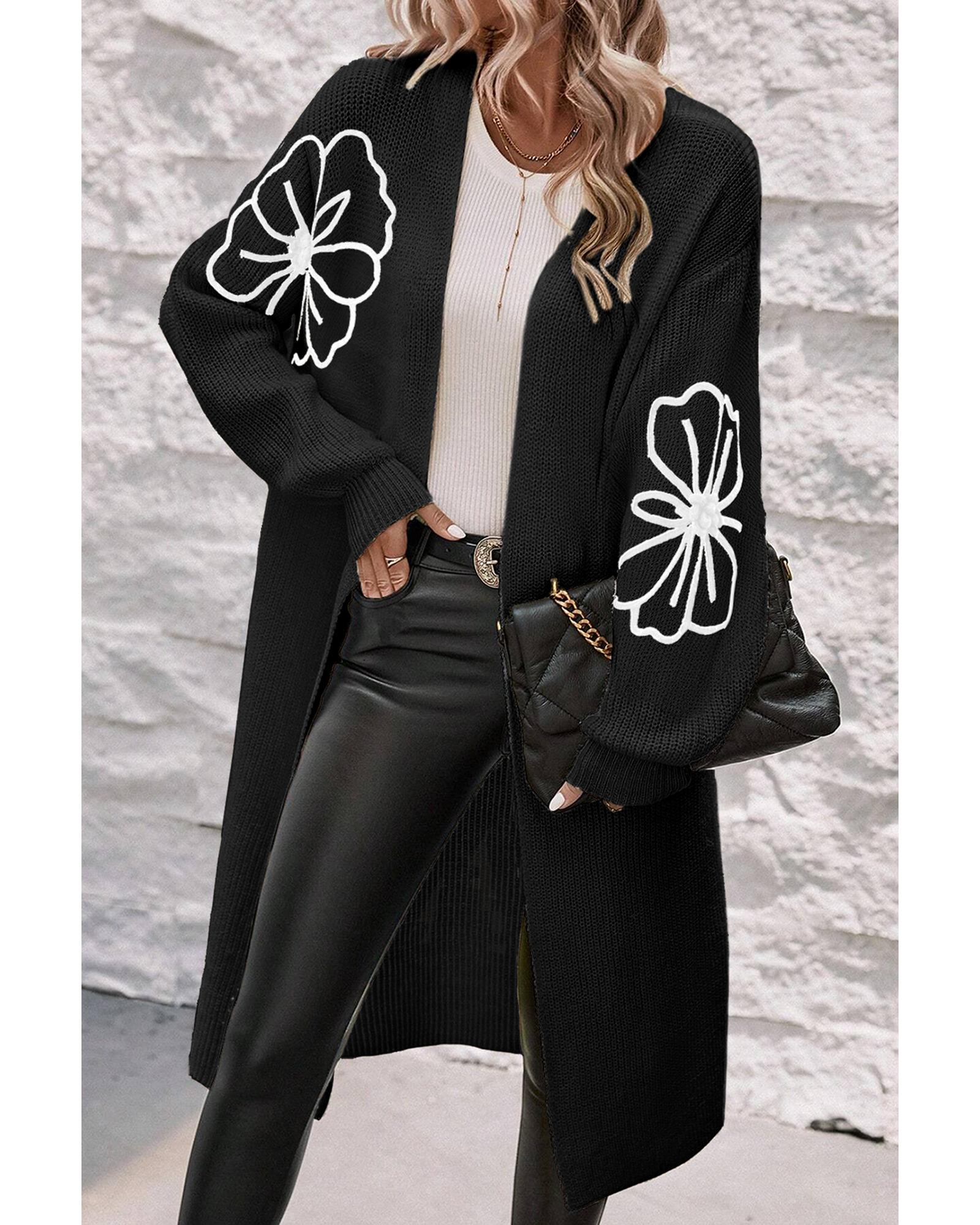 Black Flower Embroidered Drop Shoulder Open Front Duster Cardigan – M