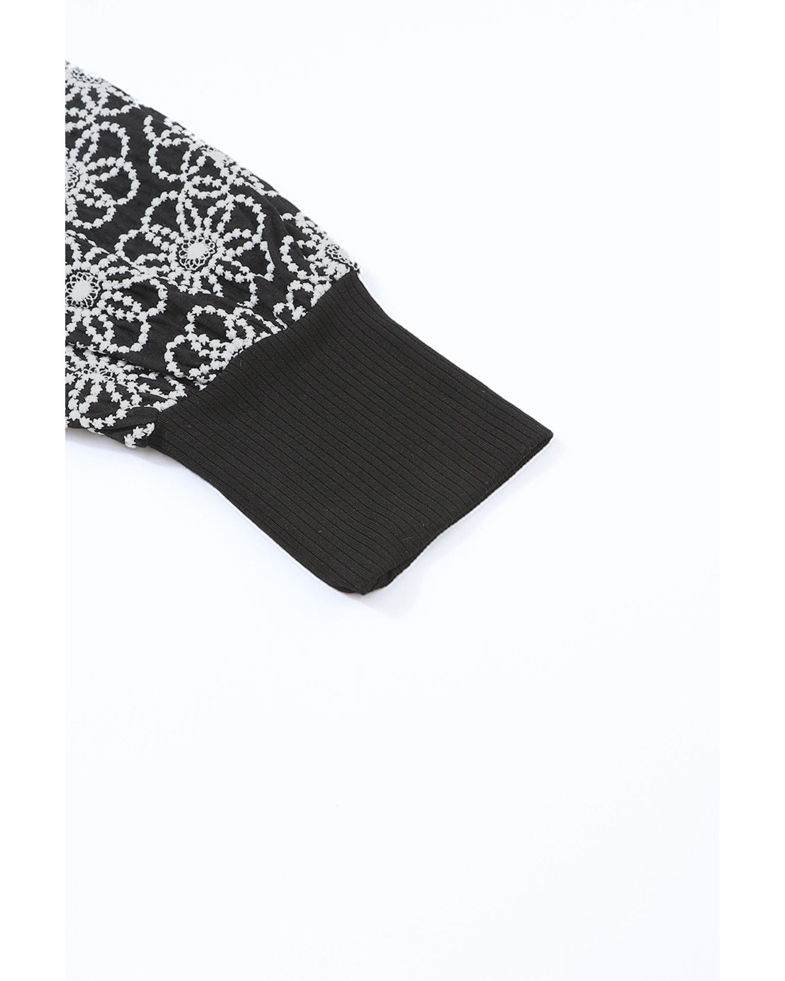 Black Flower Puff Sleeve Ribbed Knit Top – S