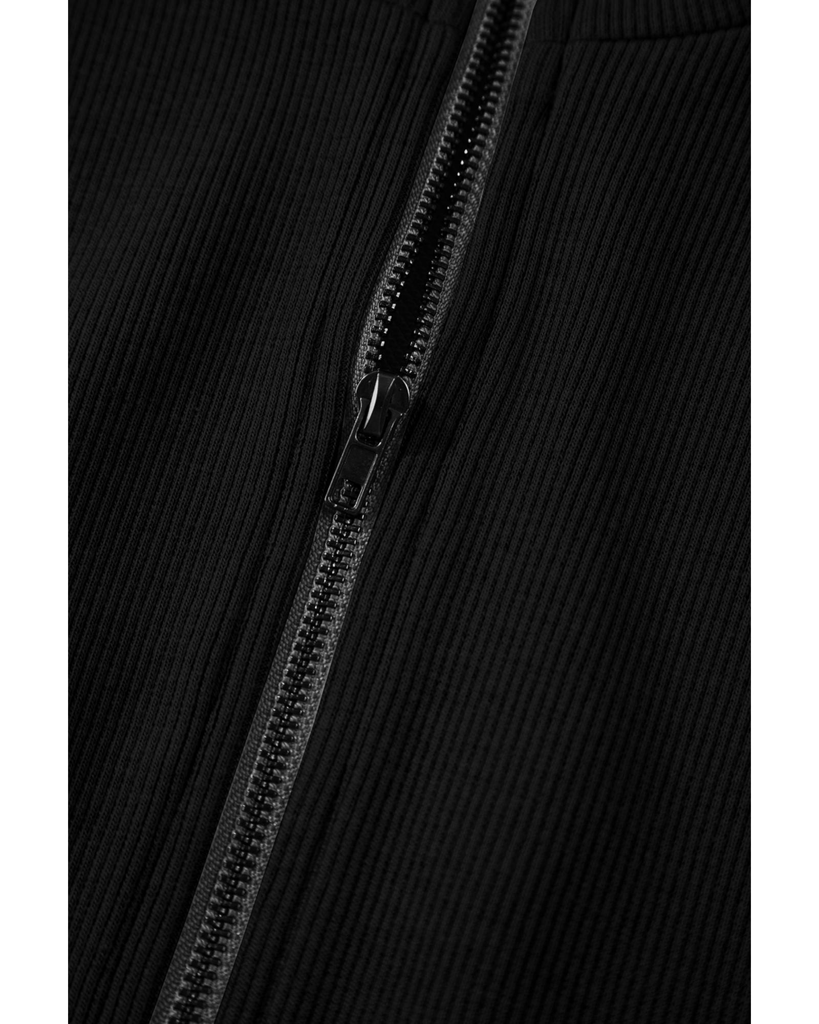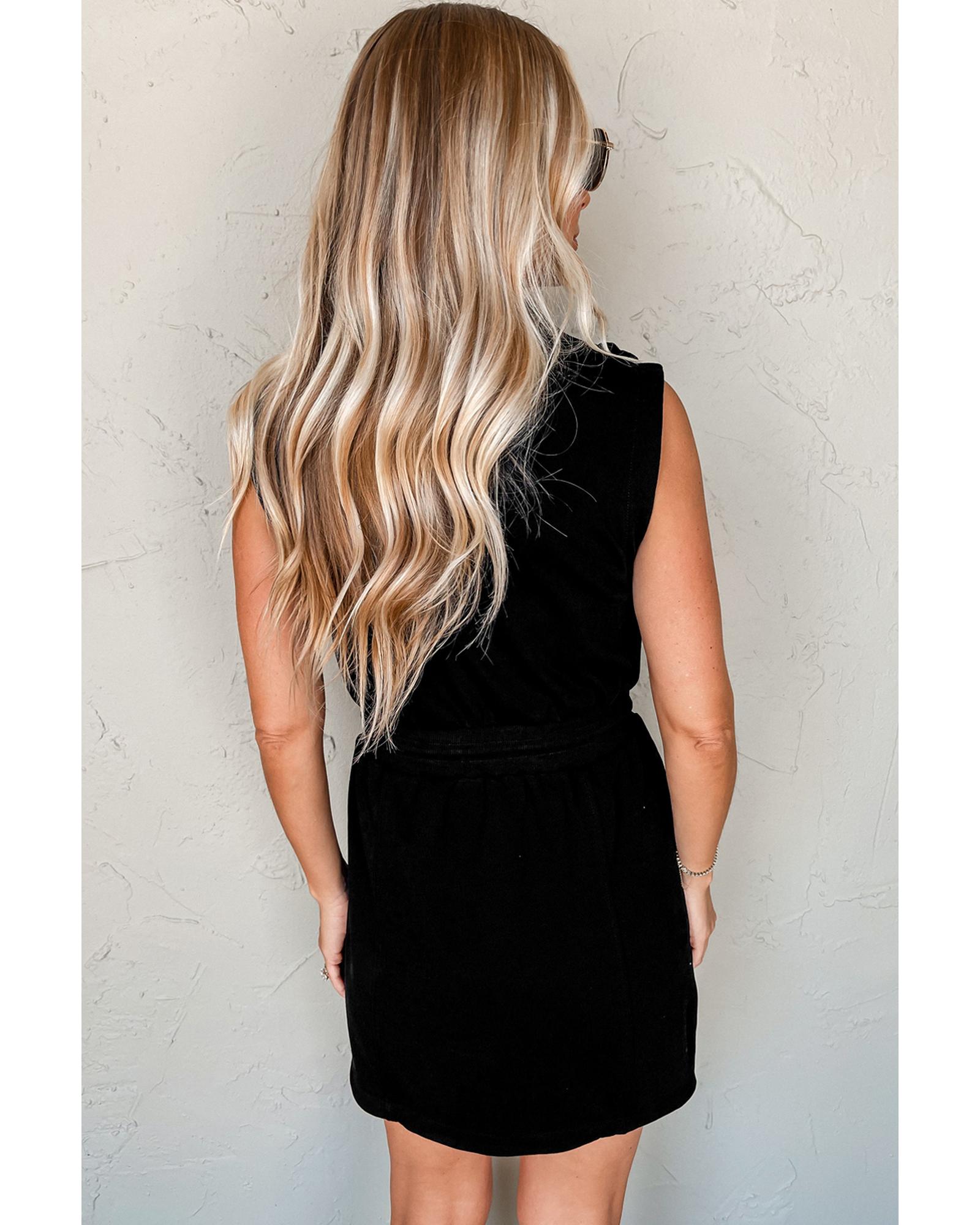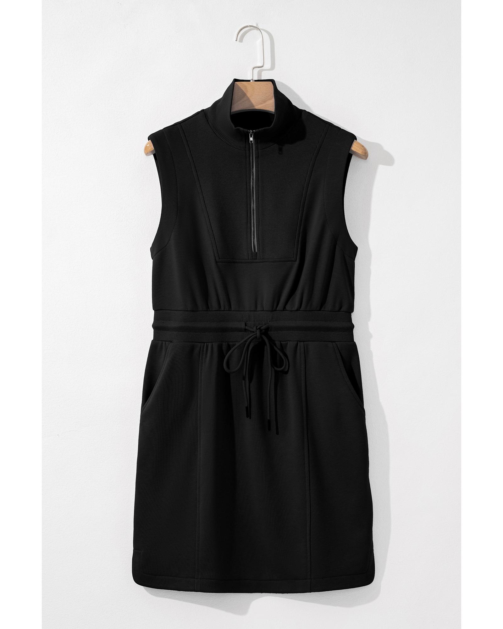 Black French Terry Zipped Collar Sleeveless Drawstring Waist Mini Dress – S