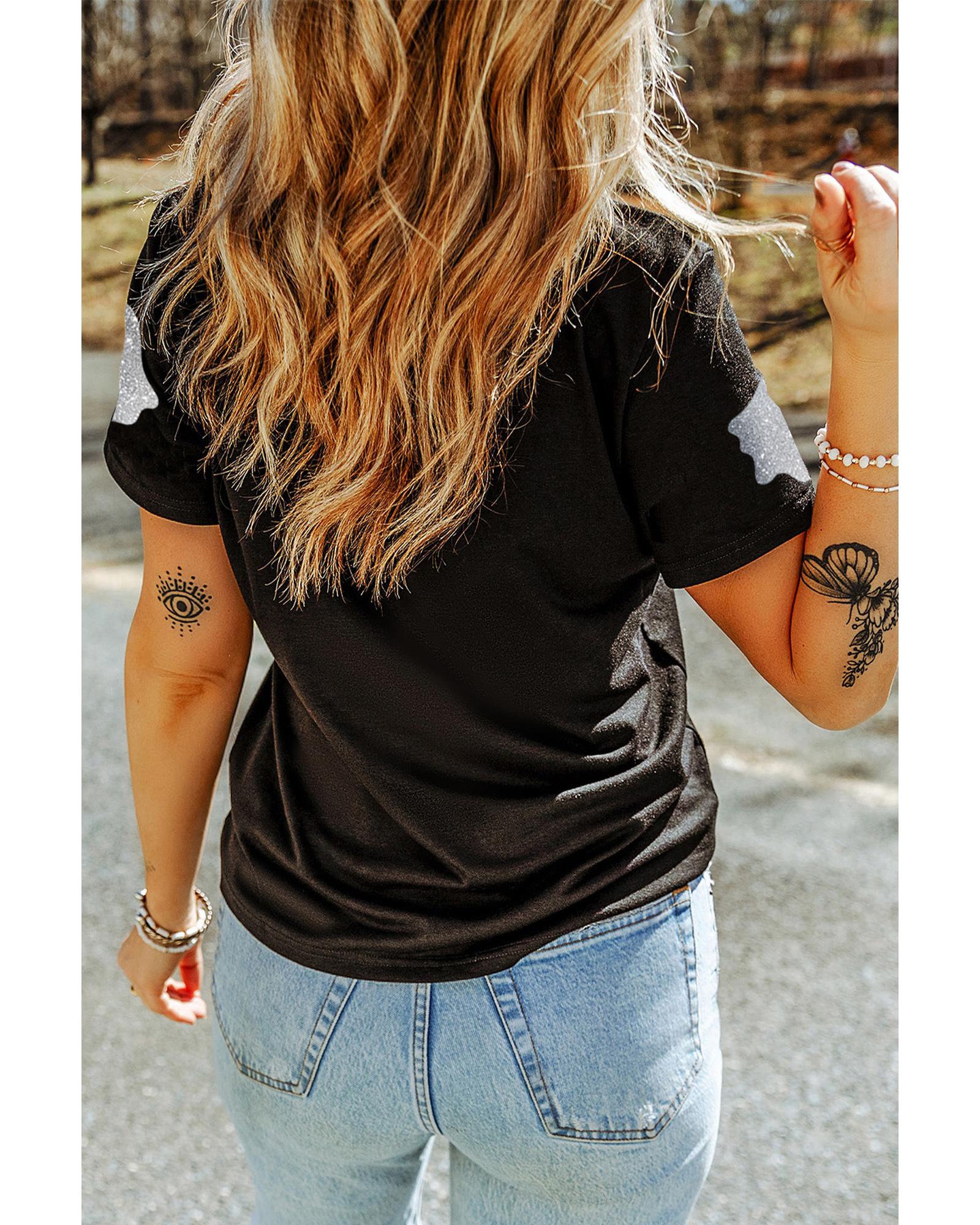 Black Glitter Ghost Pattern Crew Neck Halloween T Shirt – S