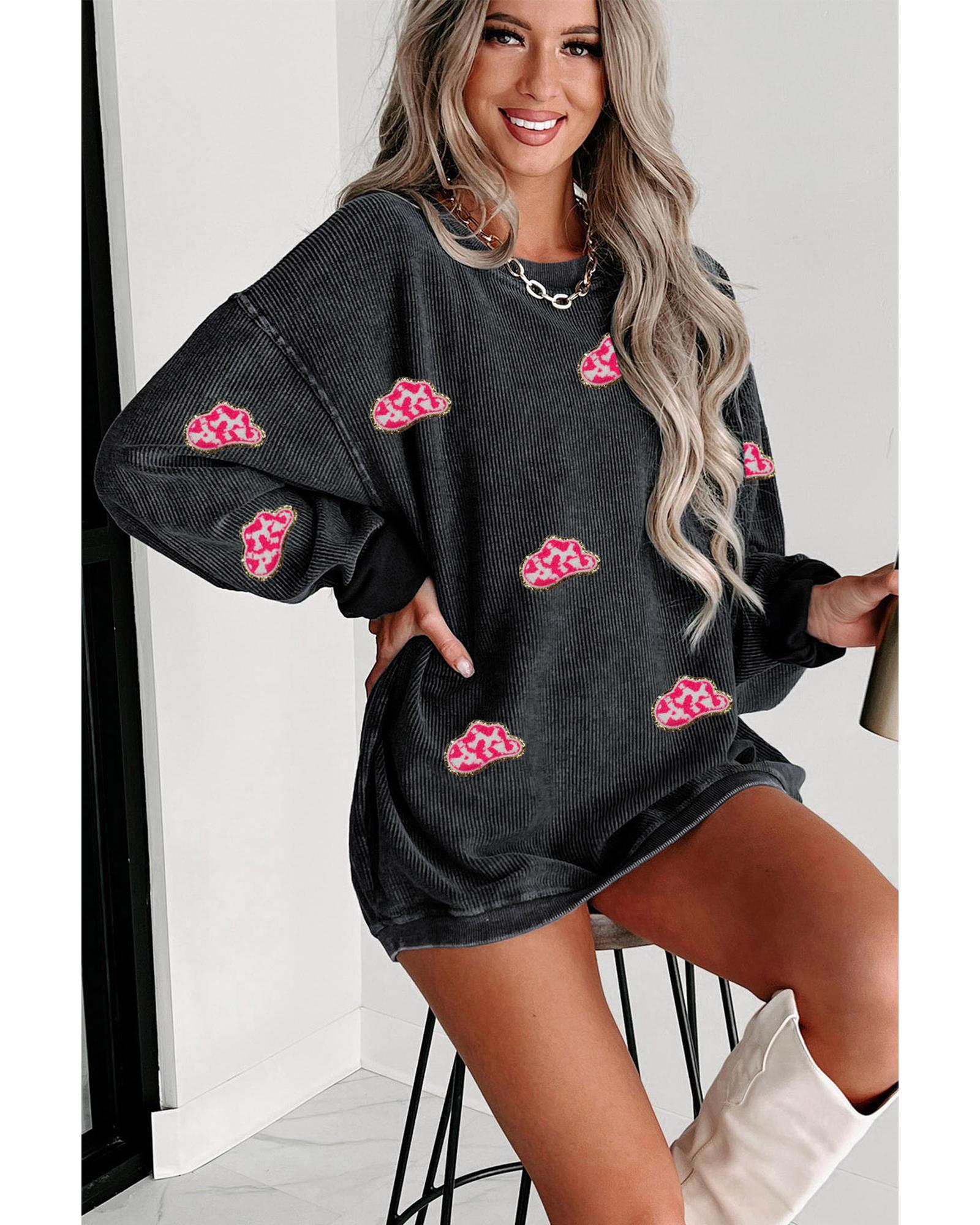 - Black Glittering Cowboy Hat Patched Corded Pullover Sweatshirt