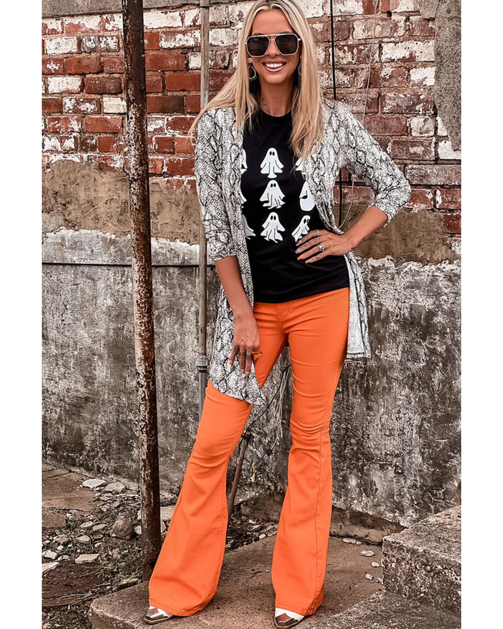 Black Halloween Ghost Graphic Tee Made with high - quality materials Stylish ghost graphic design Perfect for the spooky season Available in multiple sizes Comfortable and trendy Ideal for women