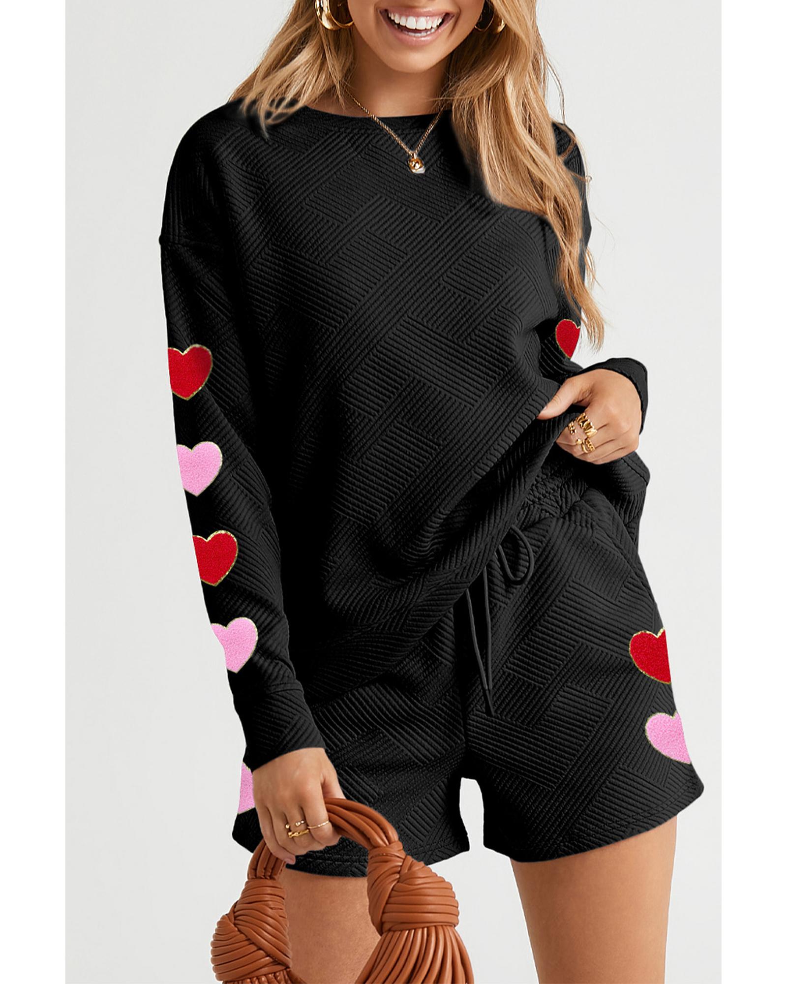 - Black Heart Patch Long Sleeve Top and Shorts Textured 2pcs Set