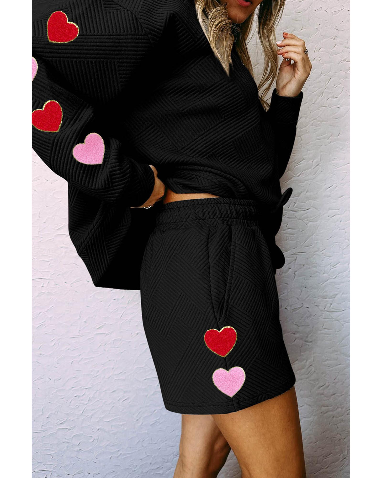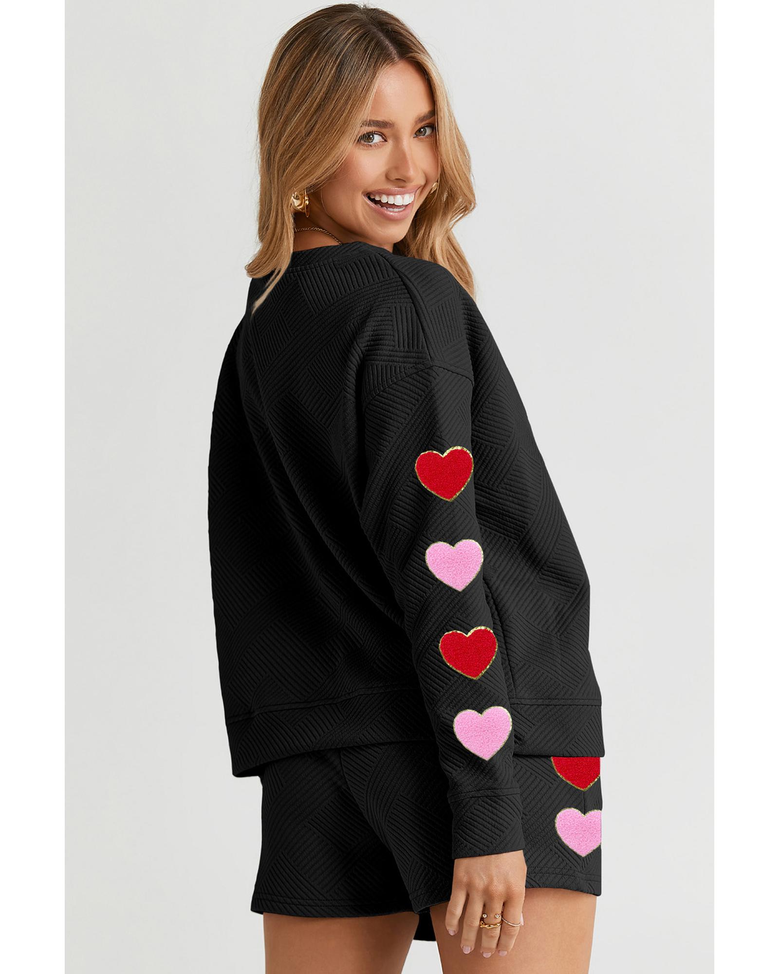 - Black Heart Patch Long Sleeve Top and Shorts Textured 2pcs Set