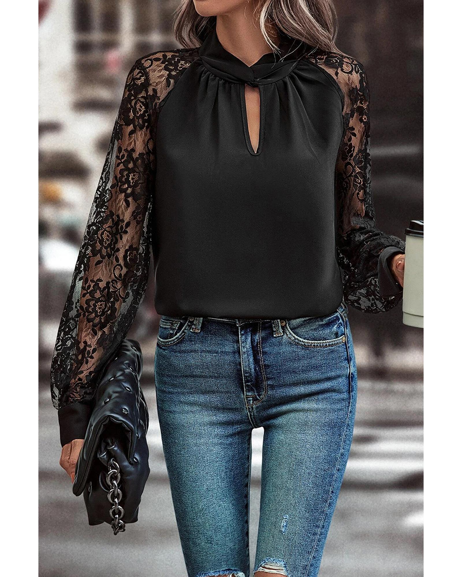 • Black Keyhole Neckline Floral Lace Raglan Sleeve Blouse