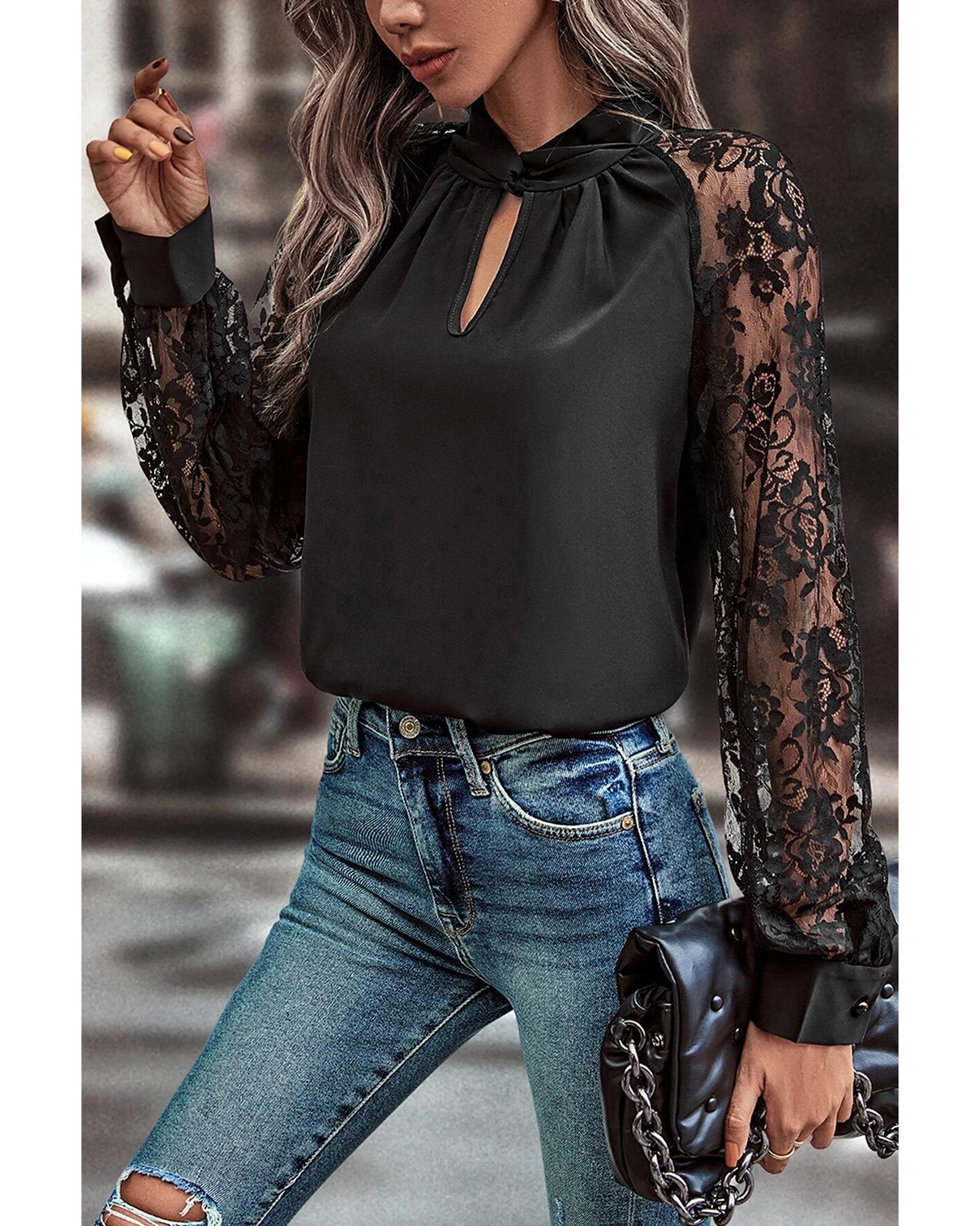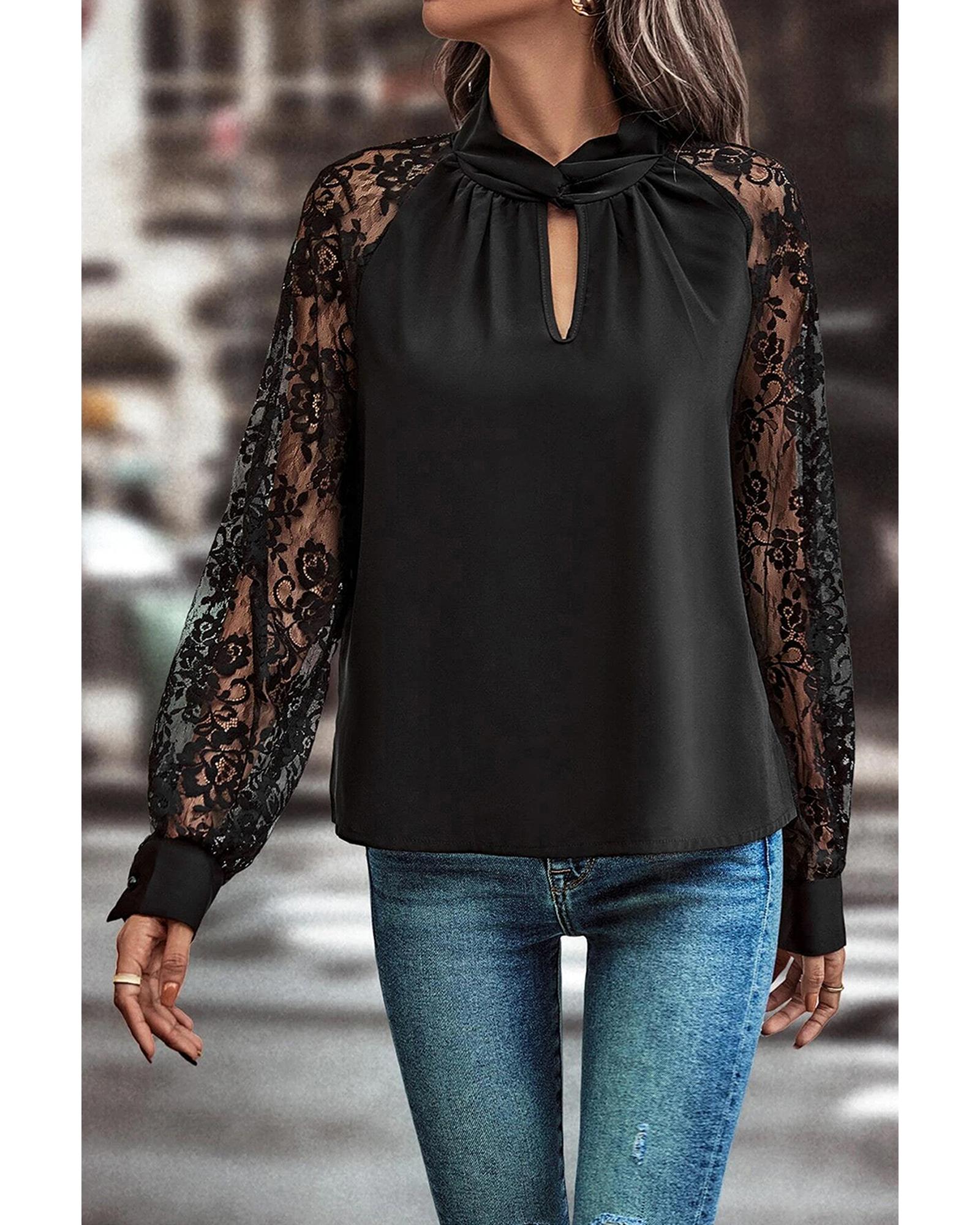 • Black Keyhole Neckline Floral Lace Raglan Sleeve Blouse