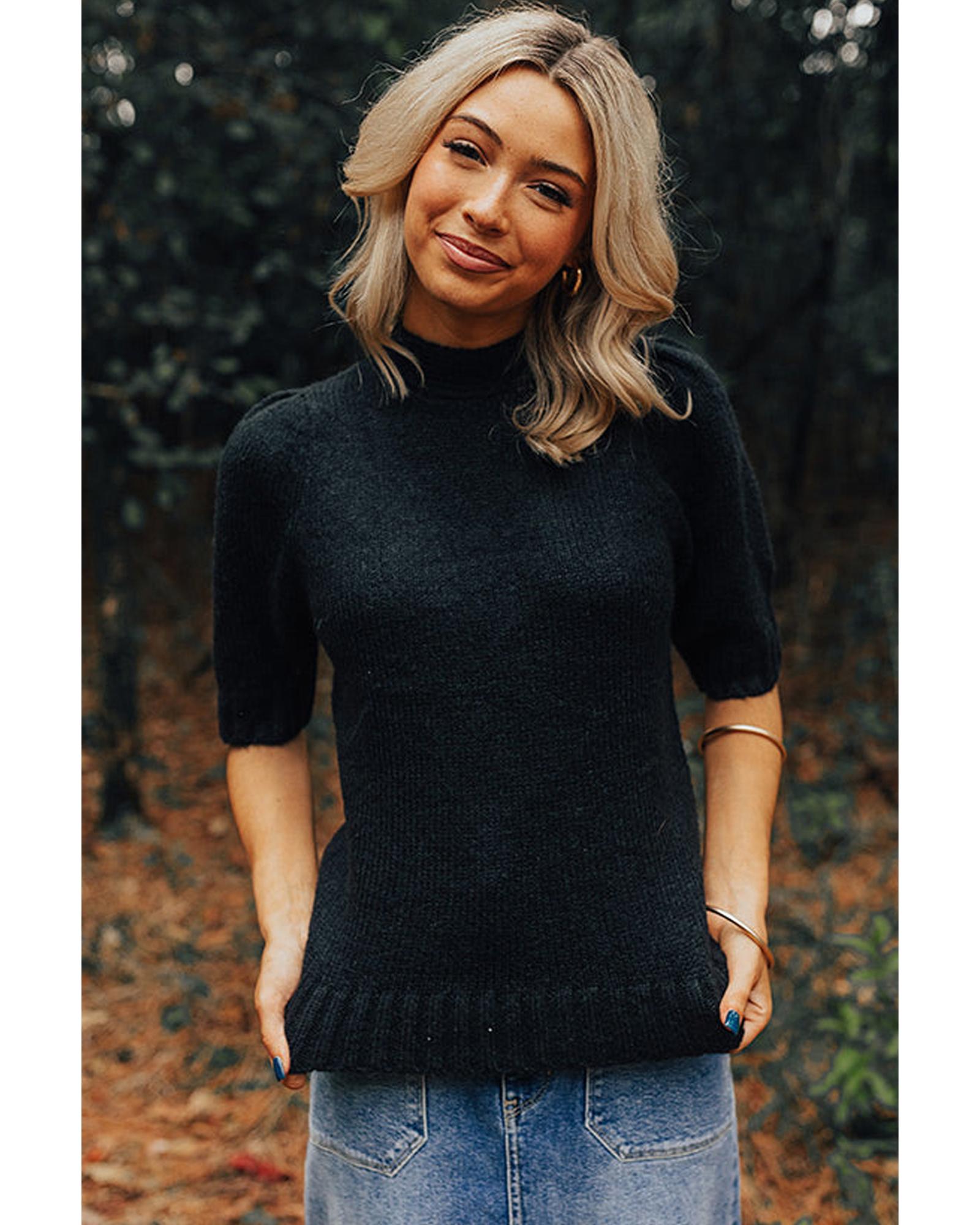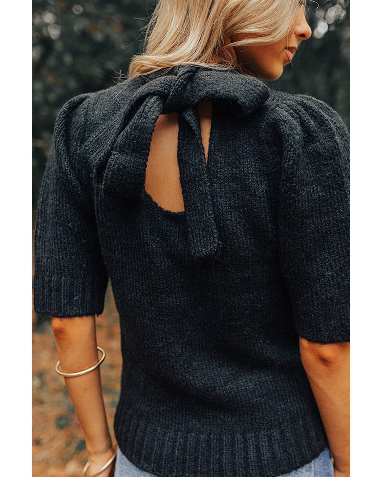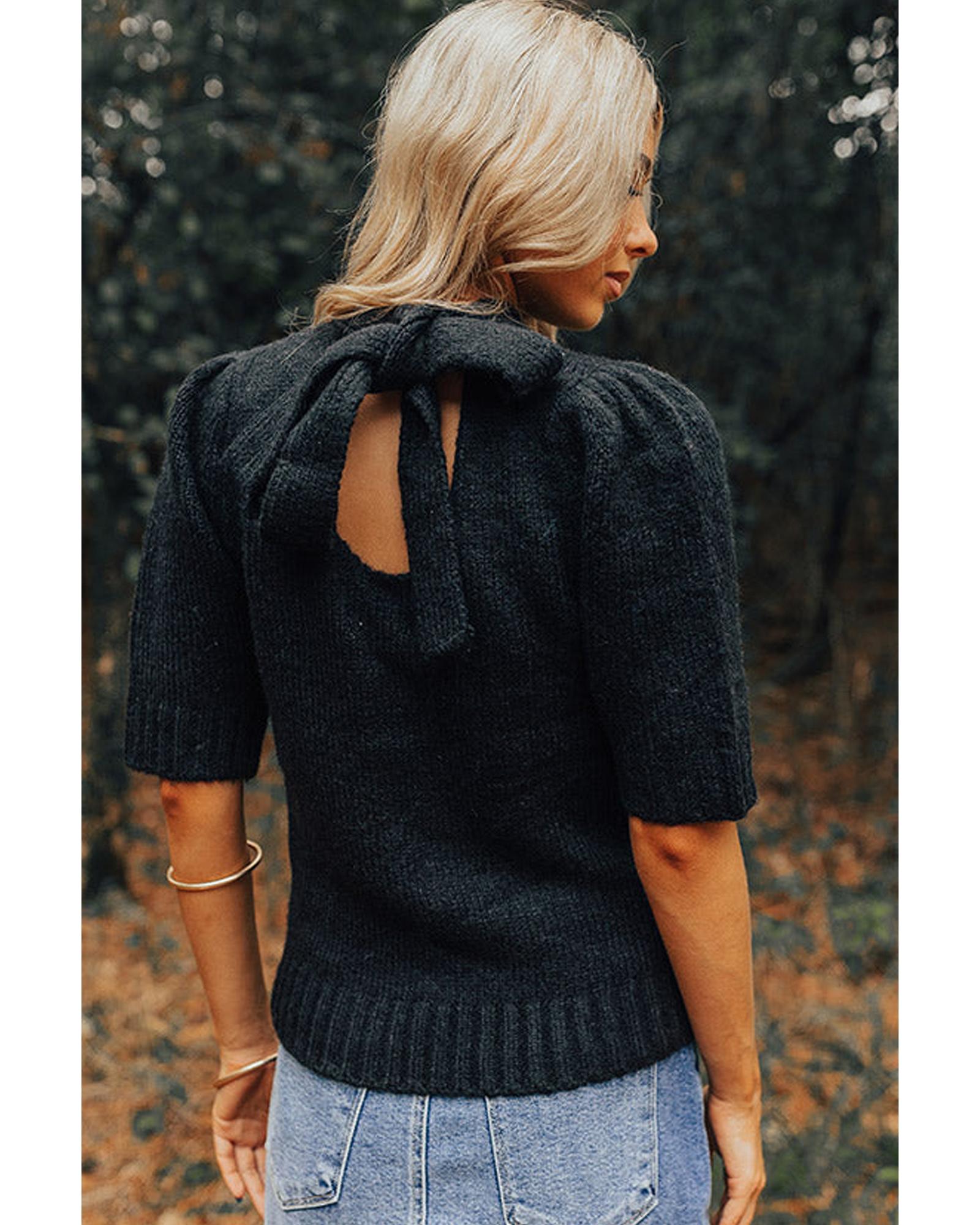 Black Knotted Keyhole Nape Short Sleeve Knit Sweater – S