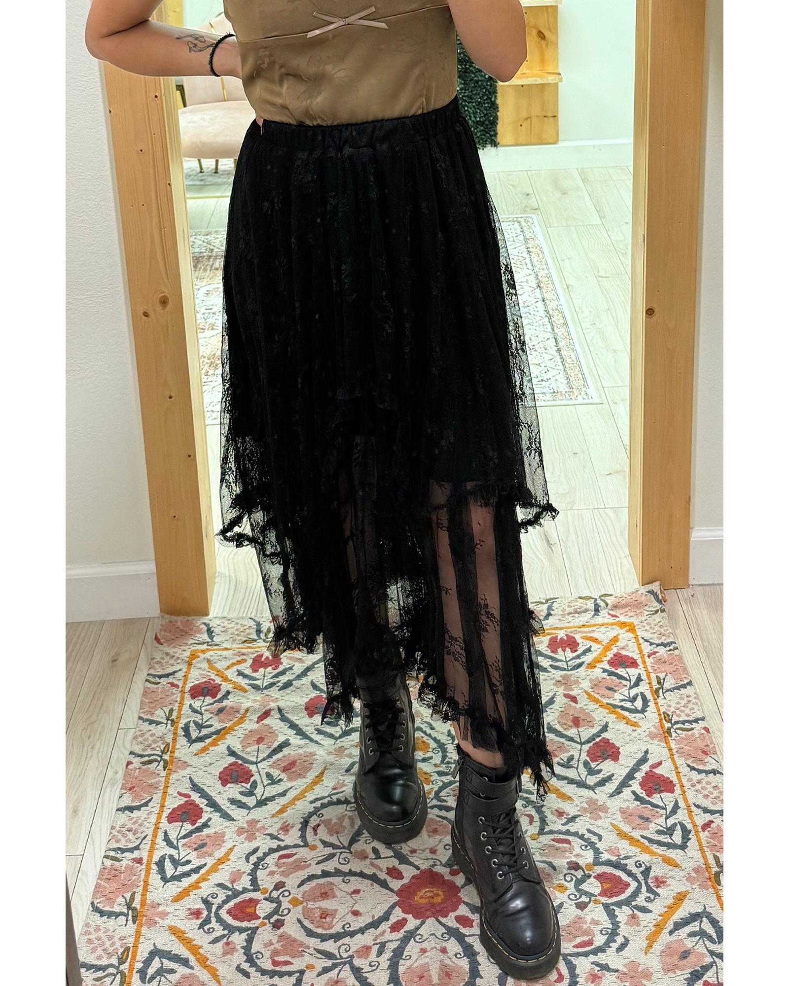 Black Lace Cascading Tiered High Waist Maxi Skirt – L