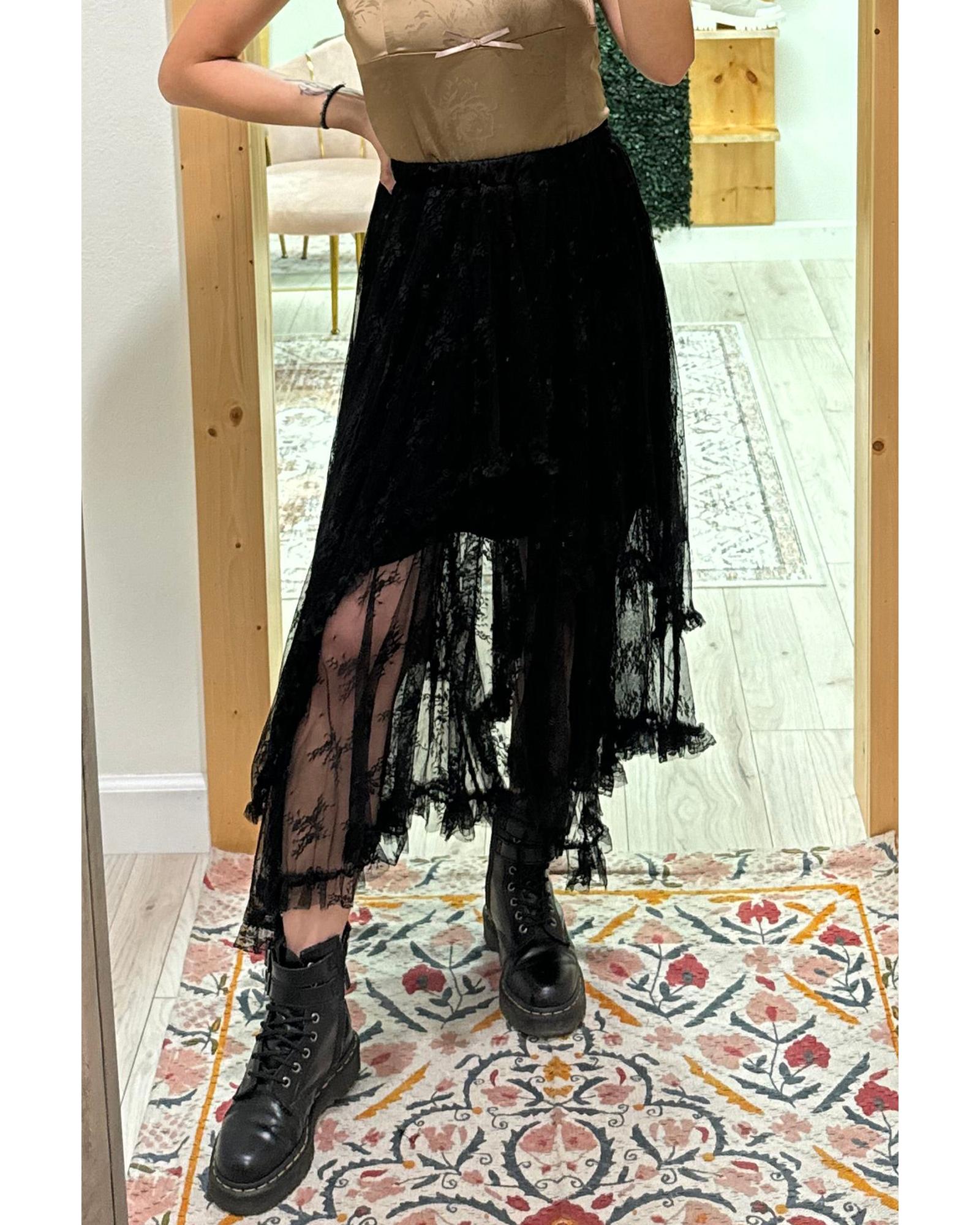 Black Lace Cascading Tiered High Waist Maxi Skirt – XL
