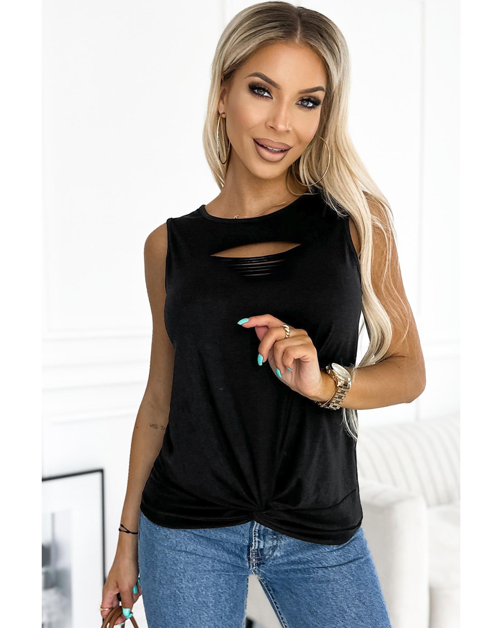Black Laser Cut Slits Twist Front Tank Top – S