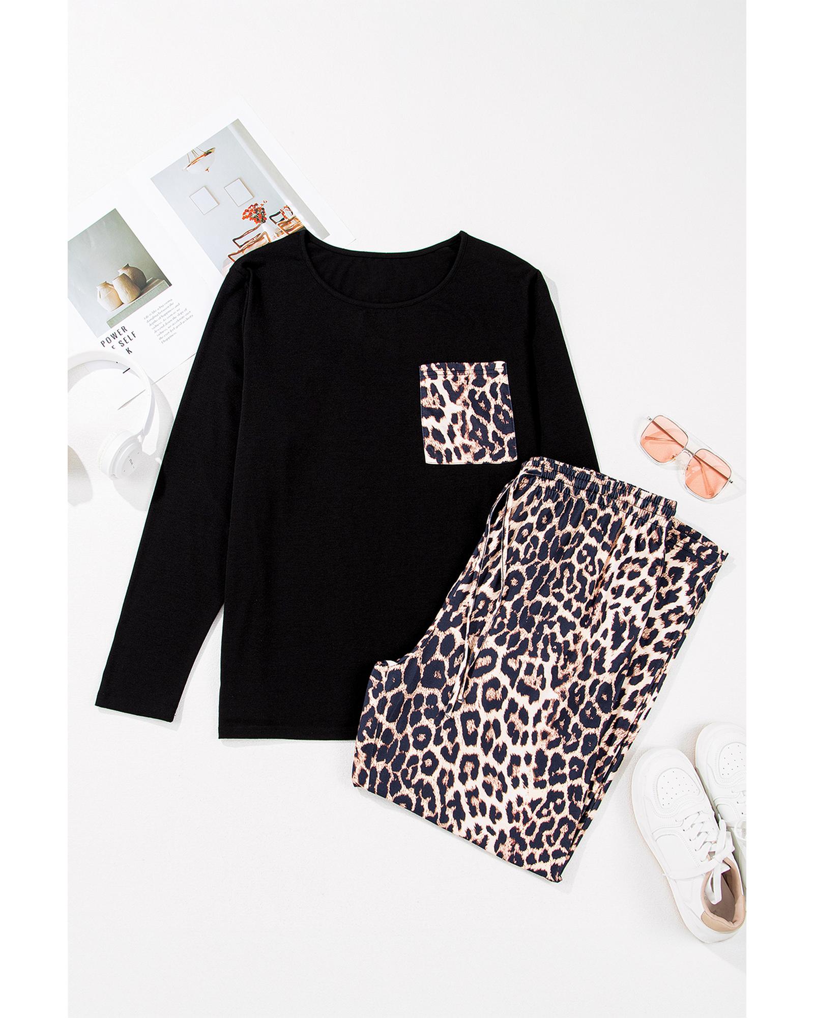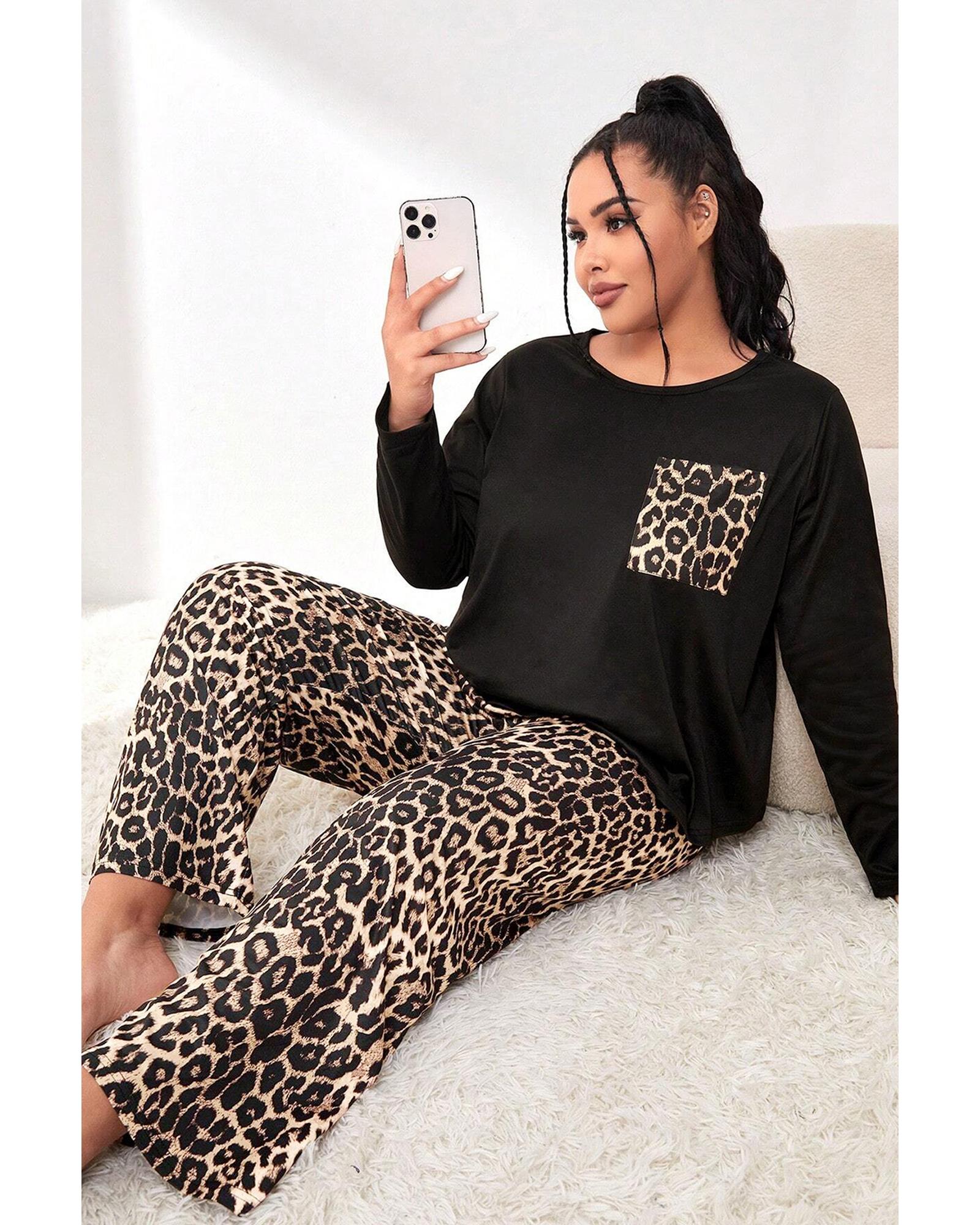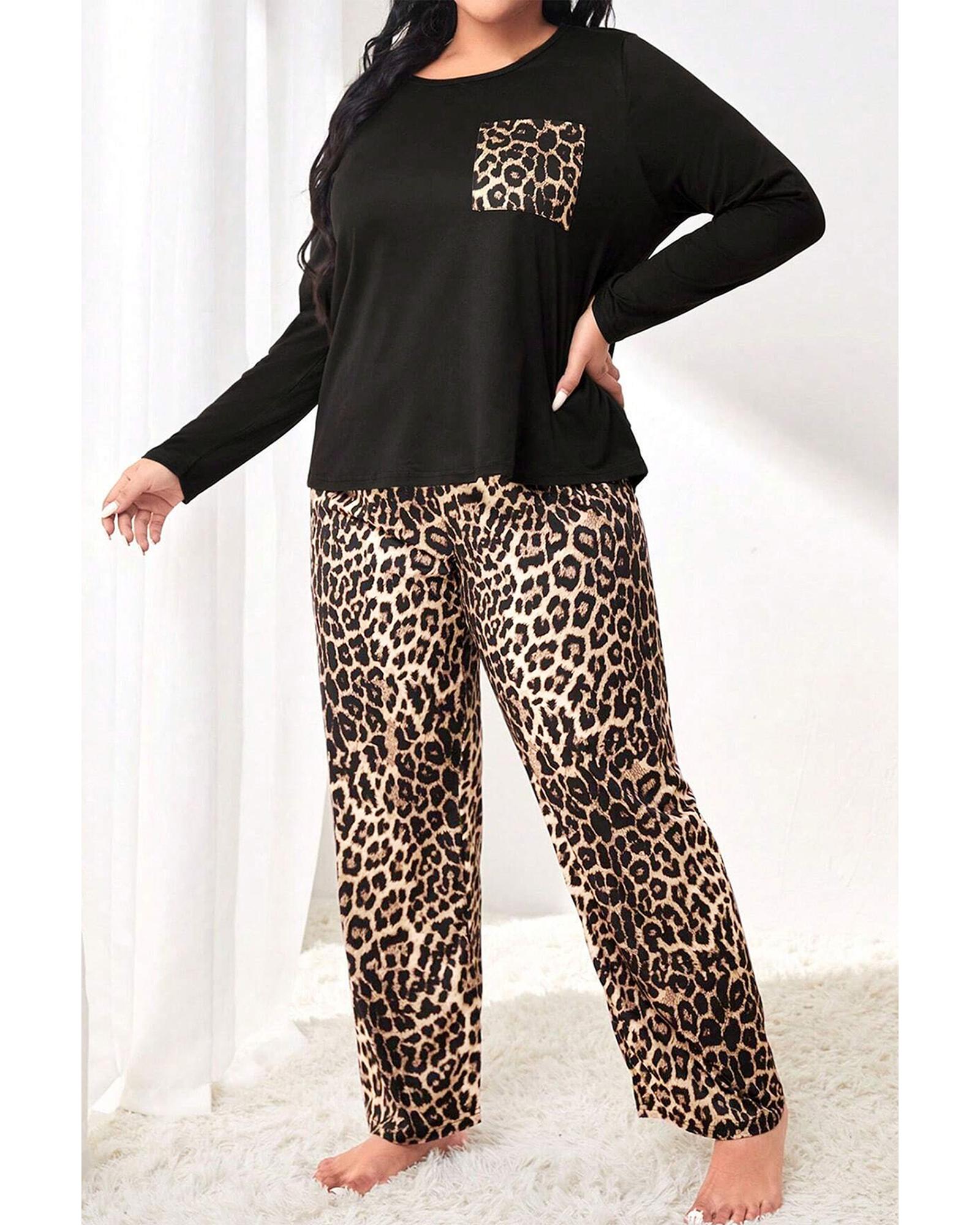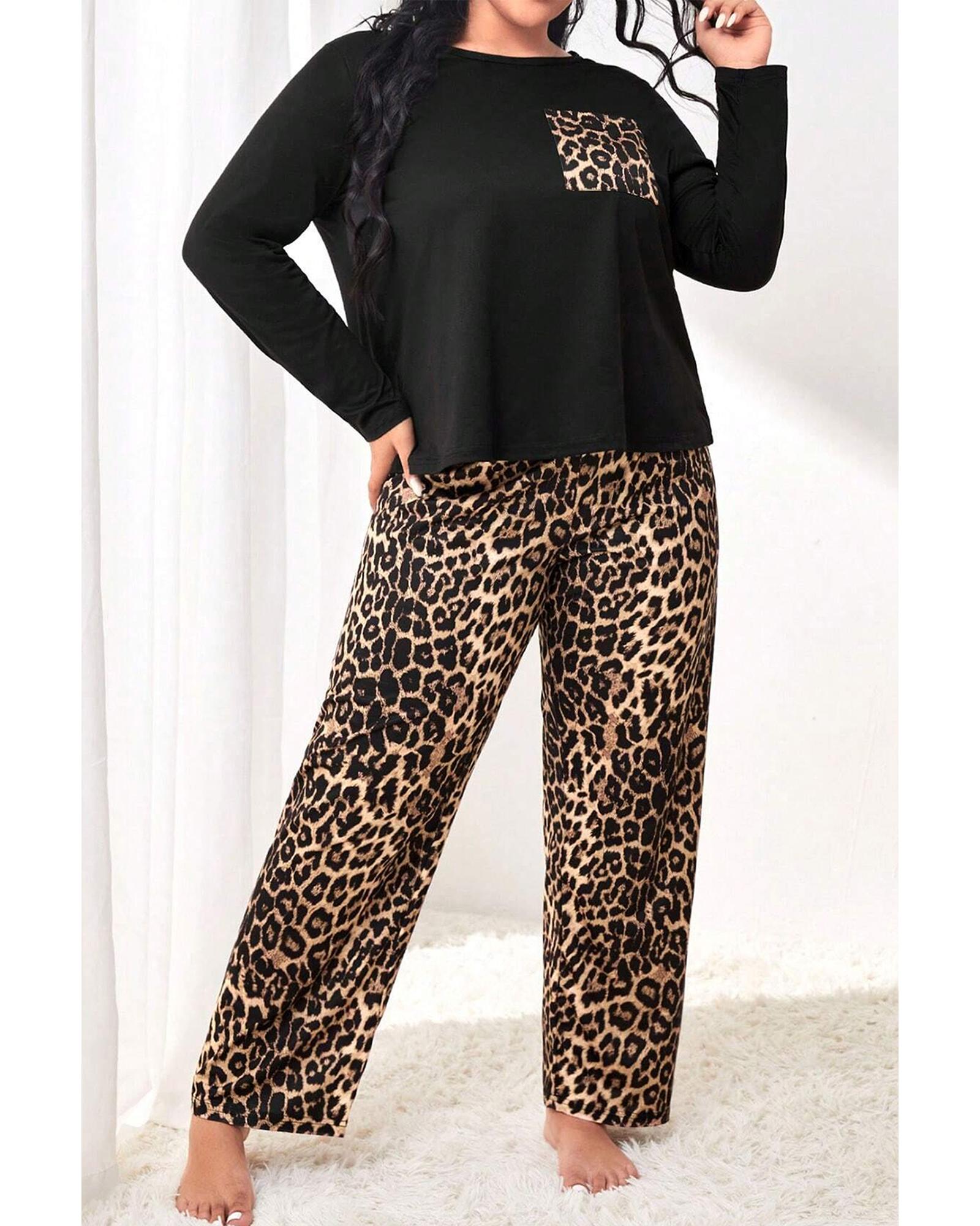 Black Leopard Patched Pocket Long Sleeve Top Plus Size Pants Set – 4X