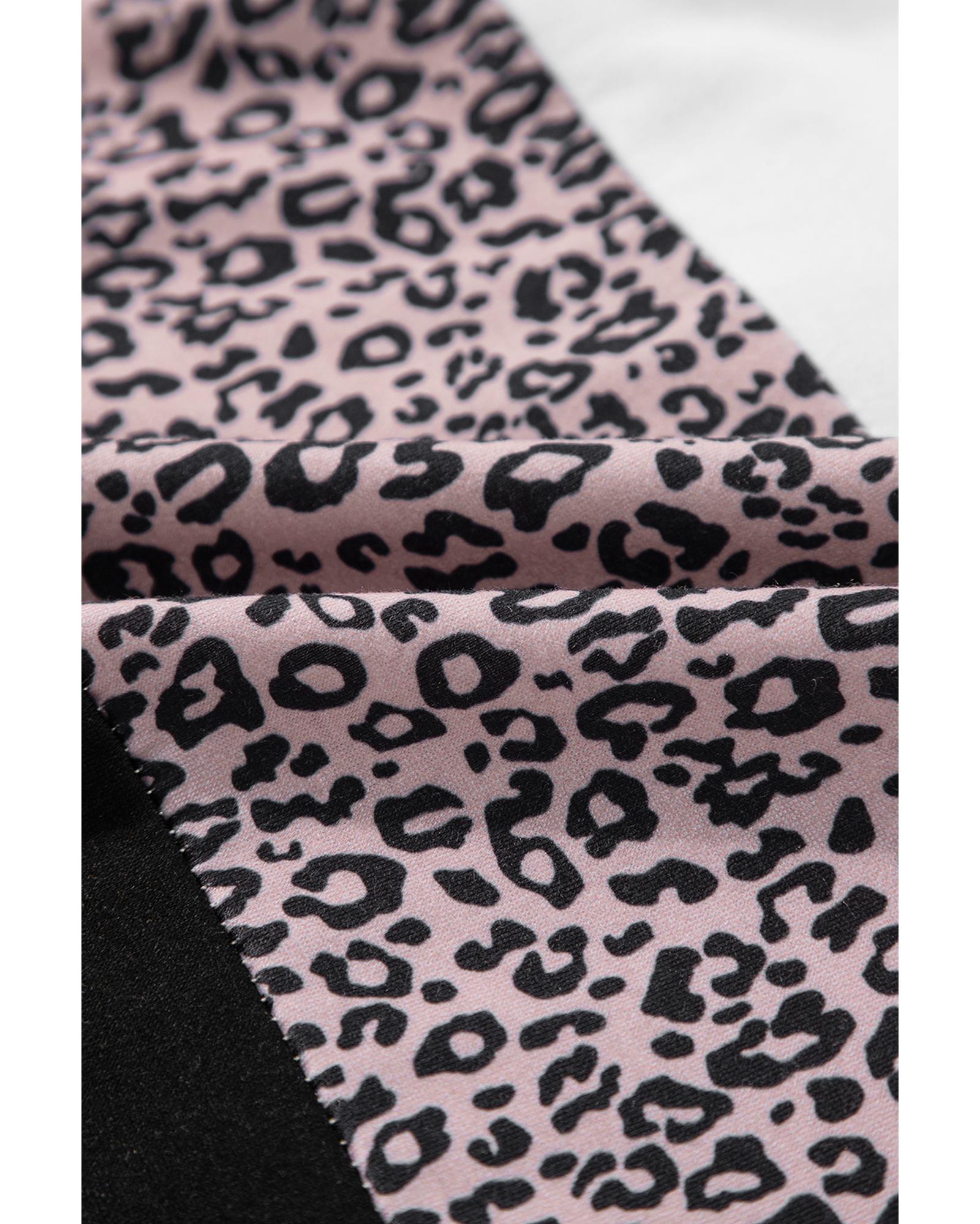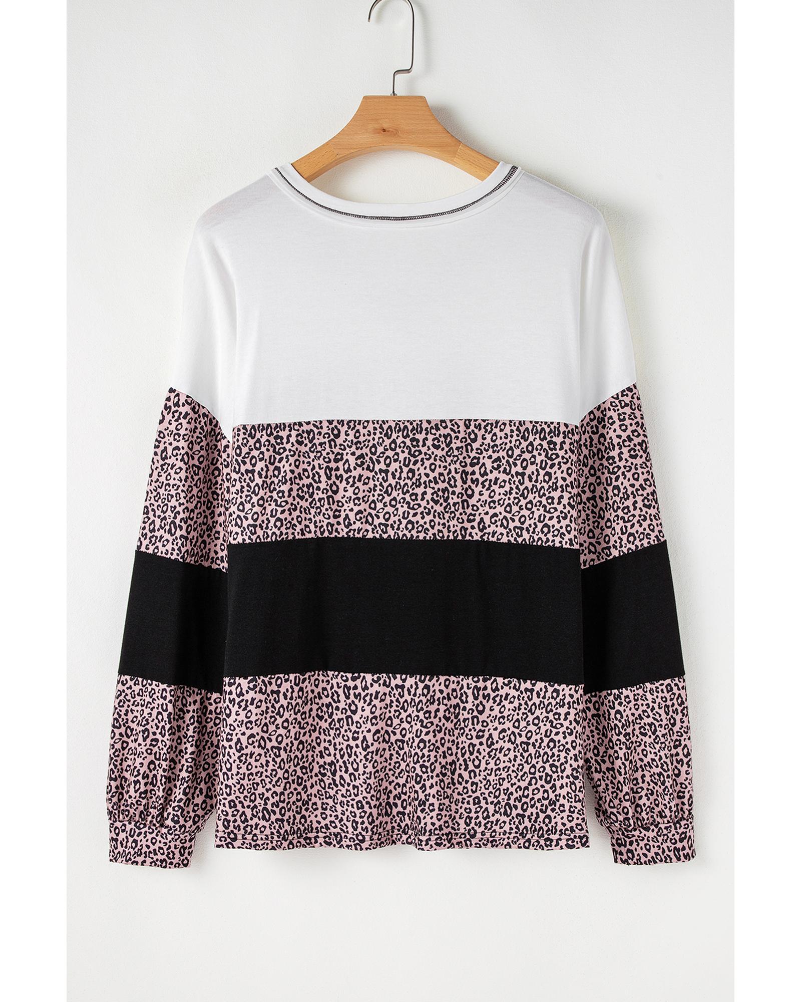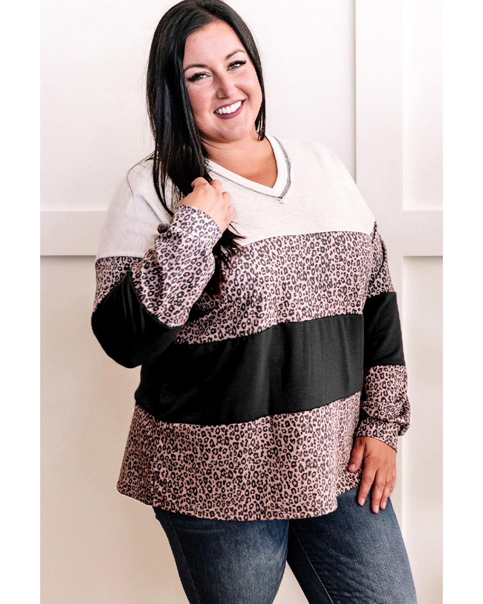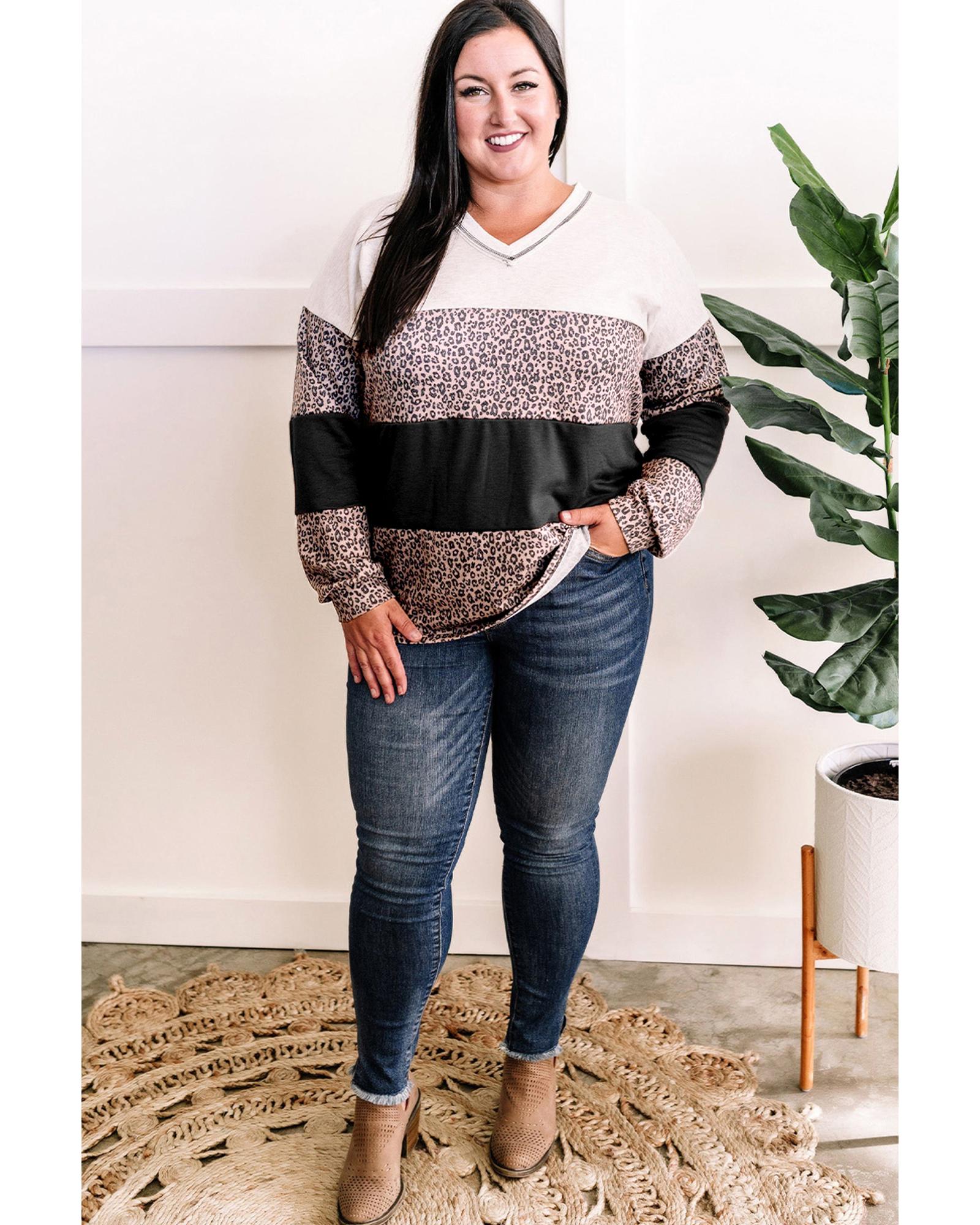 Black Leopard Print Colorblock V Neck Long Sleeve Plus Size Top – 1X