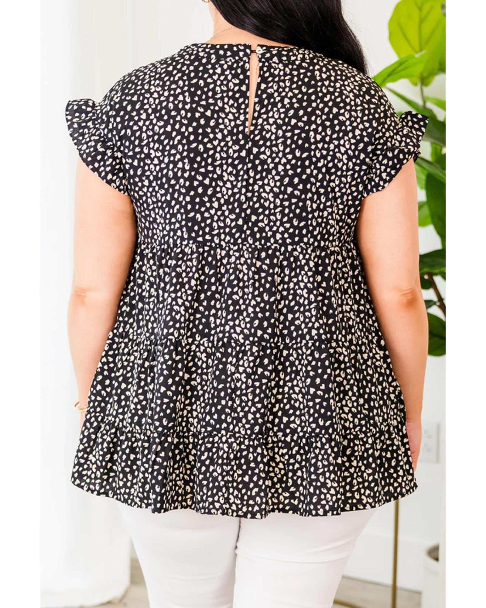 Black Leopard Print Ruffled Short Sleeve Keyhole Back Tiered Flowy Plus Size Blouse – 4X