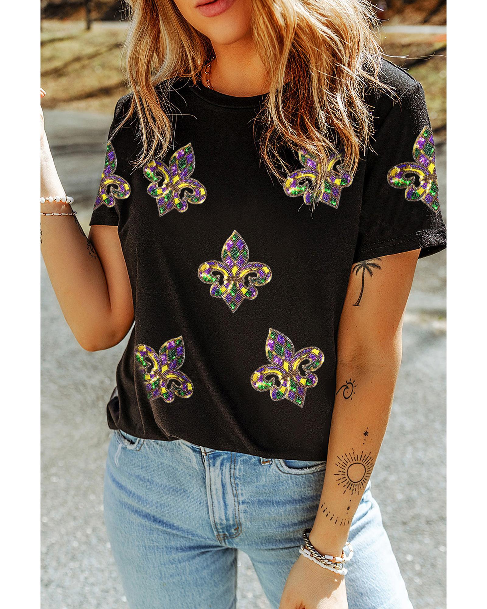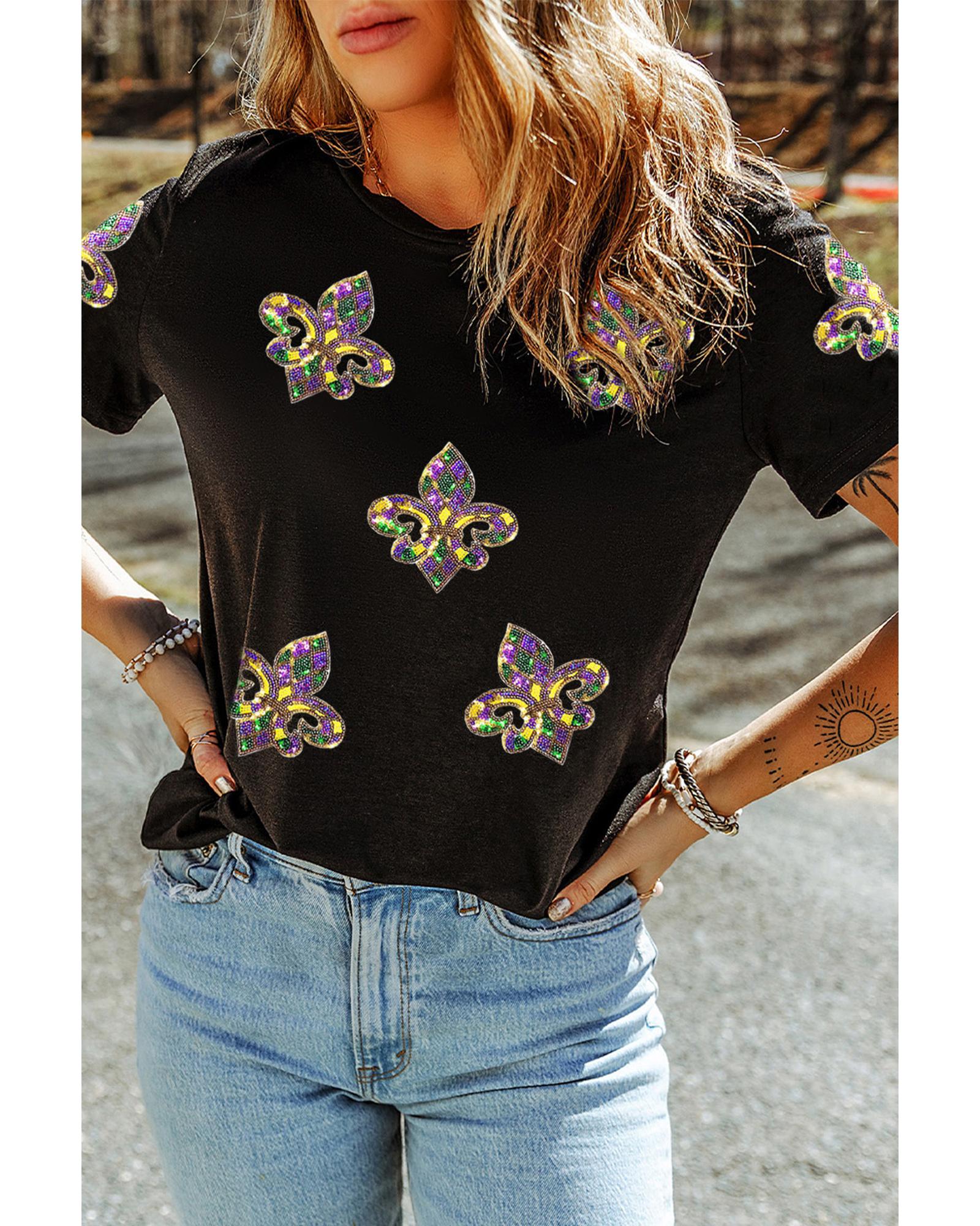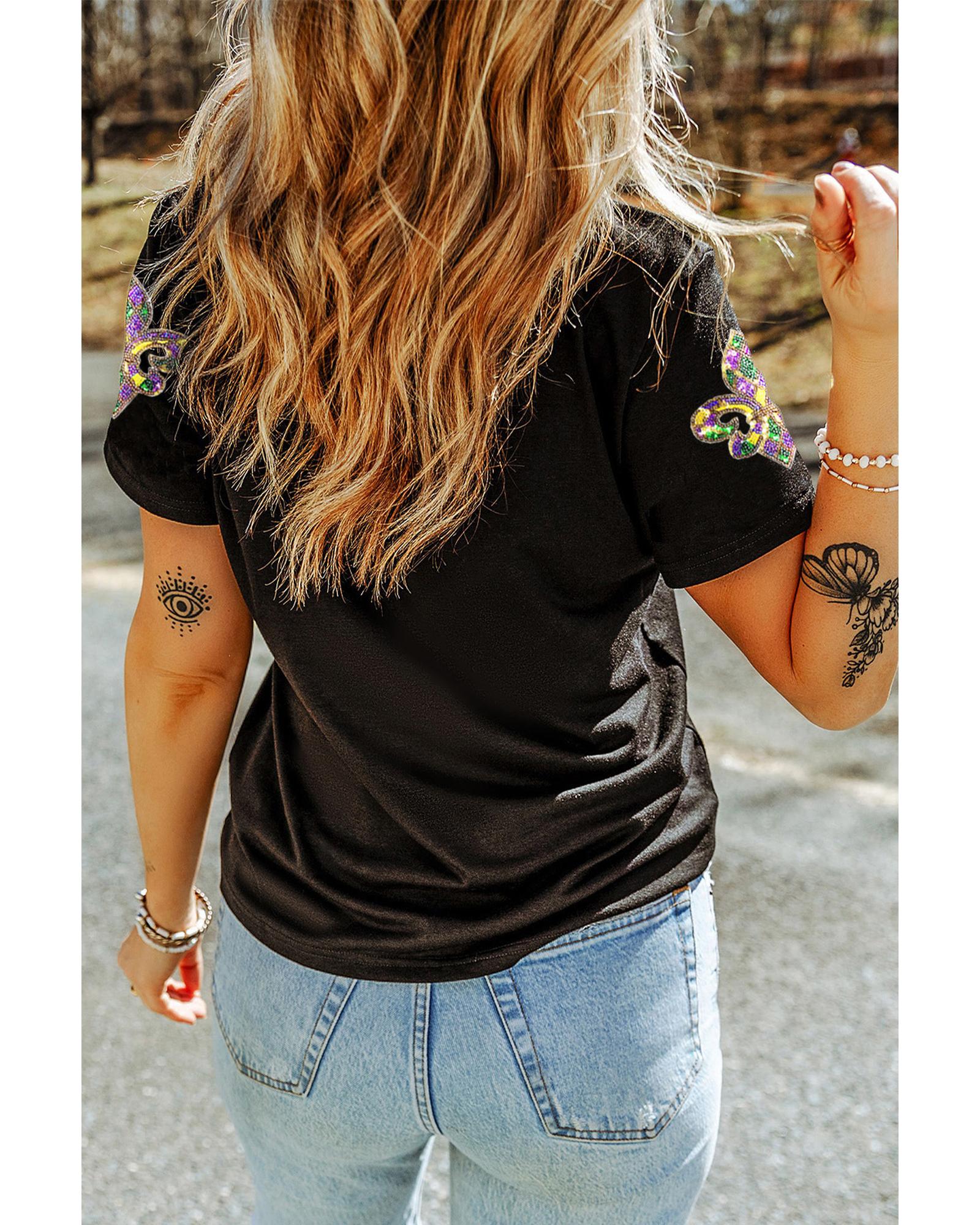 Black Maid Gras Sequin Fleur de Lis Graphic T Shirt – XL