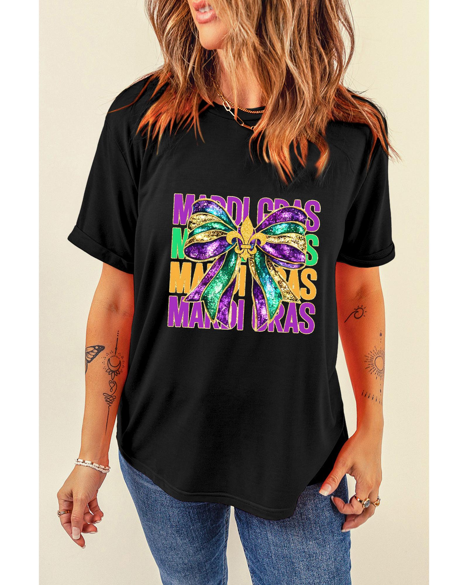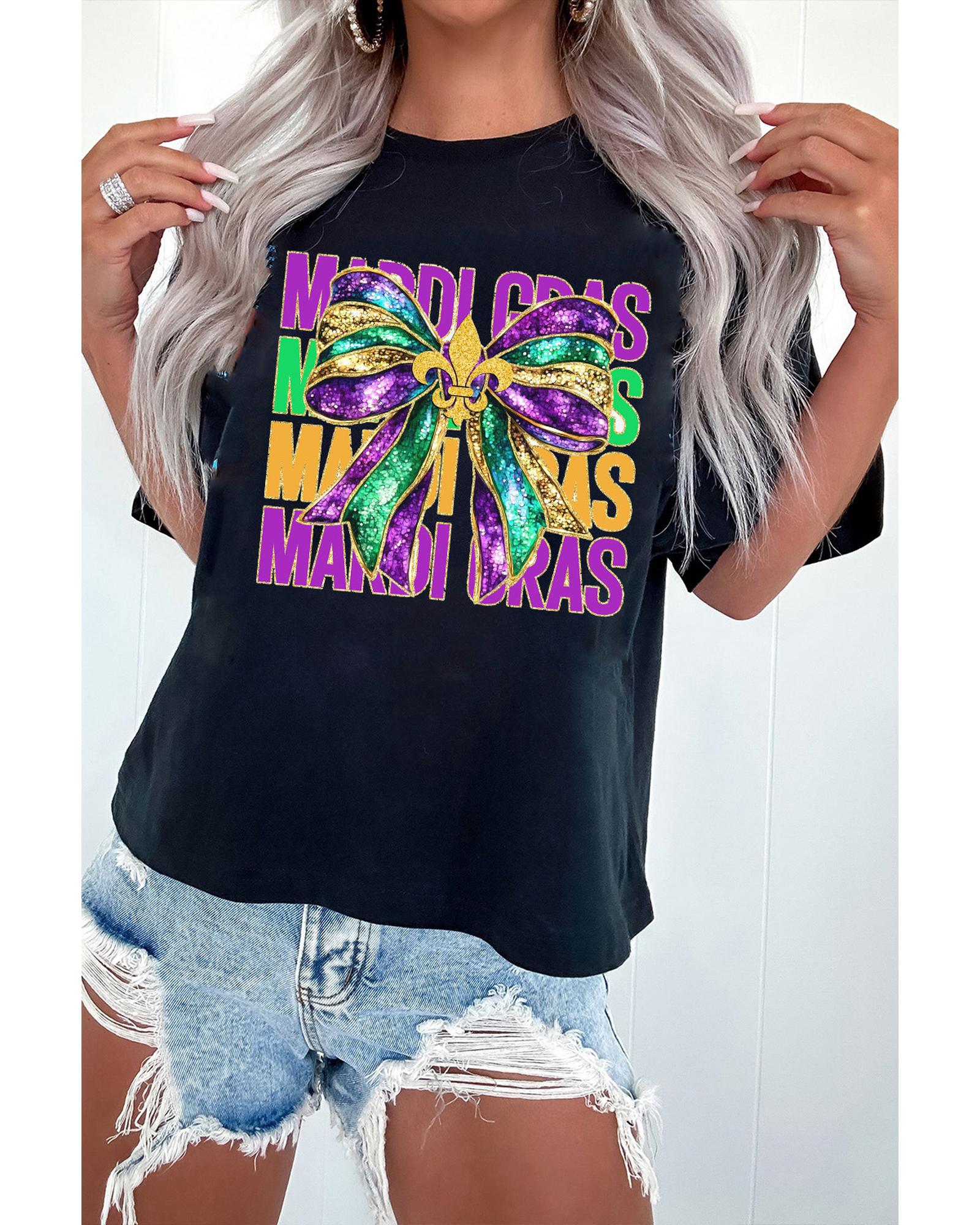 - Black MARDI GRAS Fleur de Lis Bowknot Printed Crewneck Tee
