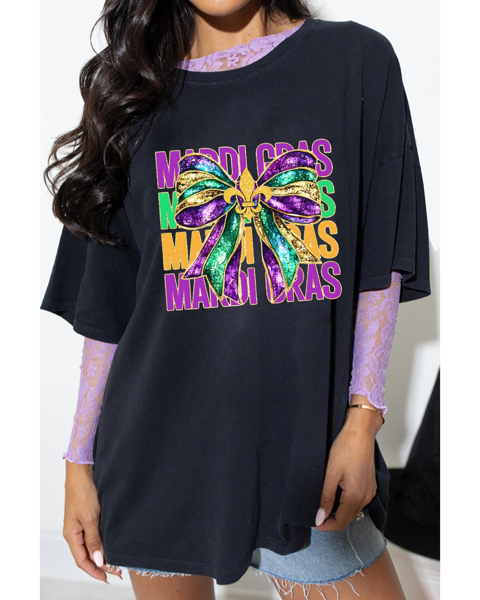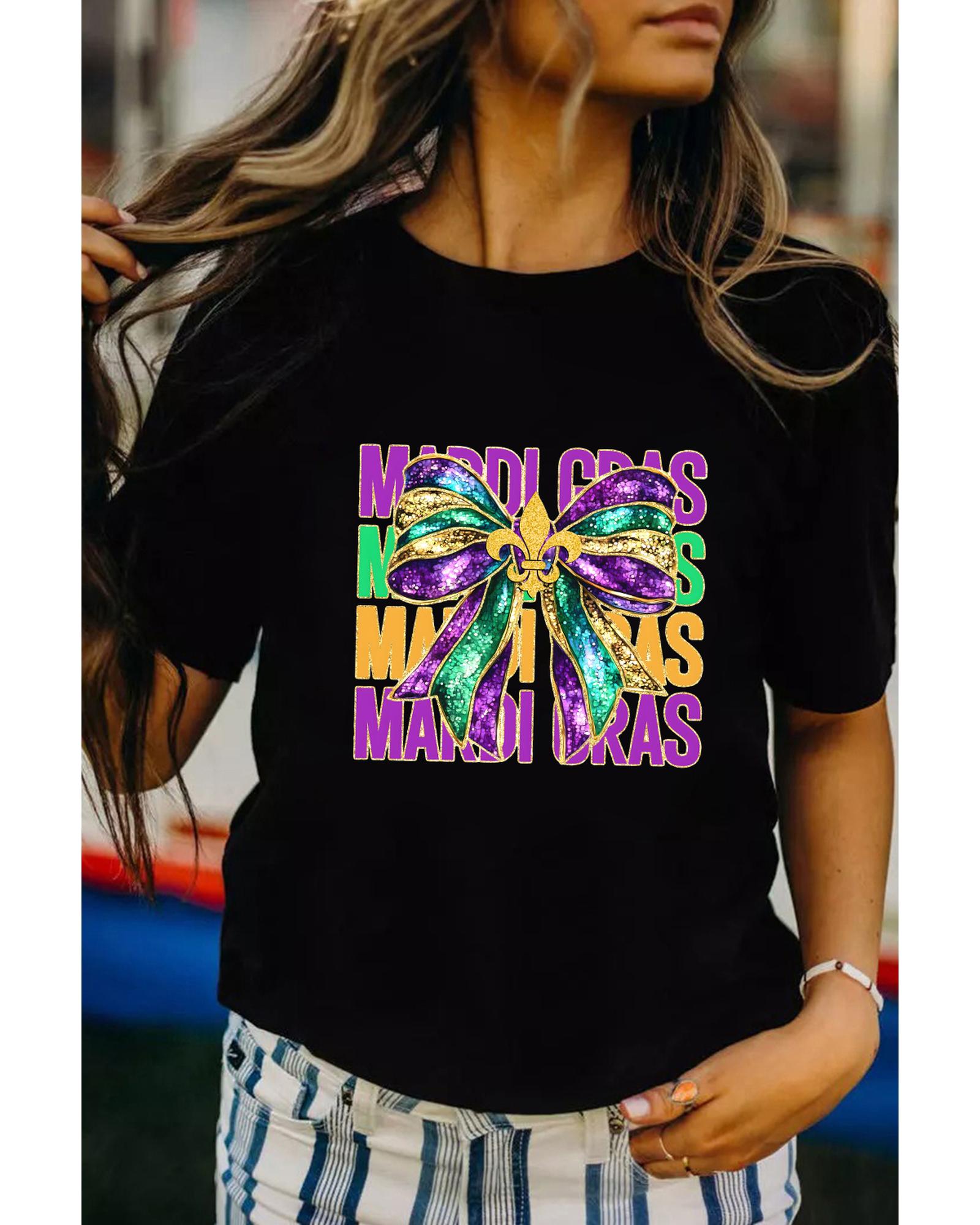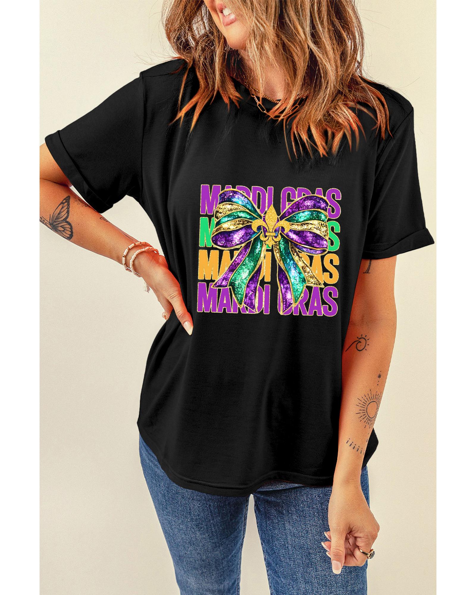 • Black MARDI GRAS Fleur de Lis Bowknot Printed Crewneck Tee