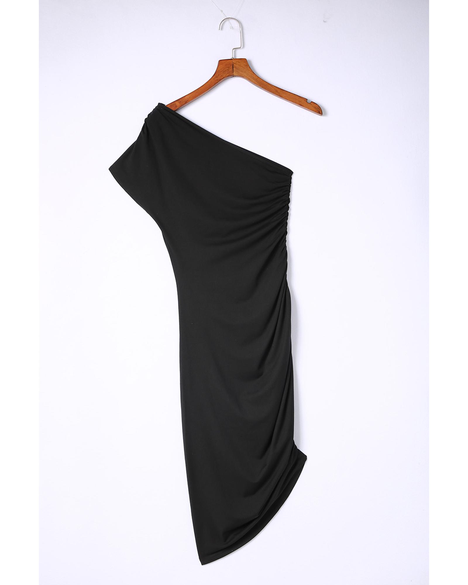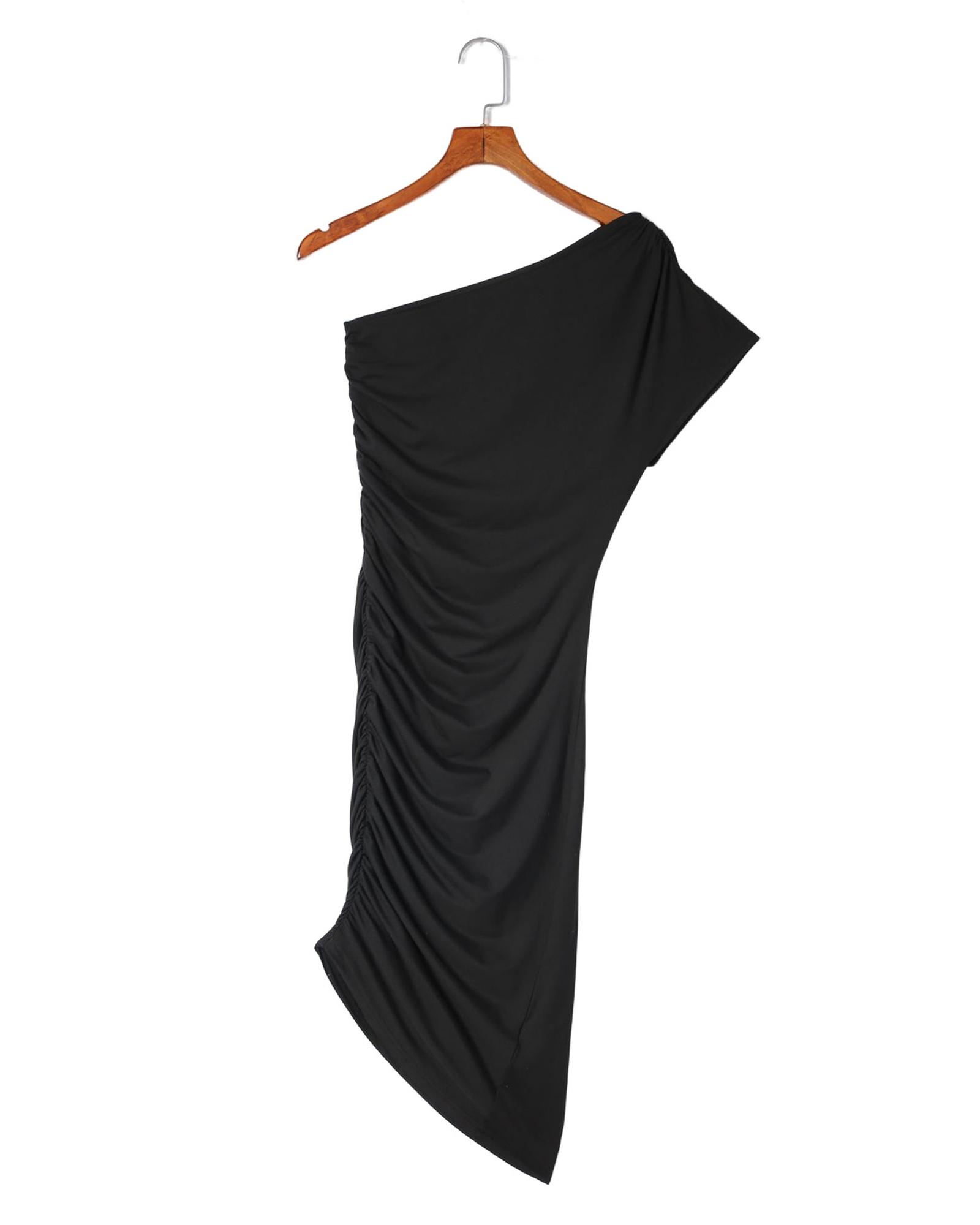 Black One-shoulder Short Sleeve Ruched Bodycon Dress – L