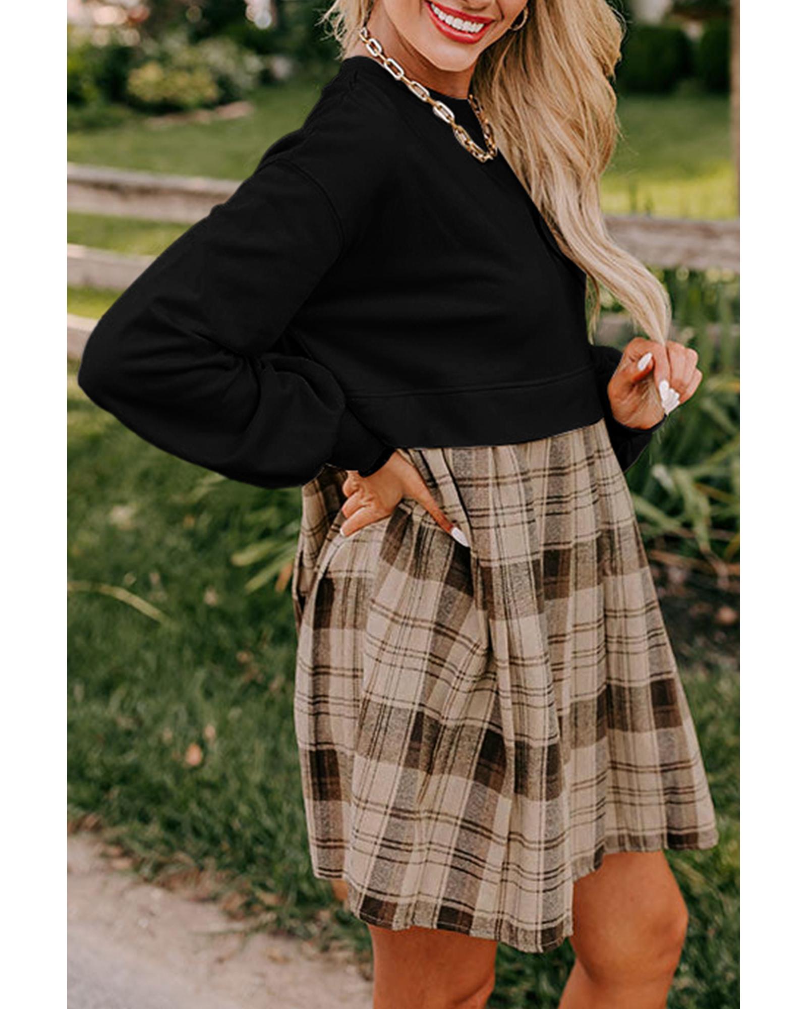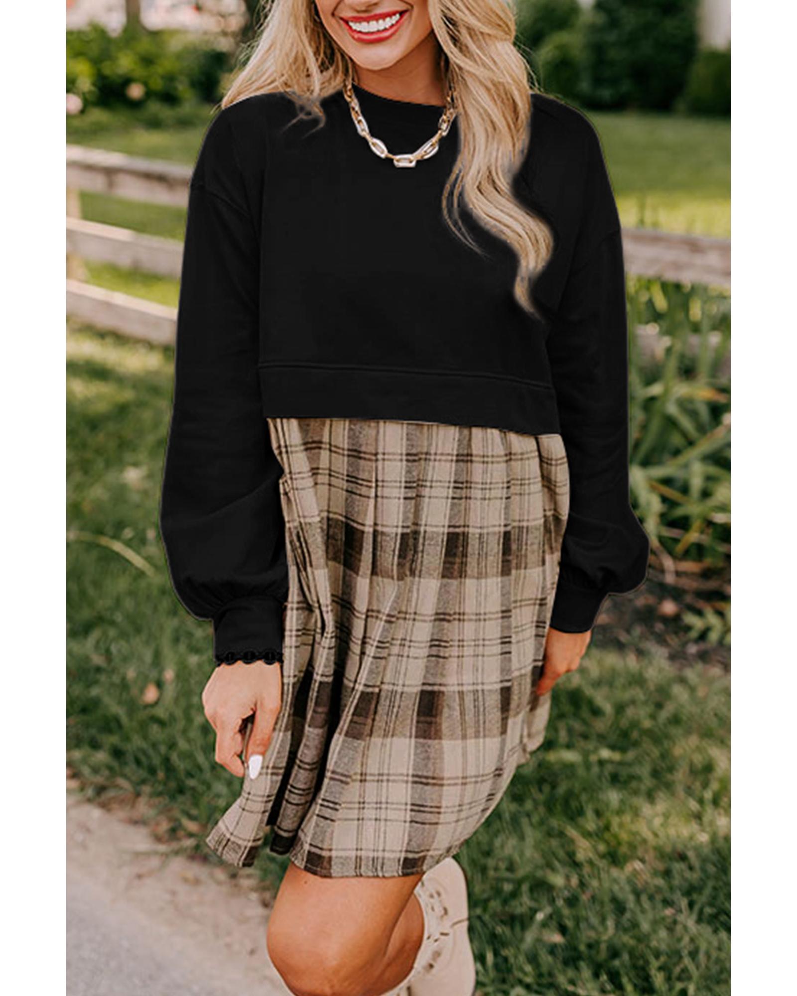 Black Plaid Patchwork High Waist Sweatshirt Mini Dress - S
