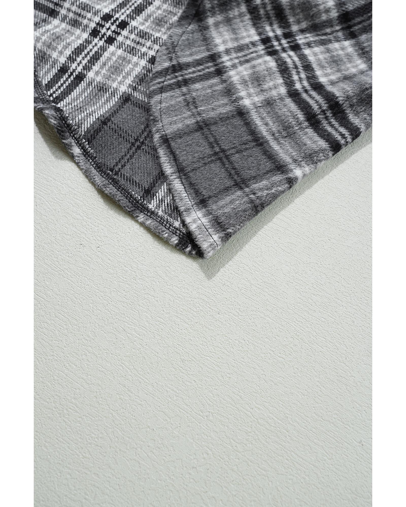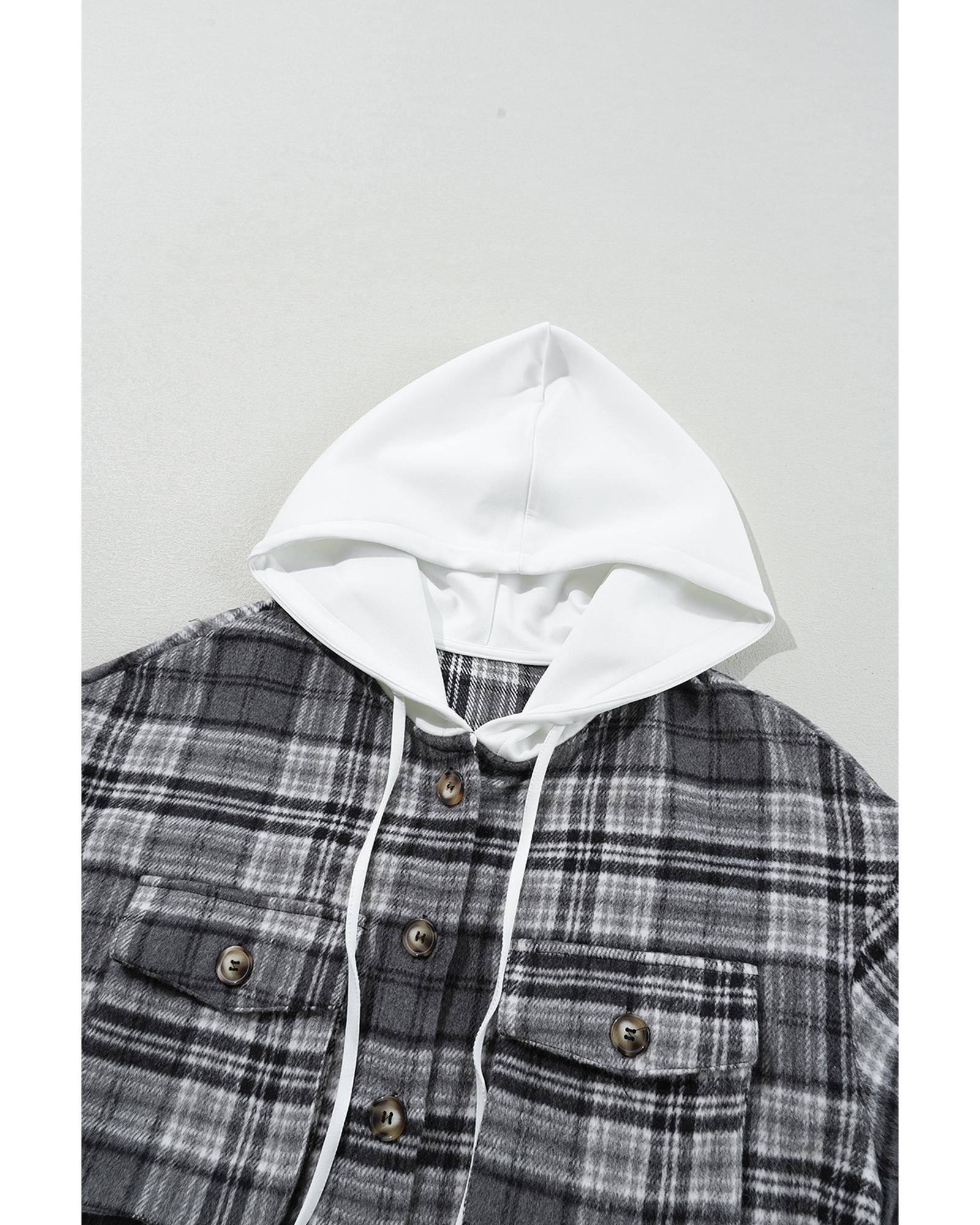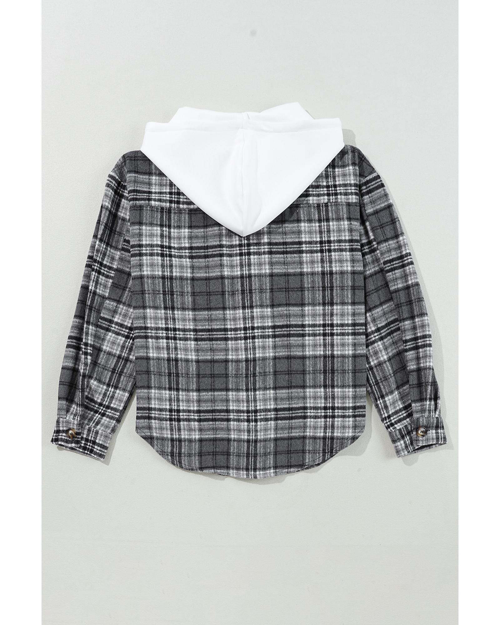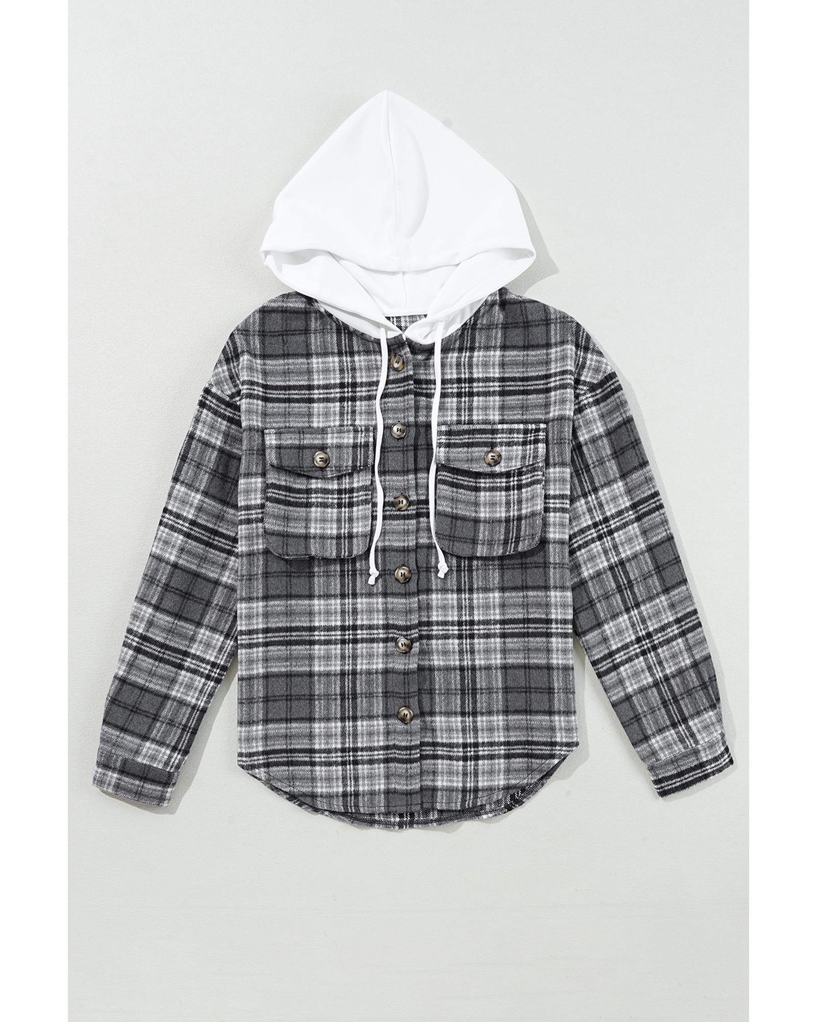 Black Plaid Print Flap Pockets Contrast Hooded Loose Shacket – XL