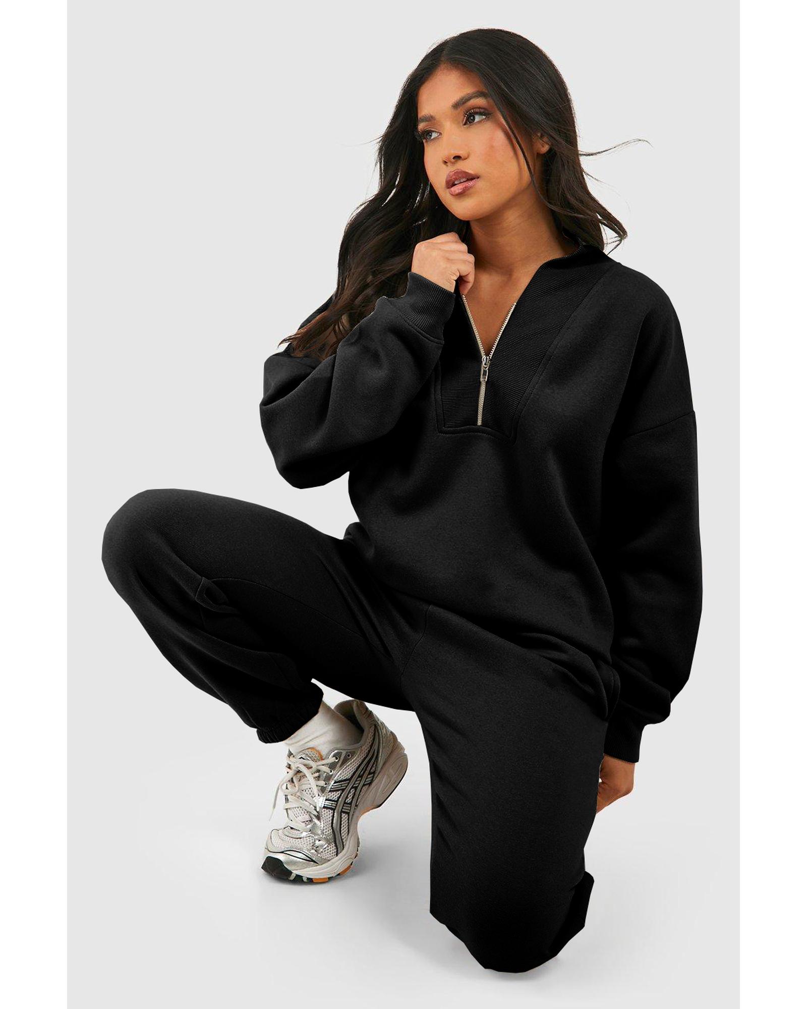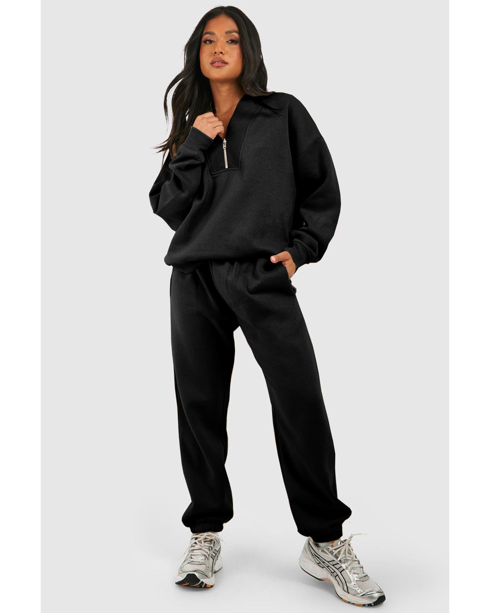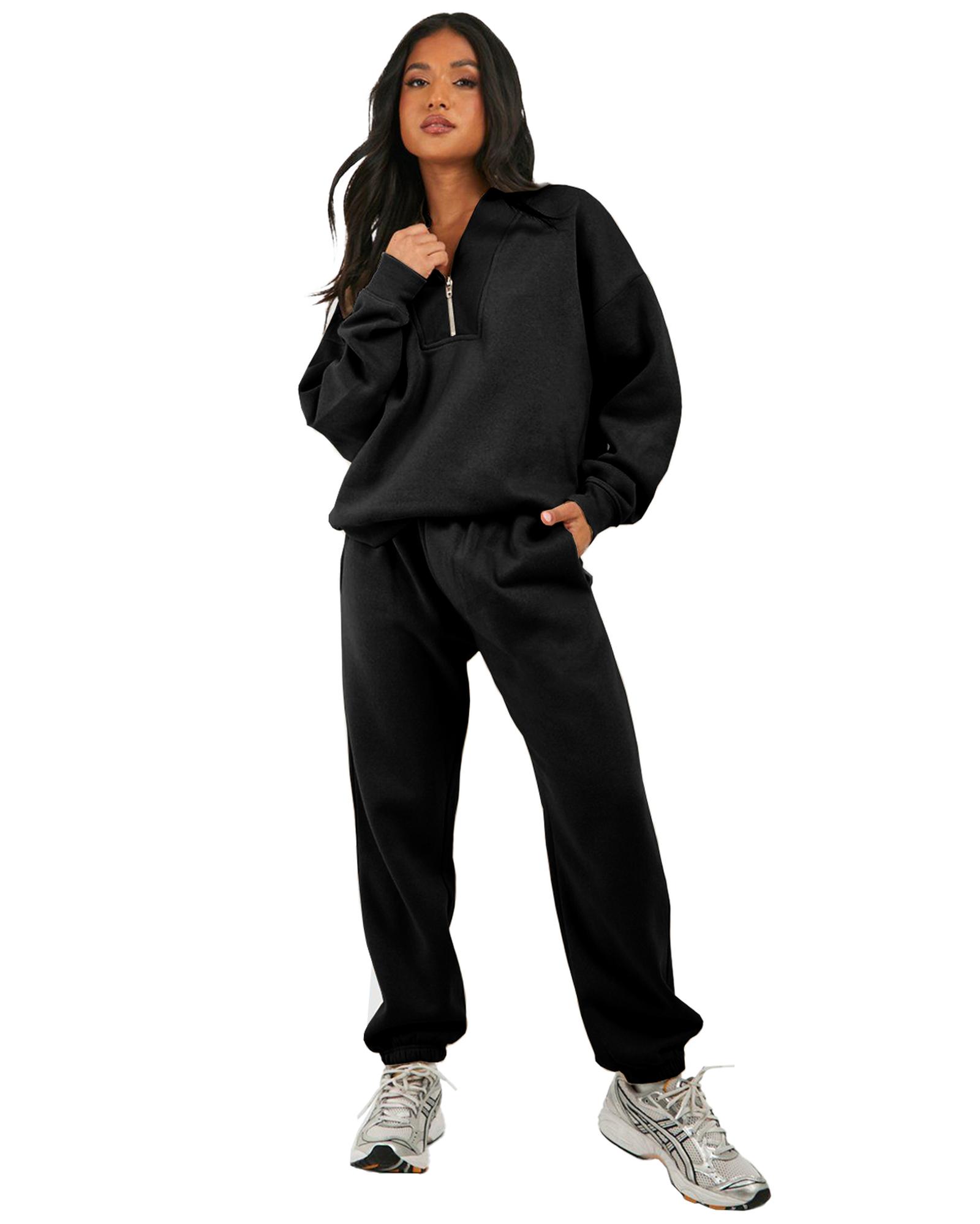 Black Plain Half Zip V Neck Ribbed Edge Loose Tracksuit – 2XL