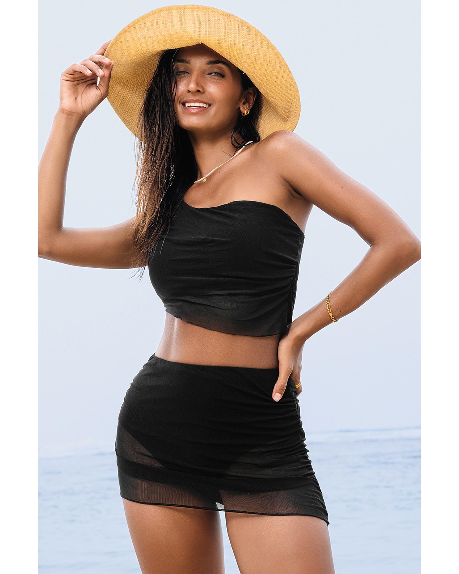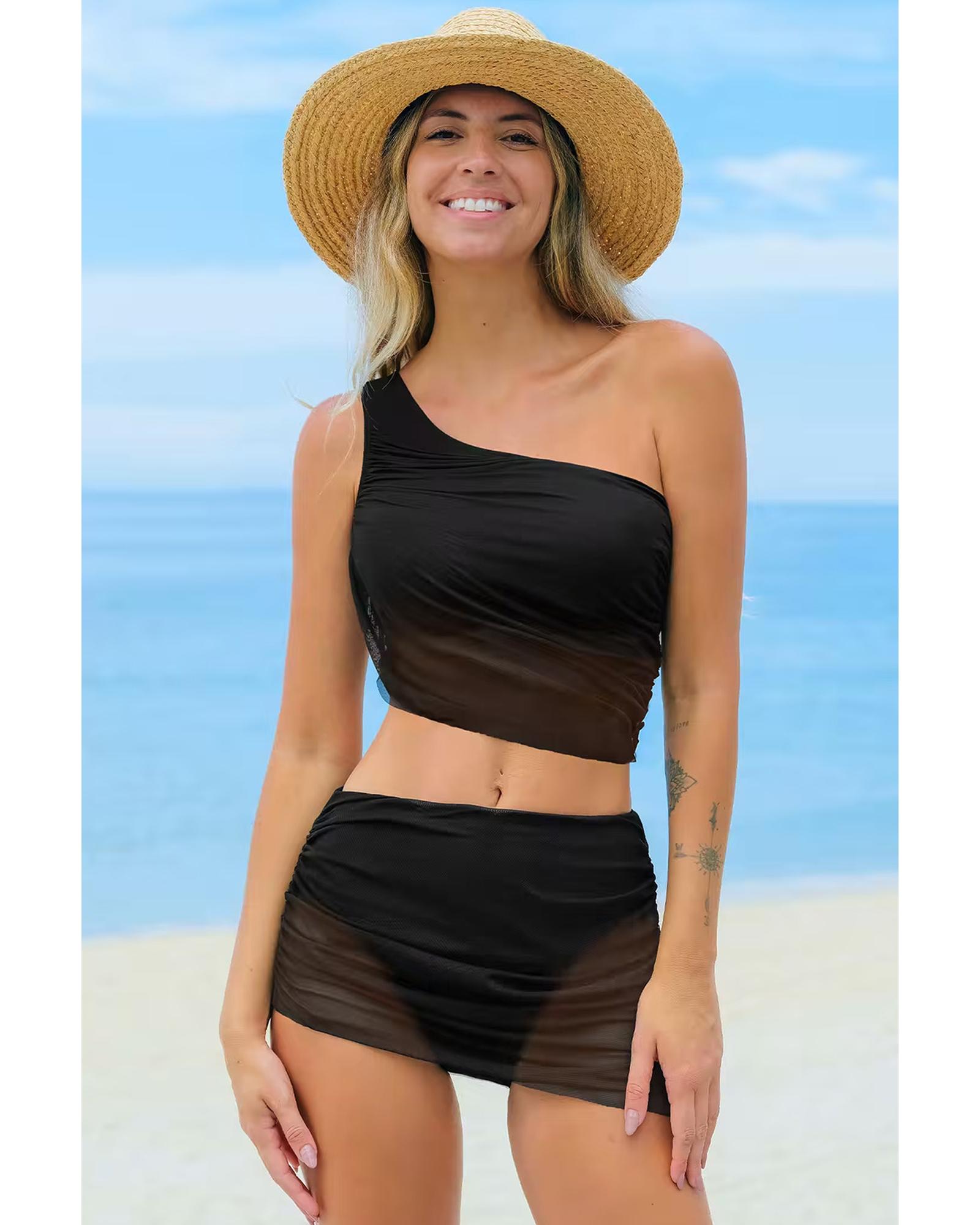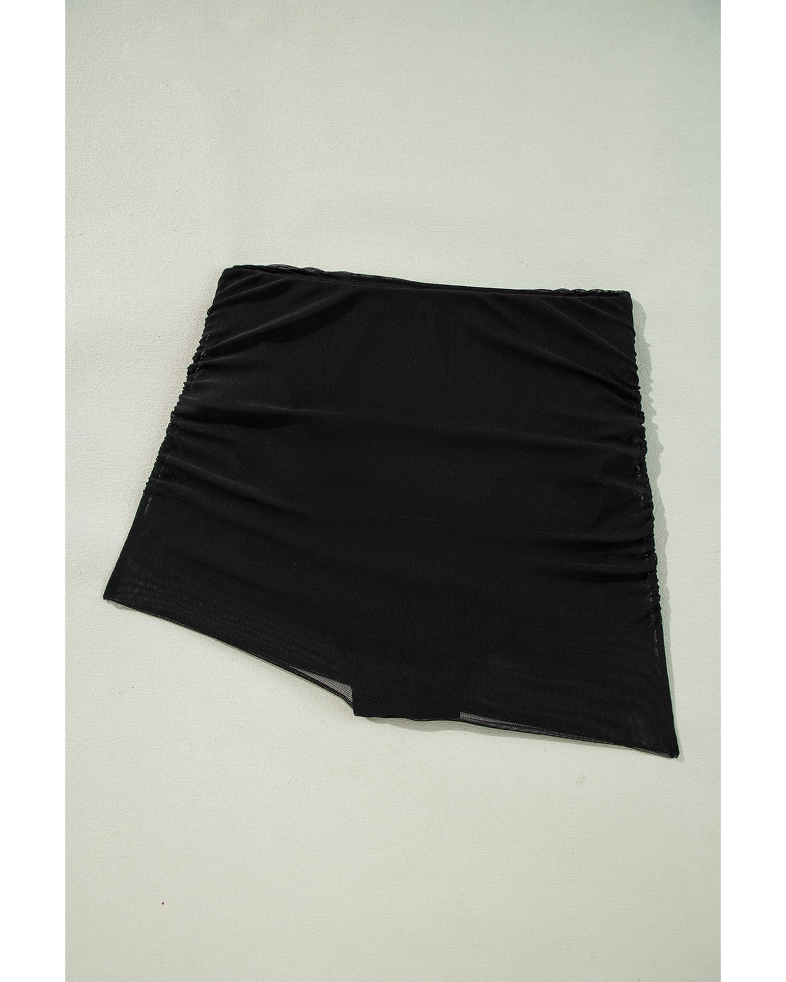 Black Pleated Mesh One Shoulder Bikini Top and Skirts Set – L