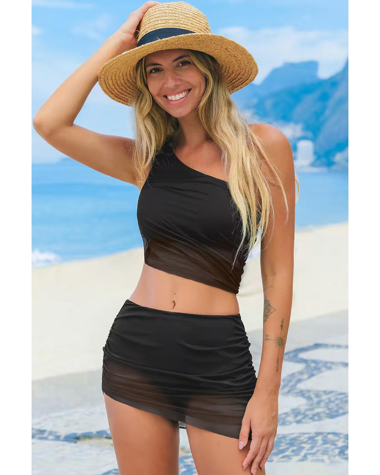 Black Pleated Mesh One Shoulder Bikini Top and Skirts Set – XL