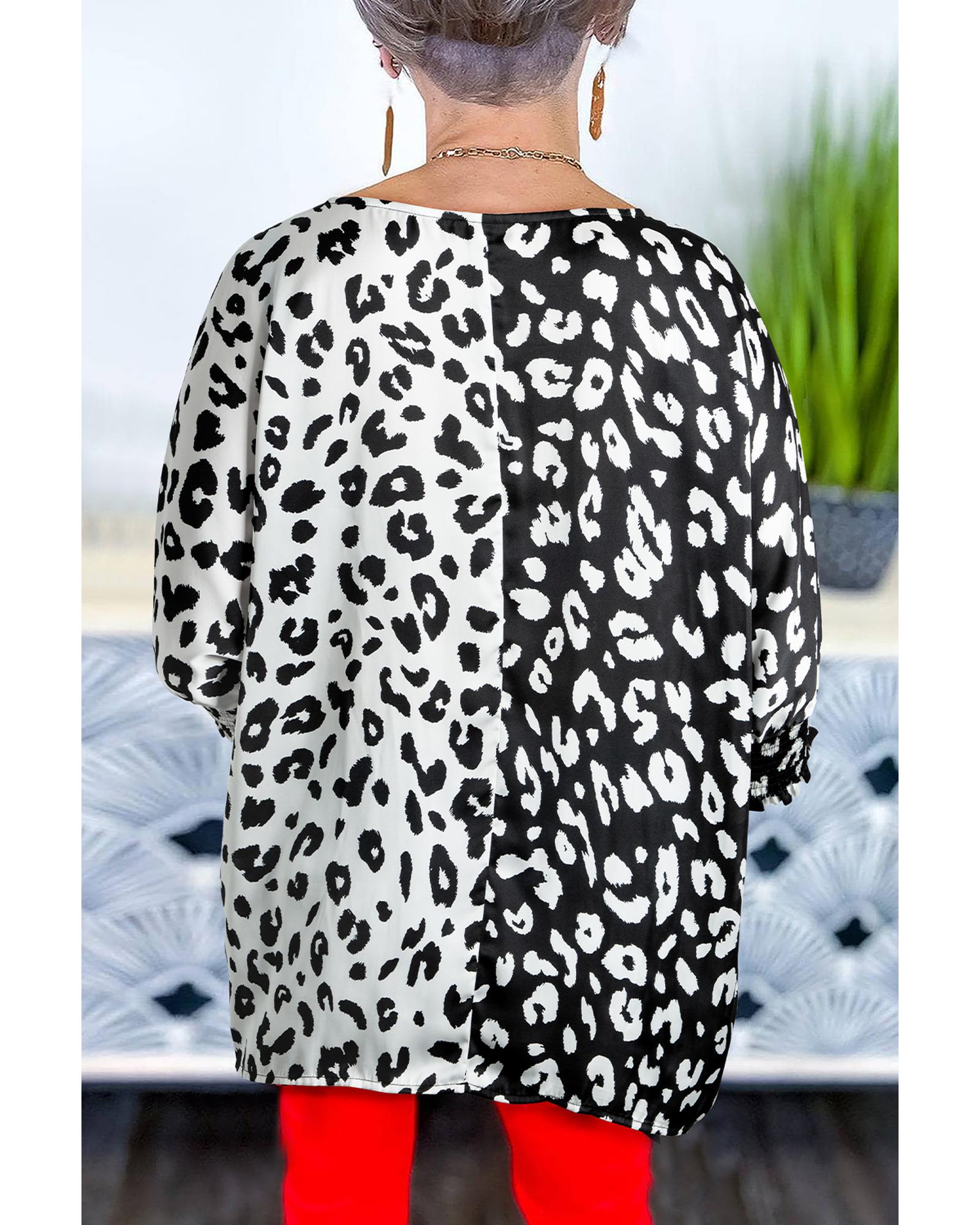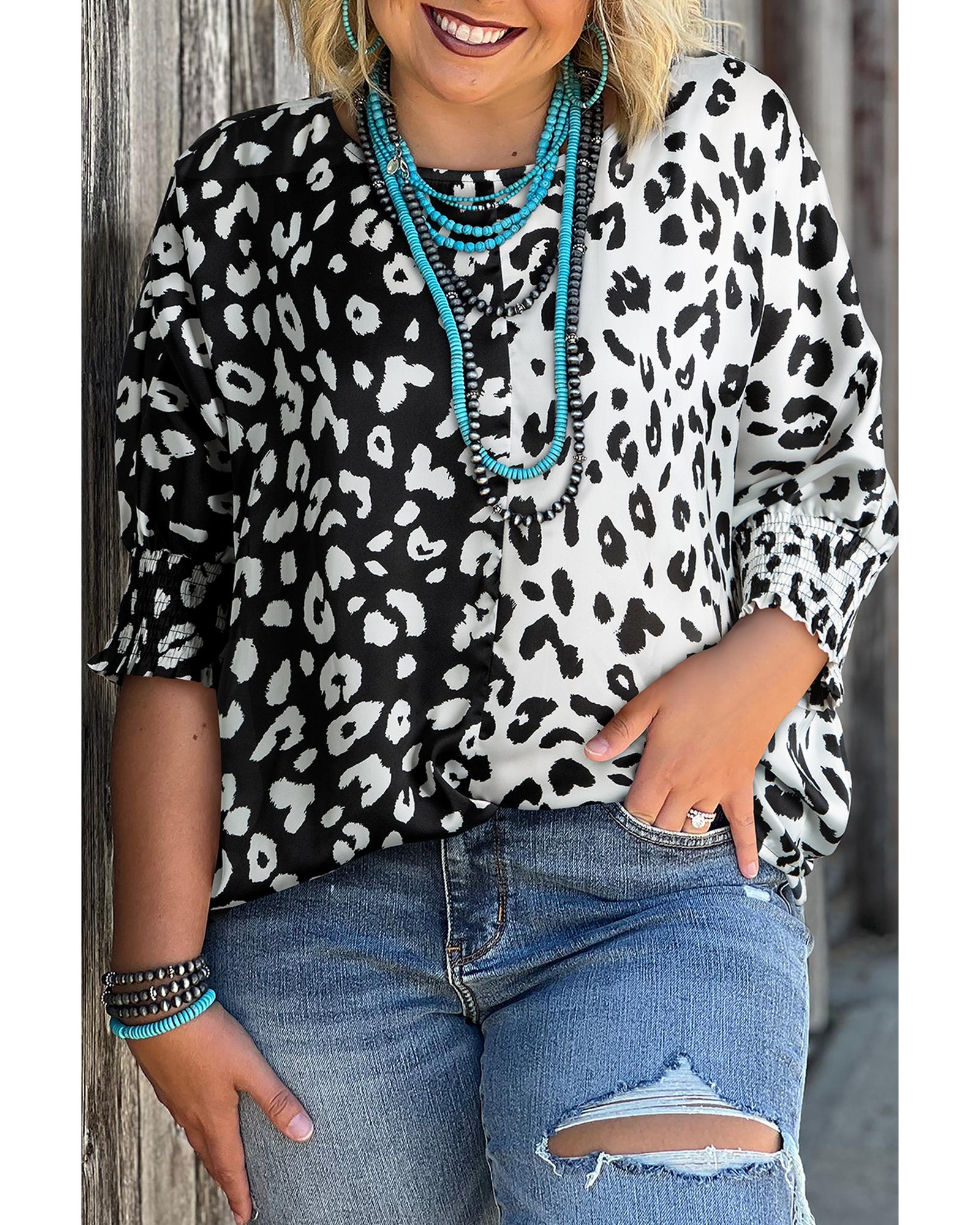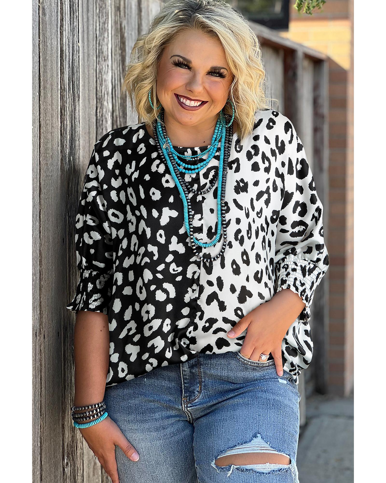 Black Plus Size Contrast Leopard Half Sleeve Blouse – 2X