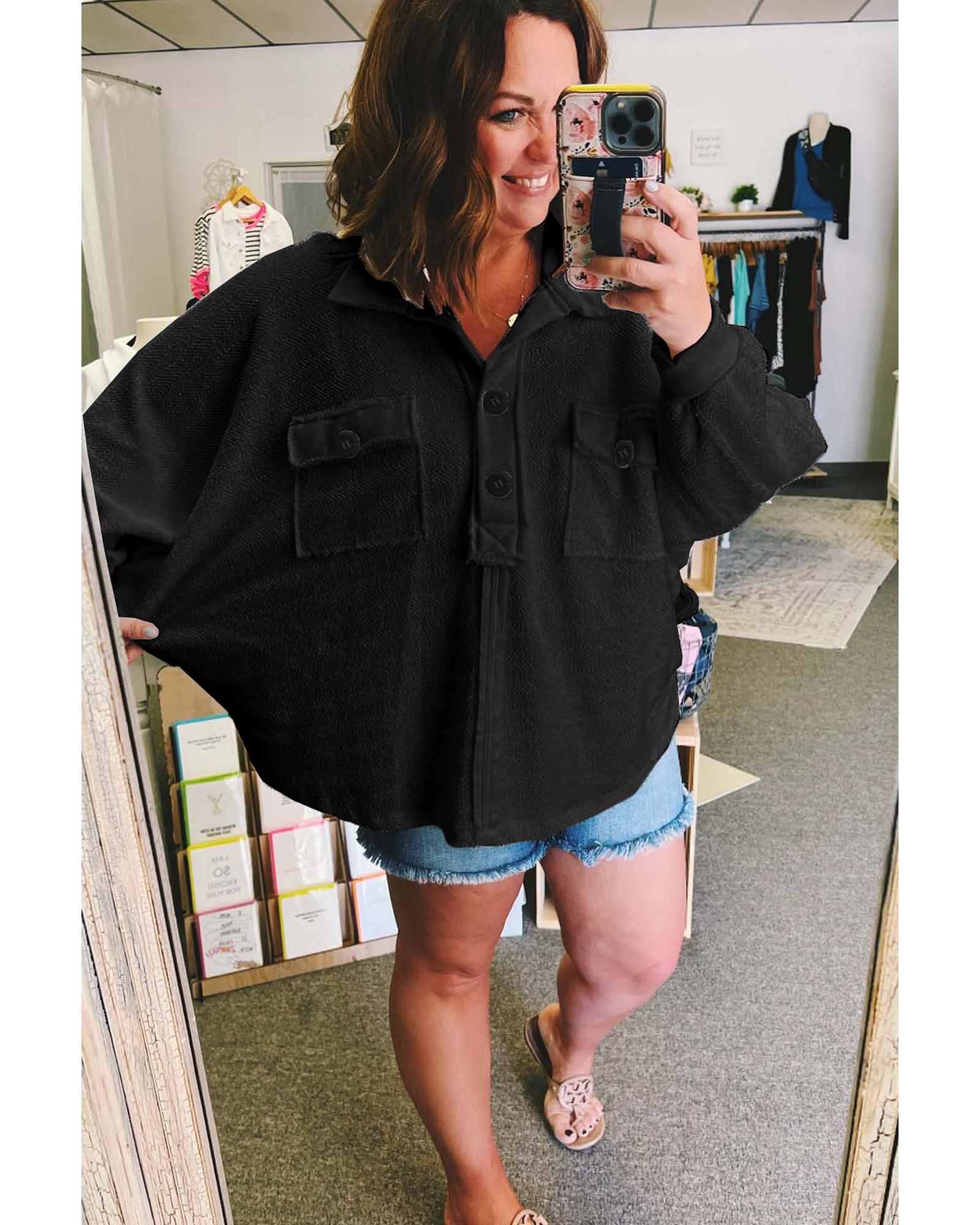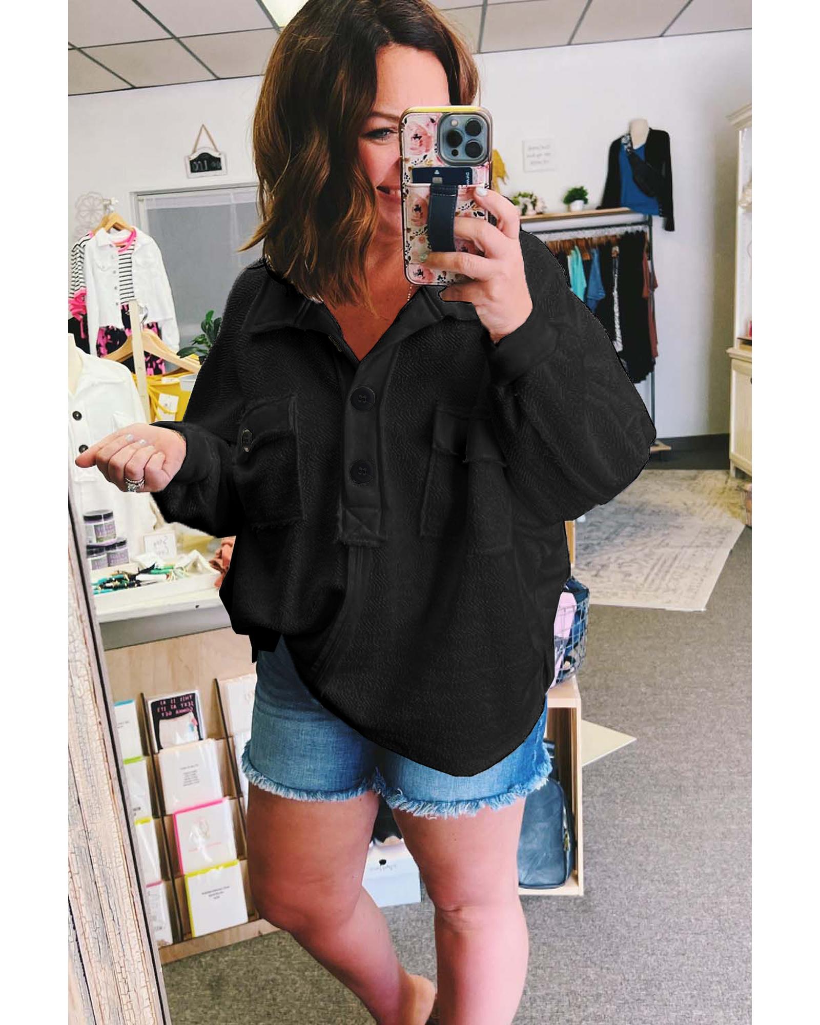 Black Plus Size Long Sleeve Flap Pocket Henley Top – 1X